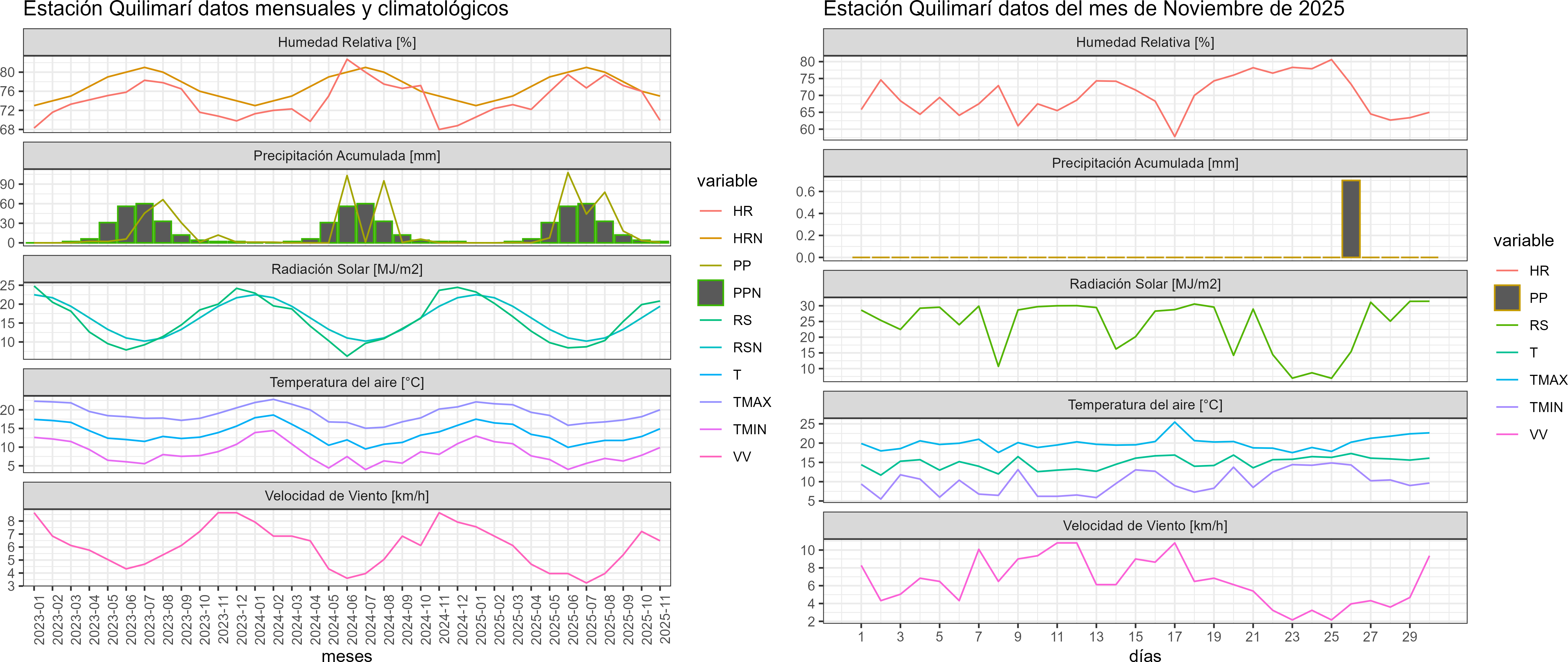 La estación Quilimarí corresponde al distrito agroclimático 4-1. Para este distrito climático la temperatura mínima, media y máxima climatológicas alcanzan los 9.2°C, 14.6°C y 20°C respectivamente. Por su parte, respecto a las temperaturas medidas durante el mes de noviembre en la estación: la temperatura mínima alcanzo los 9.9°C (0.7°C sobre la climatológica), la temperatura media 14.9°C (0.3°C sobre la climatológica) y la temperatura máxima llegó a los 20°C (Igual la climatológico). En el mes de noviembre se registró una pluviometría de 0.7 mm, lo cual representa un 70% con respecto al mismo mes de un año normal. De enero a noviembre se ha registrado un total acumulado de 259.8 mm, en circunstancias que un año normal registraría a la fecha 230 mm, lo que representa un superávit de 13%. A la misma fecha, durante el año 2024 la precipitación alcanzaba los 0 mm.