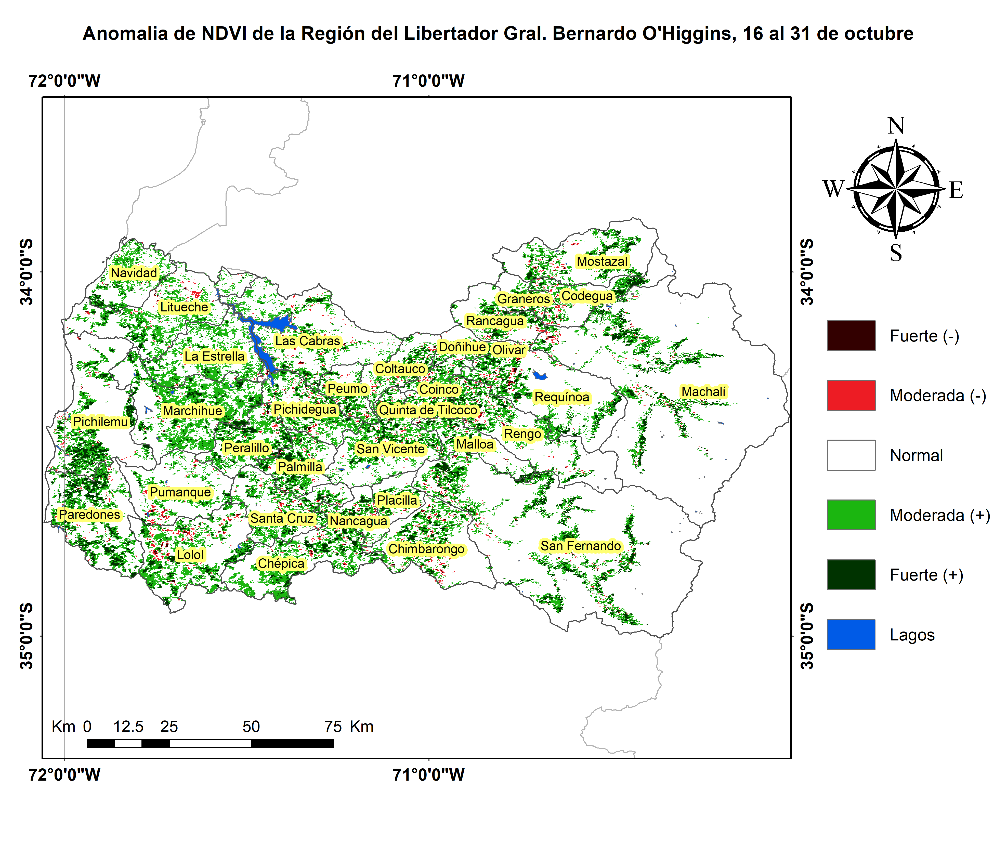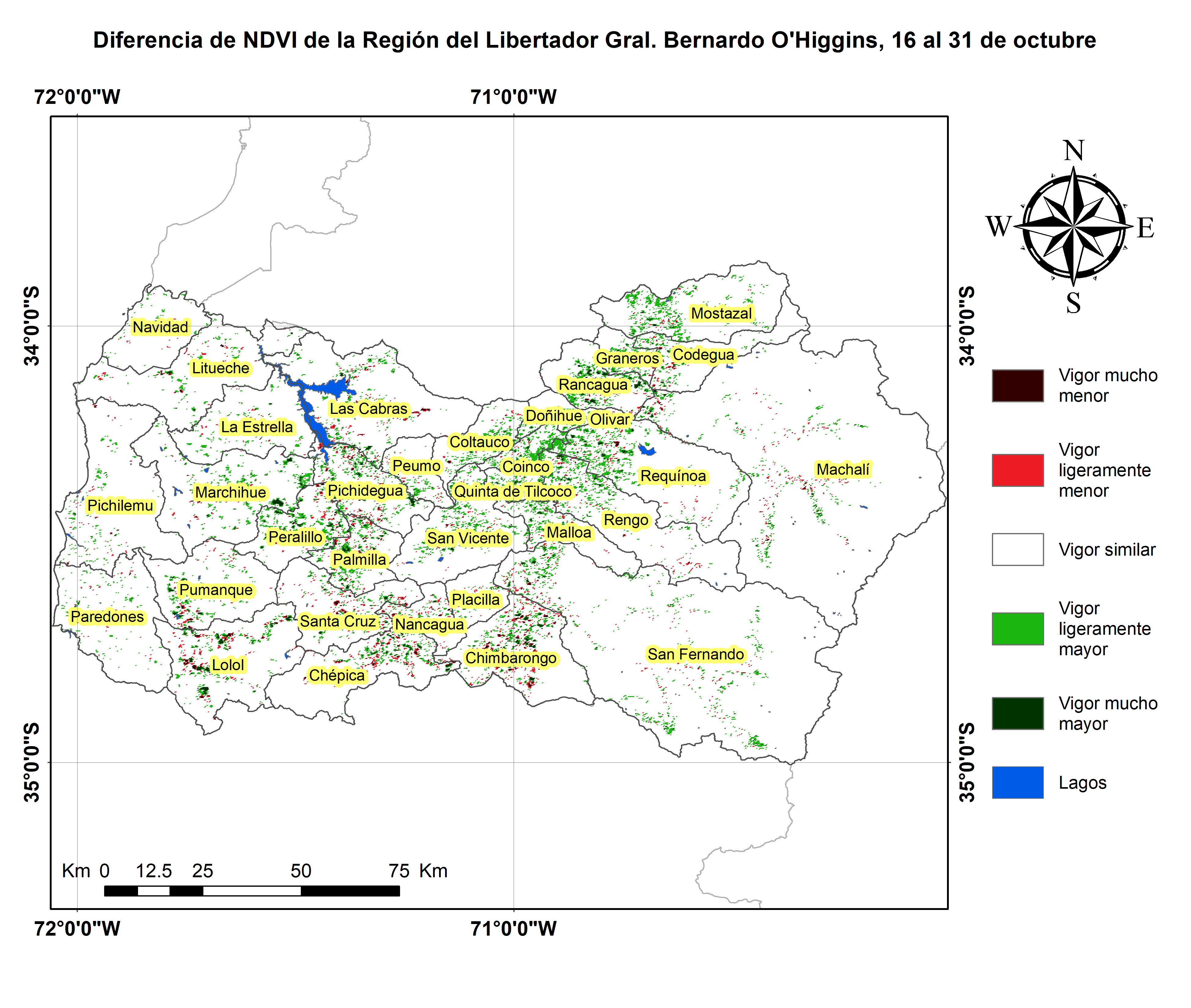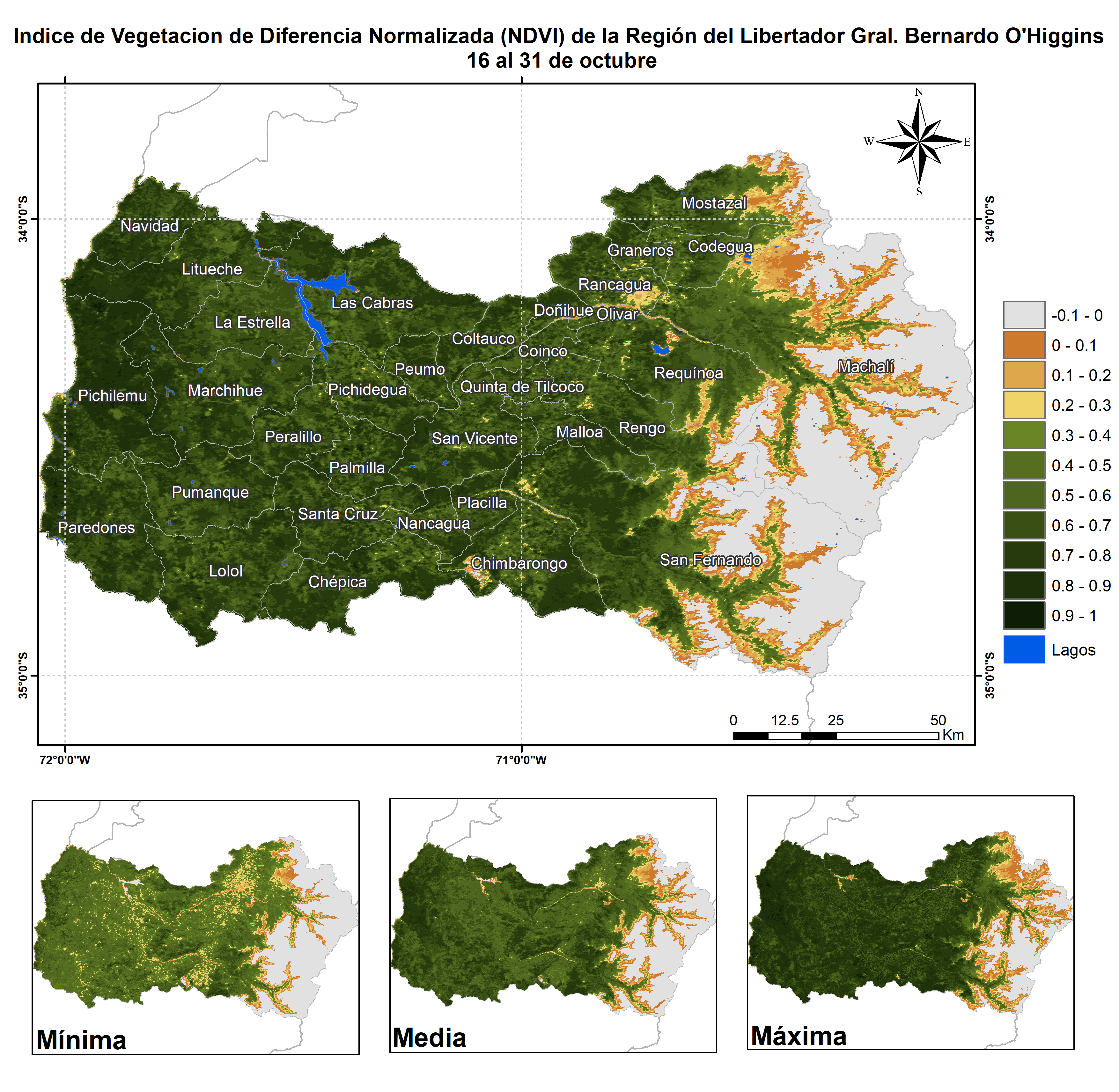 Respecto de la respuesta fisiológica de las plantas al efecto del clima, las imágenes satelitales reflejan la magnitud del crecimiento o disminución de la cobertura vegetal en esta época del año mediante el índice de vegetación NDVI (Desviación Normalizada del Índice de Vegetación).