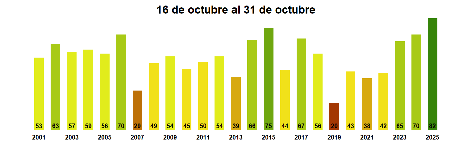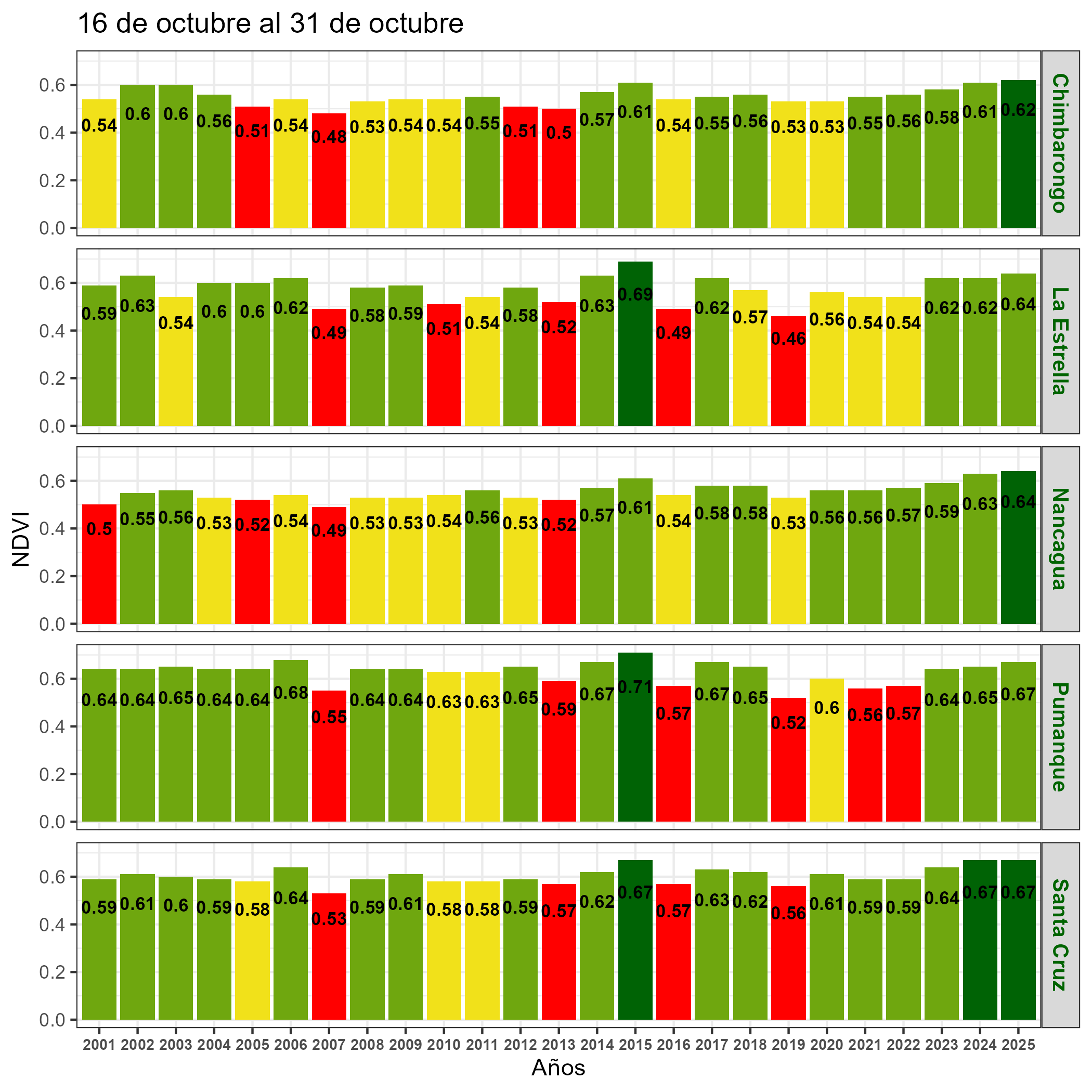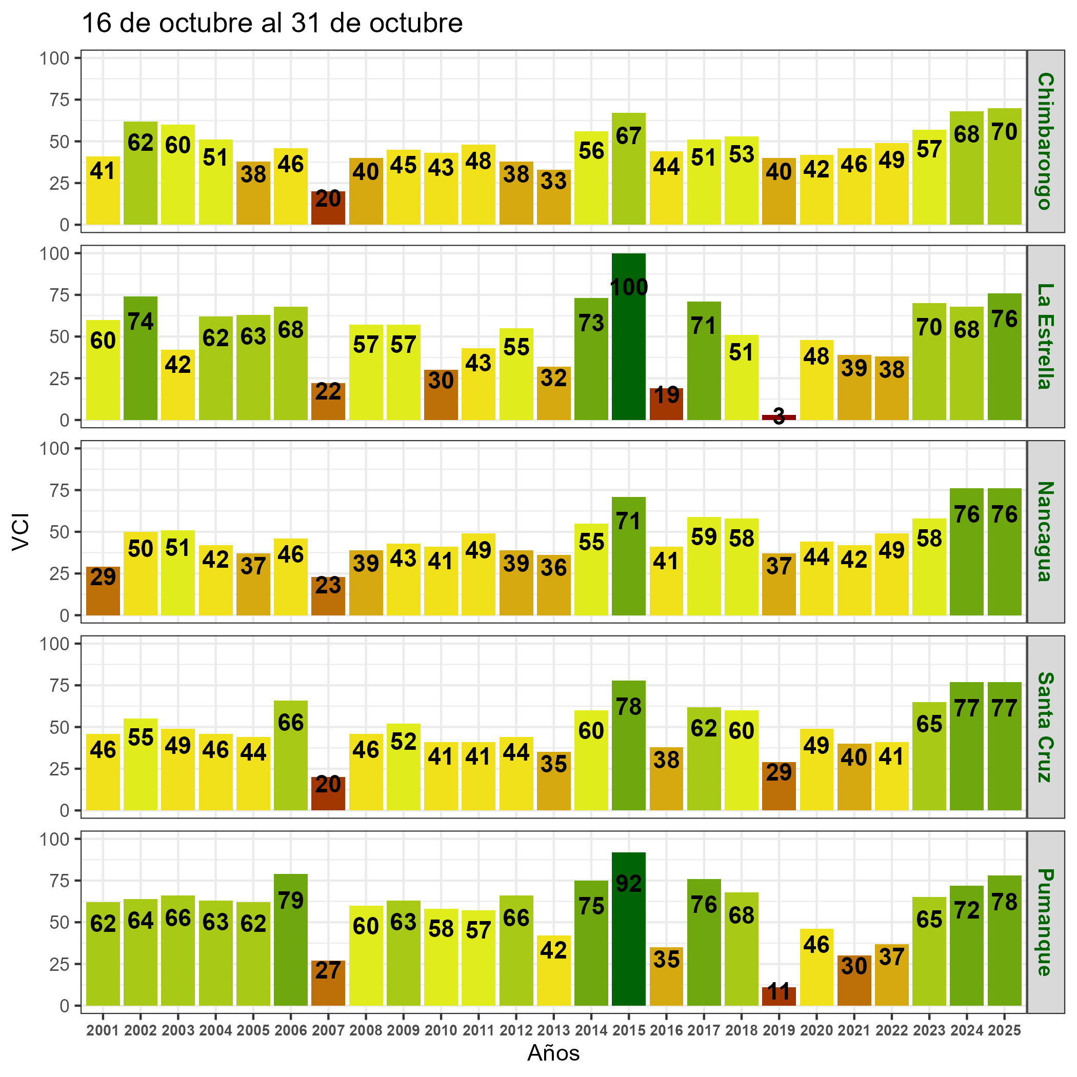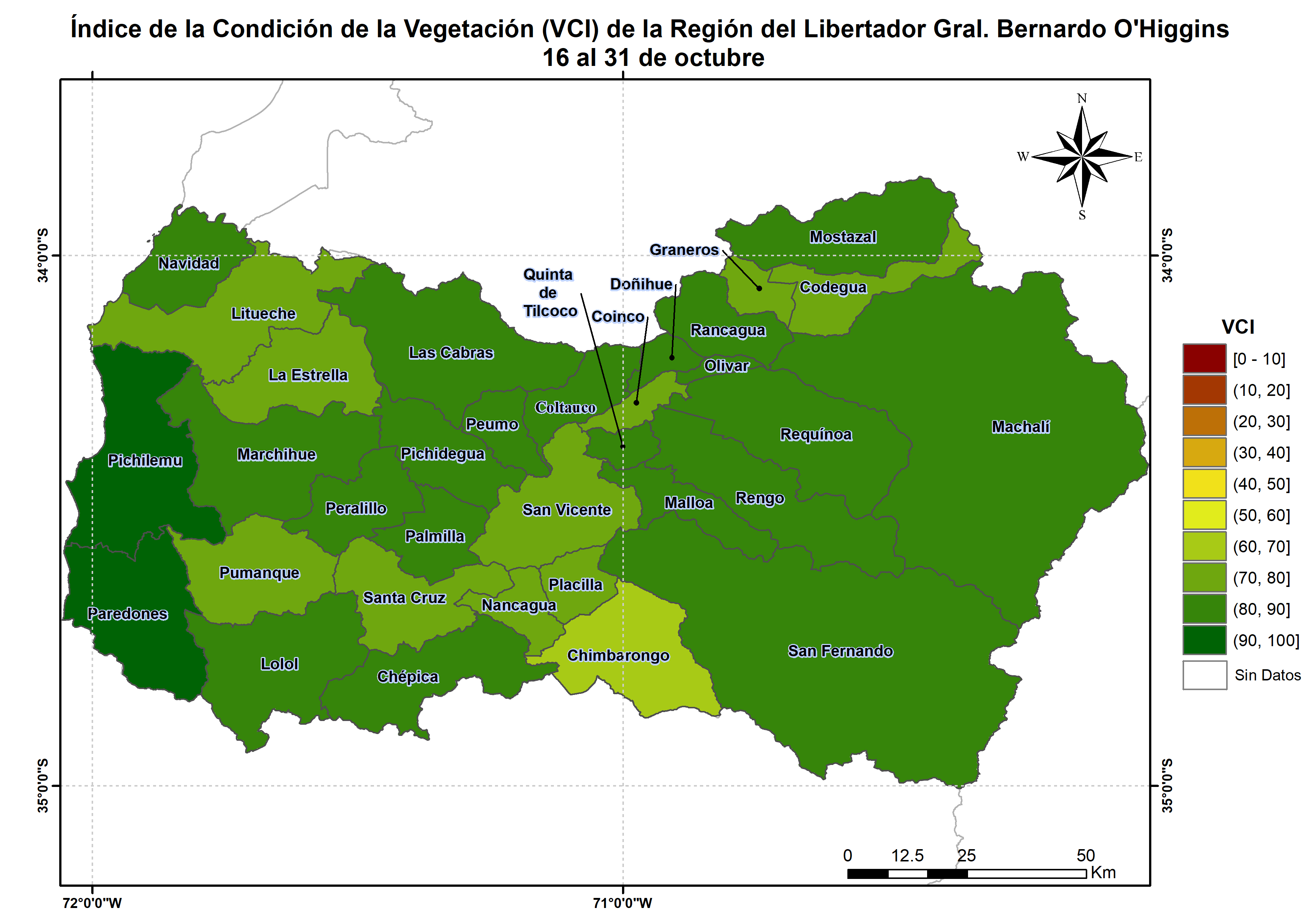 En términos globales la Región presentó un valor mediano de VCI de 82% para el período comprendido desde el 16 al 31 de octubre. A igual período del año pasado presentaba un VCI de 70% (Fig. 1). De acuerdo a la Tabla 1 la Región de O`Higgins, en términos globales presenta una condición Favorable.