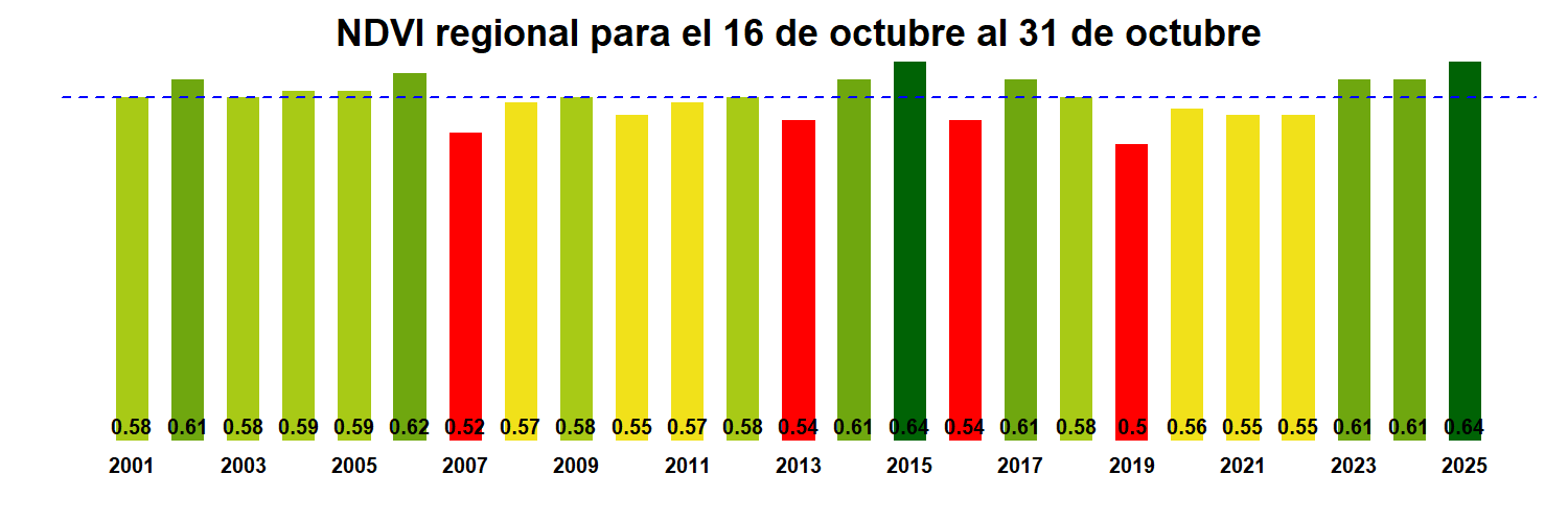Para esta quincena se observa un NDVI promedio regional de 0.64 mientras el año pasado había sido de 0.61. El valor promedio histórico para esta región, en este período del año es de 0.58.