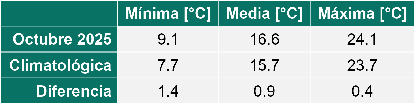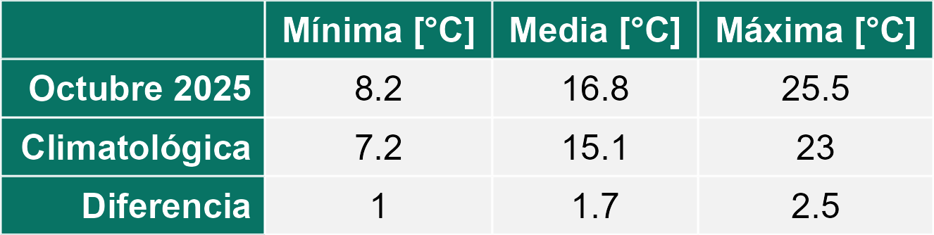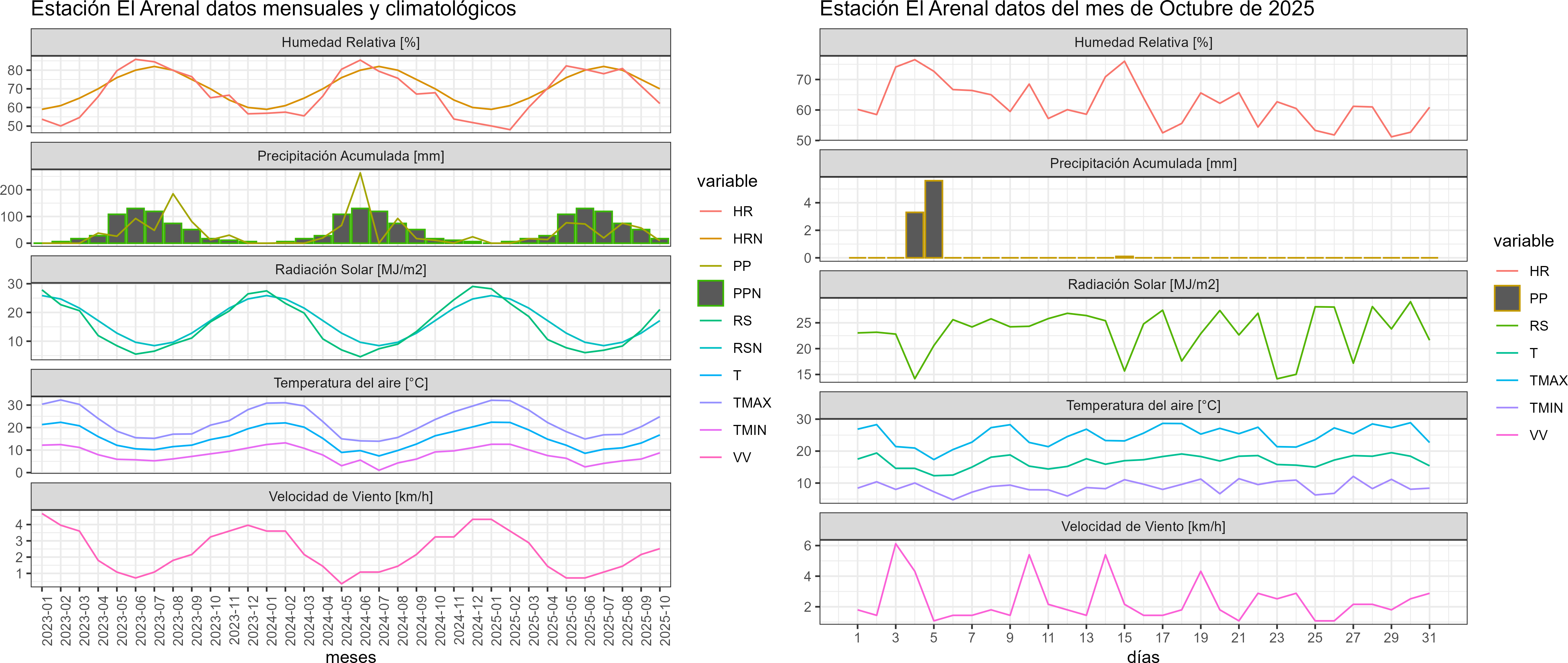 La estación El Arenal corresponde al distrito agroclimático 6-2. Para este distrito climático la temperatura mínima, media y máxima climatológicas alcanzan los 7.5°C, 15.5°C y 23.4°C respectivamente. Por su parte, respecto a las temperaturas medidas durante el mes de octubre en la estación: la temperatura mínima alcanzo los 8.8°C (1.3°C sobre la climatológica), la temperatura media 16.7°C (1.2°C sobre la climatológica) y la temperatura máxima llegó a los 24.8°C (1.4°C sobre la climatológica). En el mes de octubre se registró una pluviometría de 9 mm, lo cual representa un 34.6% con respecto al mismo mes de un año normal. De enero a octubre se ha registrado un total acumulado de 339.5 mm, en circunstancias que un año normal registraría a la fecha 487 mm, lo que representa un déficit de 30.3%. A la misma fecha, durante el año 2024 la precipitación alcanzaba los 10.6 mm.