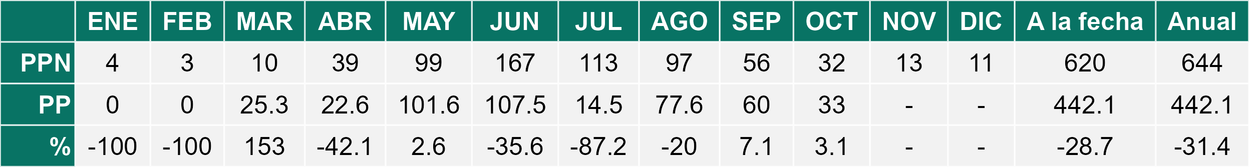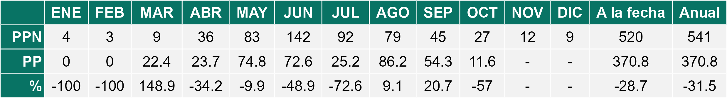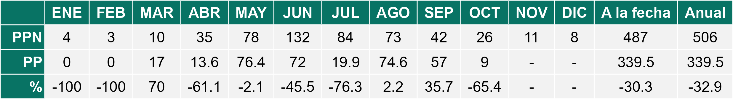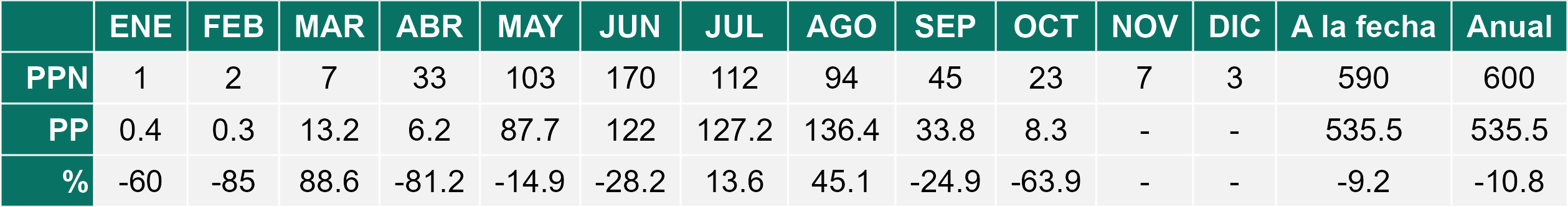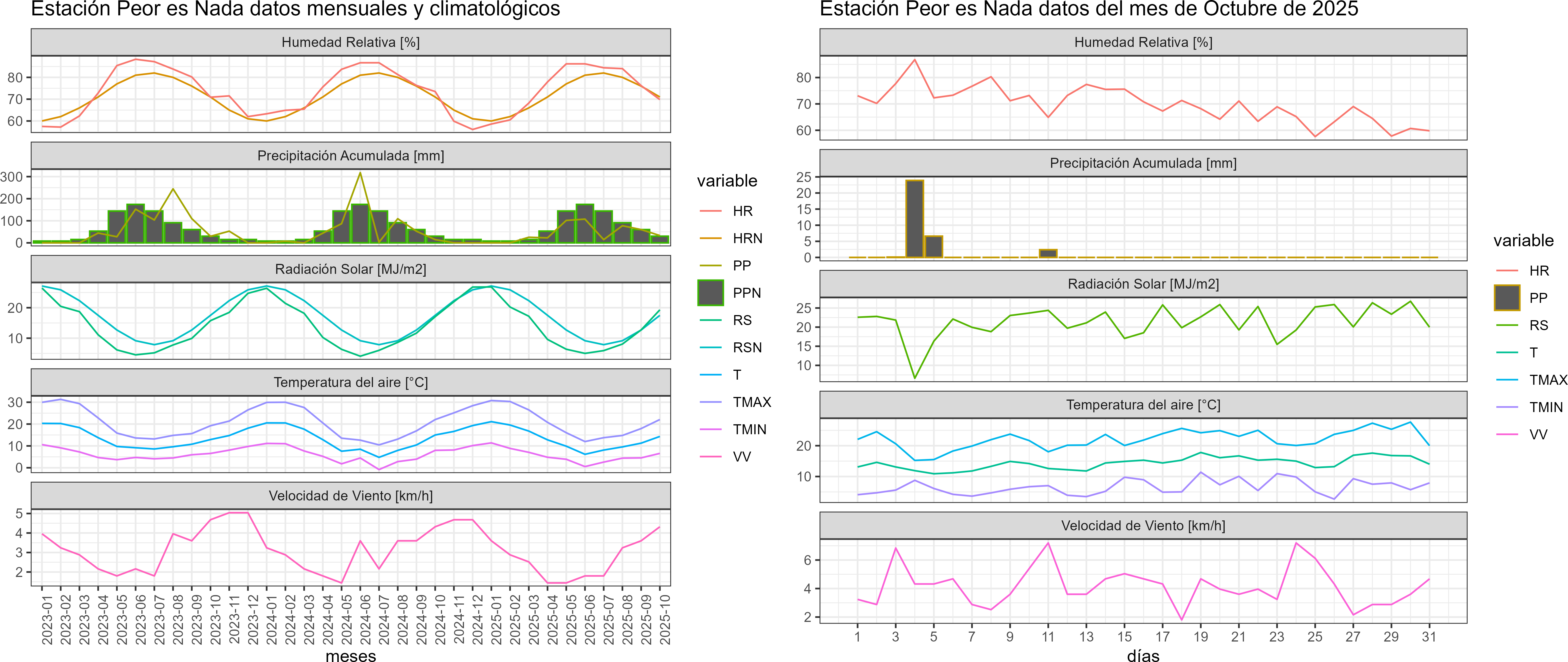 La estación Peor es Nada corresponde al distrito agroclimático 6-7-4. Para este distrito climático la temperatura mínima, media y máxima climatológicas alcanzan los 7.4°C, 15.6°C y 23.8°C respectivamente. Por su parte, respecto a las temperaturas medidas durante el mes de octubre en la estación: la temperatura mínima alcanzo los 6.6°C (-0.8°C bajo la climatológica), la temperatura media 14.3°C (-1.3°C bajo la climatológica) y la temperatura máxima llegó a los 22.1°C (-1.7°C bajo la climatológica). En el mes de octubre se registró una pluviometría de 33 mm, lo cual representa un 103.1% con respecto al mismo mes de un año normal. De enero a octubre se ha registrado un total acumulado de 442.1 mm, en circunstancias que un año normal registraría a la fecha 620 mm, lo que representa un déficit de 28.7%. A la misma fecha, durante el año 2024 la precipitación alcanzaba los 14.6 mm.