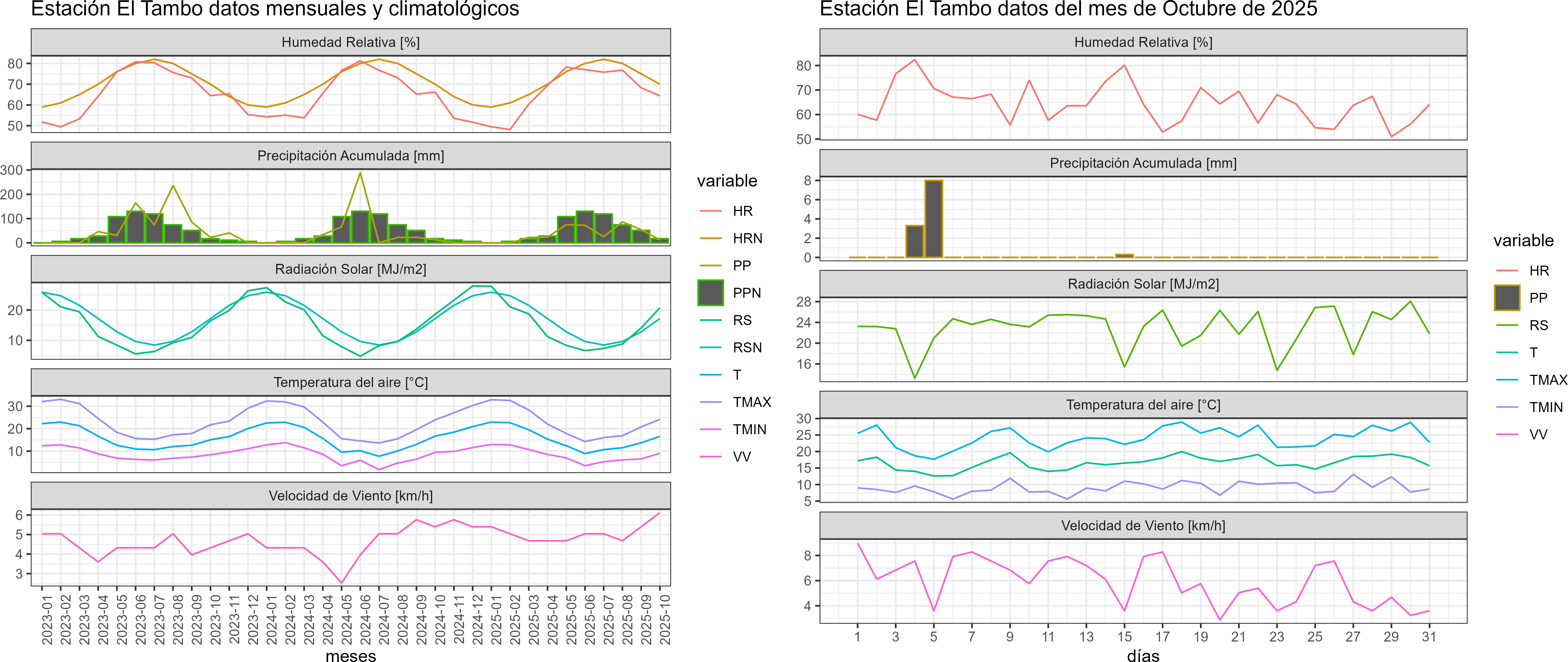 La estación El Tambo corresponde al distrito agroclimático 6-2. Para este distrito climático la temperatura mínima, media y máxima climatológicas alcanzan los 7.7°C, 15.7°C y 23.7°C respectivamente. Por su parte, respecto a las temperaturas medidas durante el mes de octubre en la estación: la temperatura mínima alcanzo los 9.1°C (1.4°C sobre la climatológica), la temperatura media 16.6°C (0.9°C sobre la climatológica) y la temperatura máxima llegó a los 24.1°C (0.4°C sobre la climatológica). En el mes de octubre se registró una pluviometría de 11.6 mm, lo cual representa un 43% con respecto al mismo mes de un año normal. De enero a octubre se ha registrado un total acumulado de 370.8 mm, en circunstancias que un año normal registraría a la fecha 520 mm, lo que representa un déficit de 28.7%. A la misma fecha, durante el año 2024 la precipitación alcanzaba los 12.3 mm.