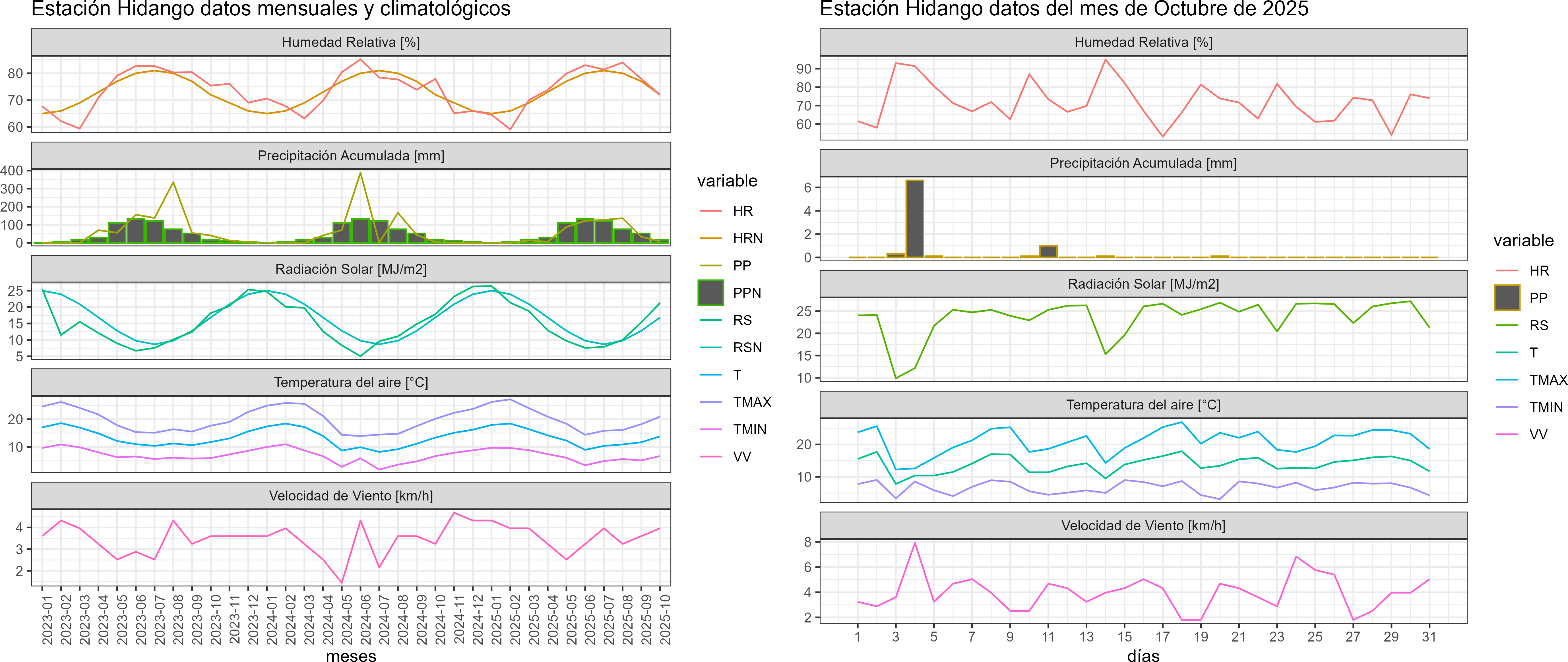 La estación Hidango corresponde al distrito agroclimático 5-6-1. Para este distrito climático la temperatura mínima, media y máxima climatológicas alcanzan los 5.6°C, 12.6°C y 19.7°C respectivamente. Por su parte, respecto a las temperaturas medidas durante el mes de octubre en la estación: la temperatura mínima alcanzo los 6.7°C (1.1°C sobre la climatológica), la temperatura media 13.8°C (1.2°C sobre la climatológica) y la temperatura máxima llegó a los 20.9°C (1.2°C sobre la climatológica). En el mes de octubre se registró una pluviometría de 8.3 mm, lo cual representa un 36.1% con respecto al mismo mes de un año normal. De enero a octubre se ha registrado un total acumulado de 535.5 mm, en circunstancias que un año normal registraría a la fecha 590 mm, lo que representa un déficit de 9.2%. A la misma fecha, durante el año 2024 la precipitación alcanzaba los 3.8 mm.