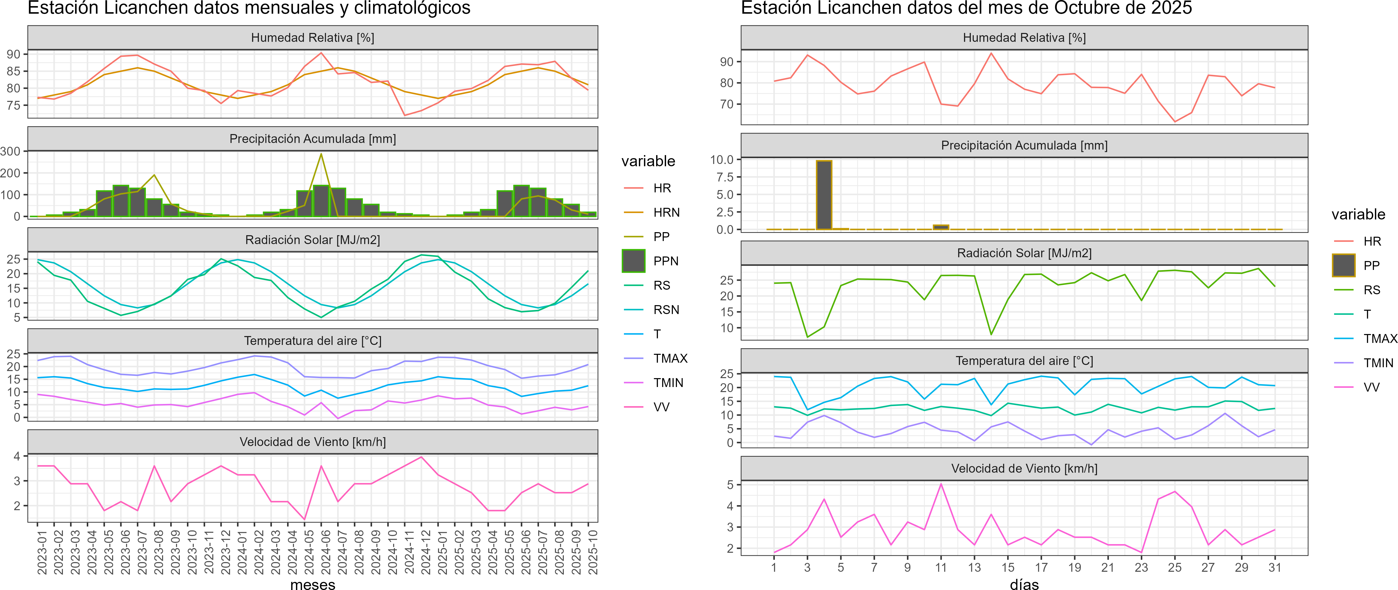 La estación Licanchen corresponde al distrito agroclimático 5-7-1. Para este distrito climático la temperatura mínima, media y máxima climatológicas alcanzan los 6.9°C, 12.6°C y 18.4°C respectivamente. Por su parte, respecto a las temperaturas medidas durante el mes de octubre en la estación: la temperatura mínima alcanzo los 4.3°C (-2.6°C bajo la climatológica), la temperatura media 12.5°C (-0.1°C bajo la climatológica) y la temperatura máxima llegó a los 20.8°C (2.4°C sobre la climatológica). En el mes de octubre se registró una pluviometría de 10.5 mm, lo cual representa un 55.3% con respecto al mismo mes de un año normal. De enero a octubre se ha registrado un total acumulado de 291.8 mm, en circunstancias que un año normal registraría a la fecha 521 mm, lo que representa un déficit de 44%. A la misma fecha, durante el año 2024 la precipitación alcanzaba los 0.1 mm.