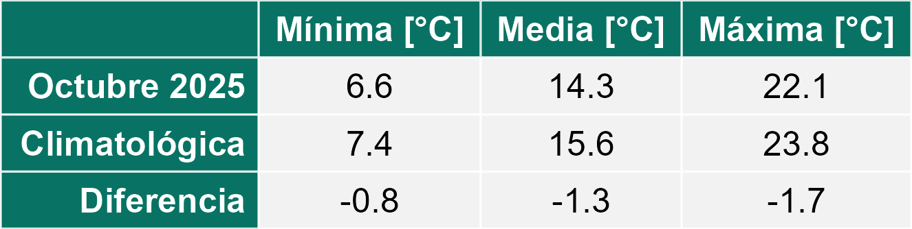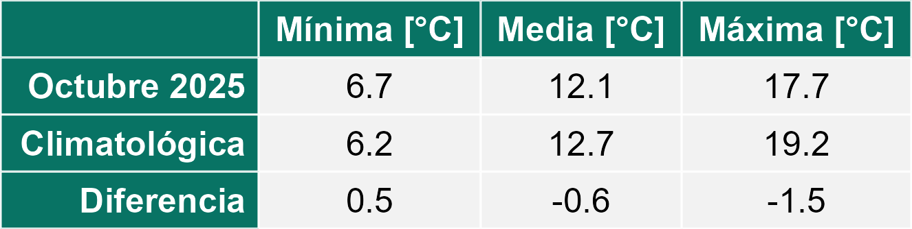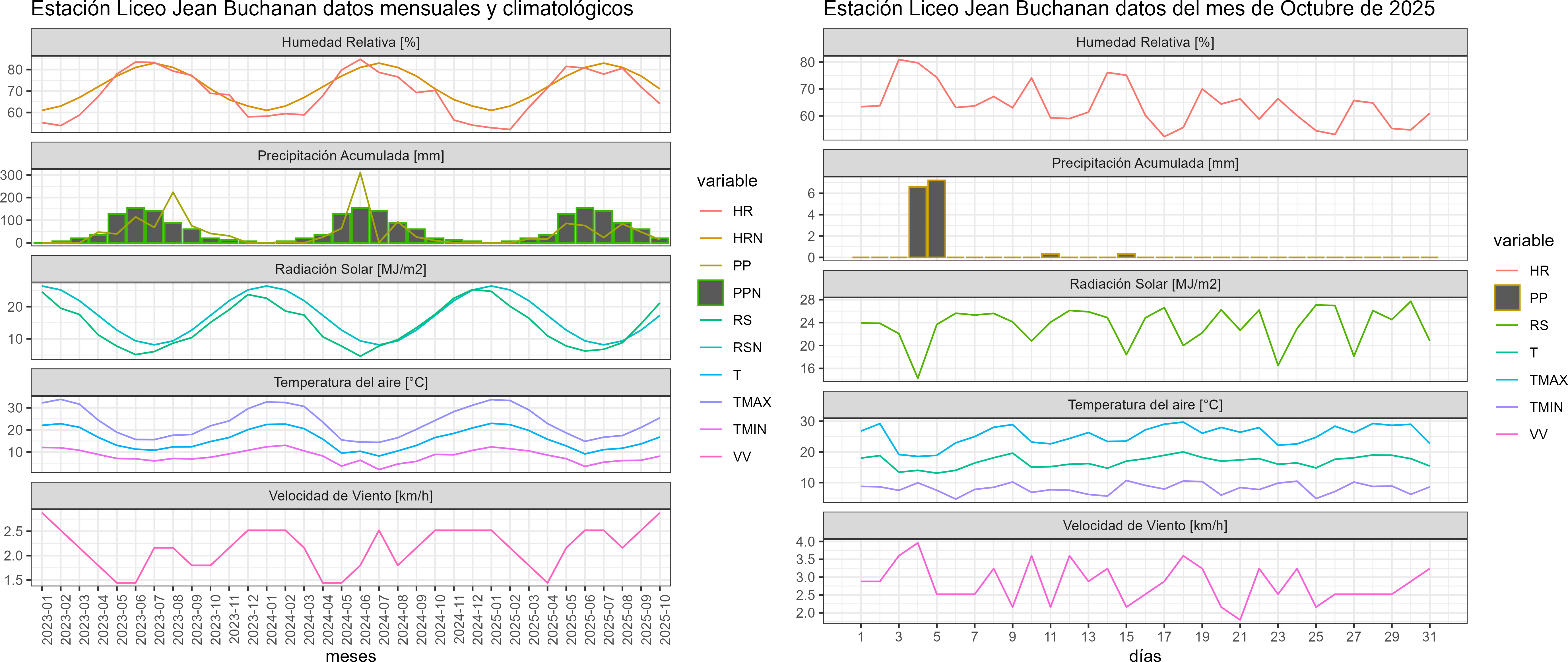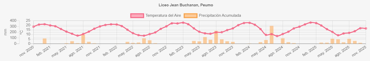 La estación Liceo Jean Buchanan corresponde al distrito agroclimático 6-1. Para este distrito climático la temperatura mínima, media y máxima climatológicas alcanzan los 7.2°C, 15.1°C y 23°C respectivamente. Por su parte, respecto a las temperaturas medidas durante el mes de octubre en la estación: la temperatura mínima alcanzo los 8.2°C (1°C sobre la climatológica), la temperatura media 16.8°C (1.7°C sobre la climatológica) y la temperatura máxima llegó a los 25.5°C (2.5°C sobre la climatológica). En el mes de octubre se registró una pluviometría de 14.4 mm, lo cual representa un 62.6% con respecto al mismo mes de un año normal. De enero a octubre se ha registrado un total acumulado de 367.2 mm, en circunstancias que un año normal registraría a la fecha 487 mm, lo que representa un déficit de 24.6%. A la misma fecha, durante el año 2024 la precipitación alcanzaba los 9.9 mm.