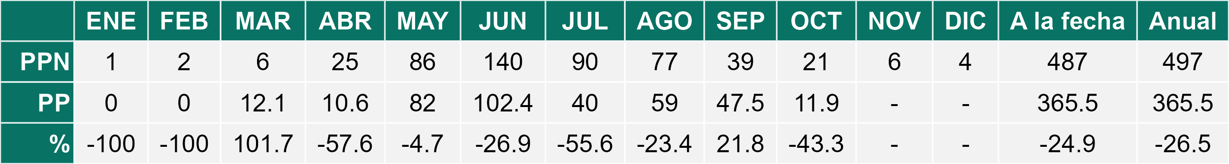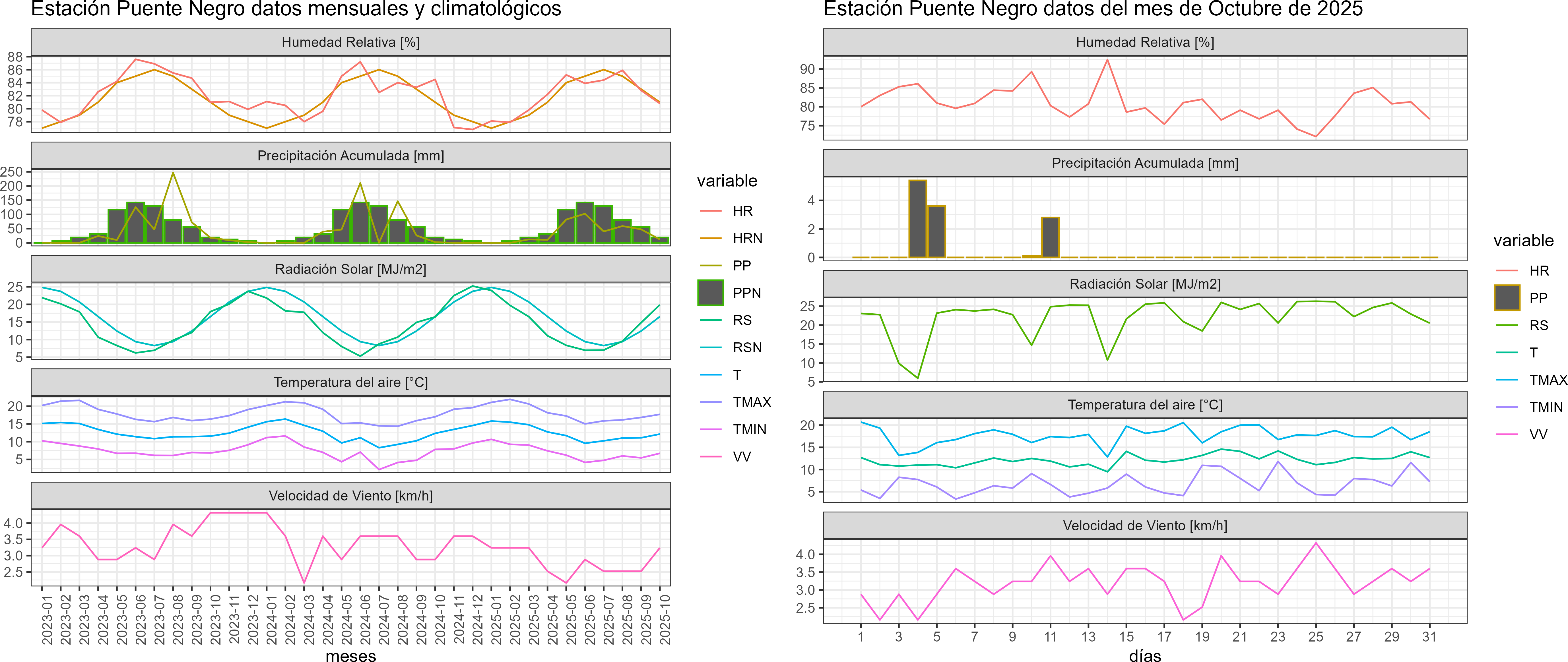 La estación Puente Negro corresponde al distrito agroclimático 5-7-1. Para este distrito climático la temperatura mínima, media y máxima climatológicas alcanzan los 6.2°C, 12.7°C y 19.2°C respectivamente. Por su parte, respecto a las temperaturas medidas durante el mes de octubre en la estación: la temperatura mínima alcanzo los 6.7°C (0.5°C sobre la climatológica), la temperatura media 12.1°C (-0.6°C bajo la climatológica) y la temperatura máxima llegó a los 17.7°C (-1.5°C bajo la climatológica). En el mes de octubre se registró una pluviometría de 11.9 mm, lo cual representa un 56.7% con respecto al mismo mes de un año normal. De enero a octubre se ha registrado un total acumulado de 365.5 mm, en circunstancias que un año normal registraría a la fecha 487 mm, lo que representa un déficit de 24.9%. A la misma fecha, durante el año 2024 la precipitación alcanzaba los 2.4 mm.