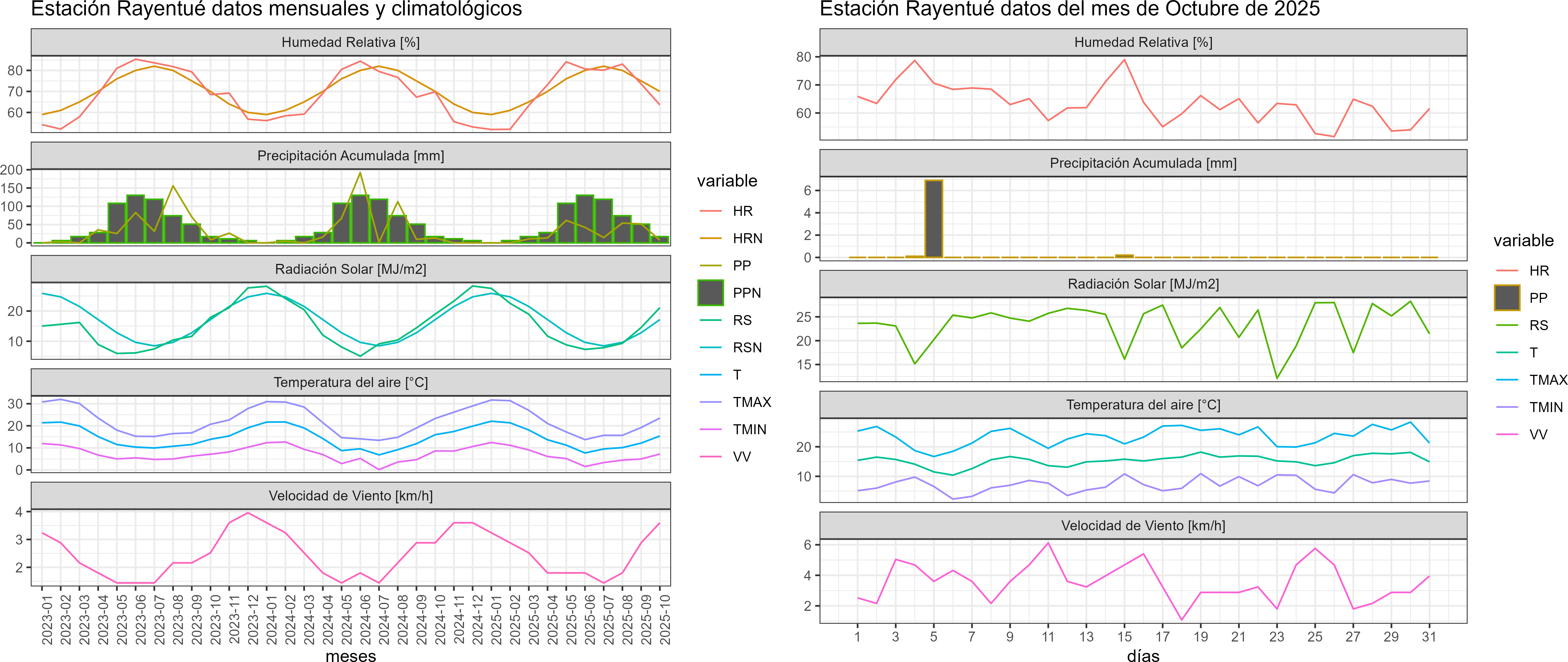 La estación Rayentué corresponde al distrito agroclimático 6-2. Para este distrito climático la temperatura mínima, media y máxima climatológicas alcanzan los 6.6°C, 14.9°C y 23.2°C respectivamente. Por su parte, respecto a las temperaturas medidas durante el mes de octubre en la estación: la temperatura mínima alcanzo los 7.2°C (0.6°C sobre la climatológica), la temperatura media 15.4°C (0.5°C sobre la climatológica) y la temperatura máxima llegó a los 23.5°C (0.3°C sobre la climatológica). En el mes de octubre se registró una pluviometría de 7.2 mm, lo cual representa un 23.2% con respecto al mismo mes de un año normal. De enero a octubre se ha registrado un total acumulado de 255.3 mm, en circunstancias que un año normal registraría a la fecha 541 mm, lo que representa un déficit de 52.8%. A la misma fecha, durante el año 2024 la precipitación alcanzaba los 13.1 mm.