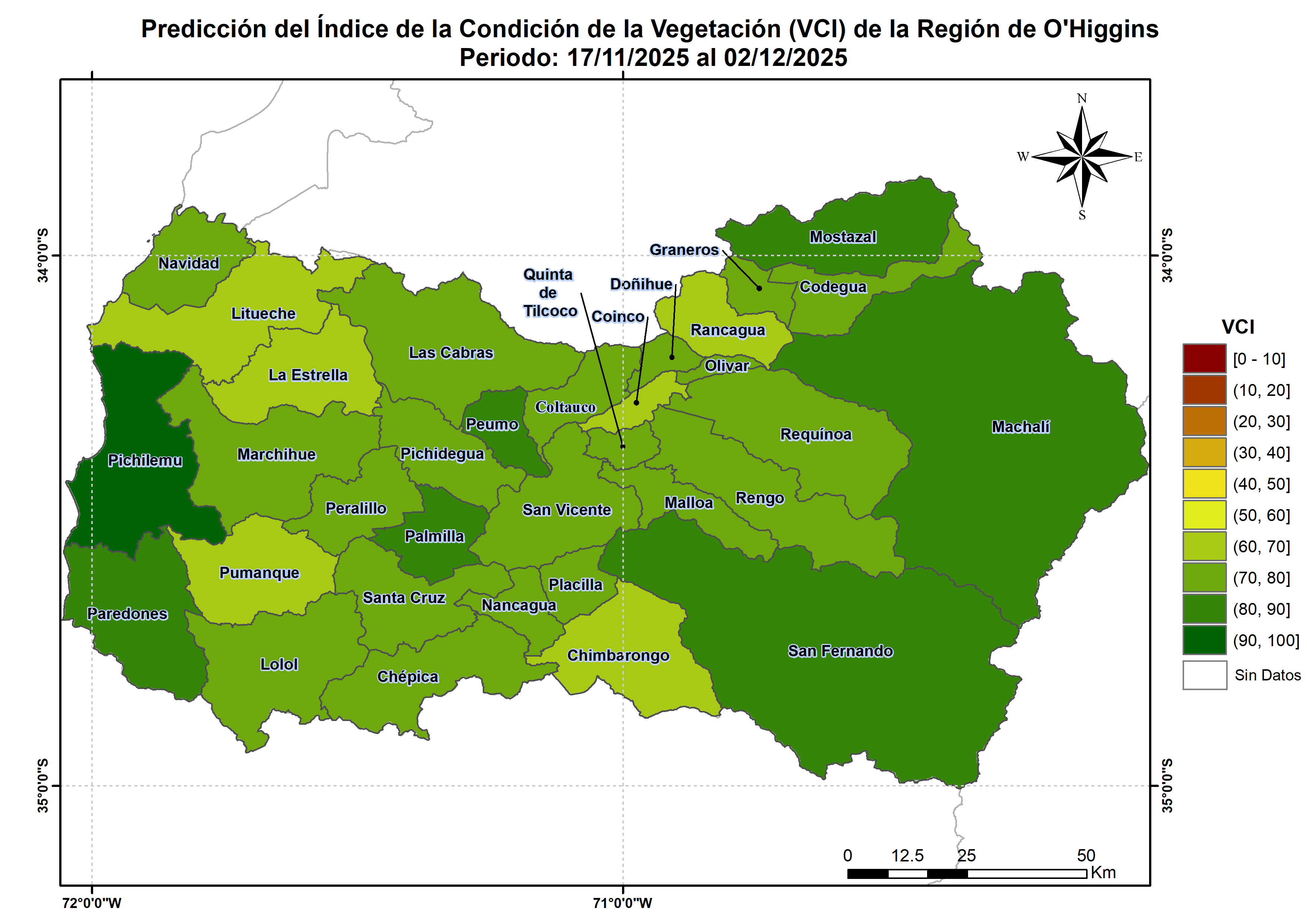 Las comunas que presentan los valores más bajos del índice VCI en la Región corresponden a Chimbarongo, La Estrella, Nancagua, Santa Cruz y Pumanque con 70, 76, 76, 77 y 78% de VCI respectivamente.