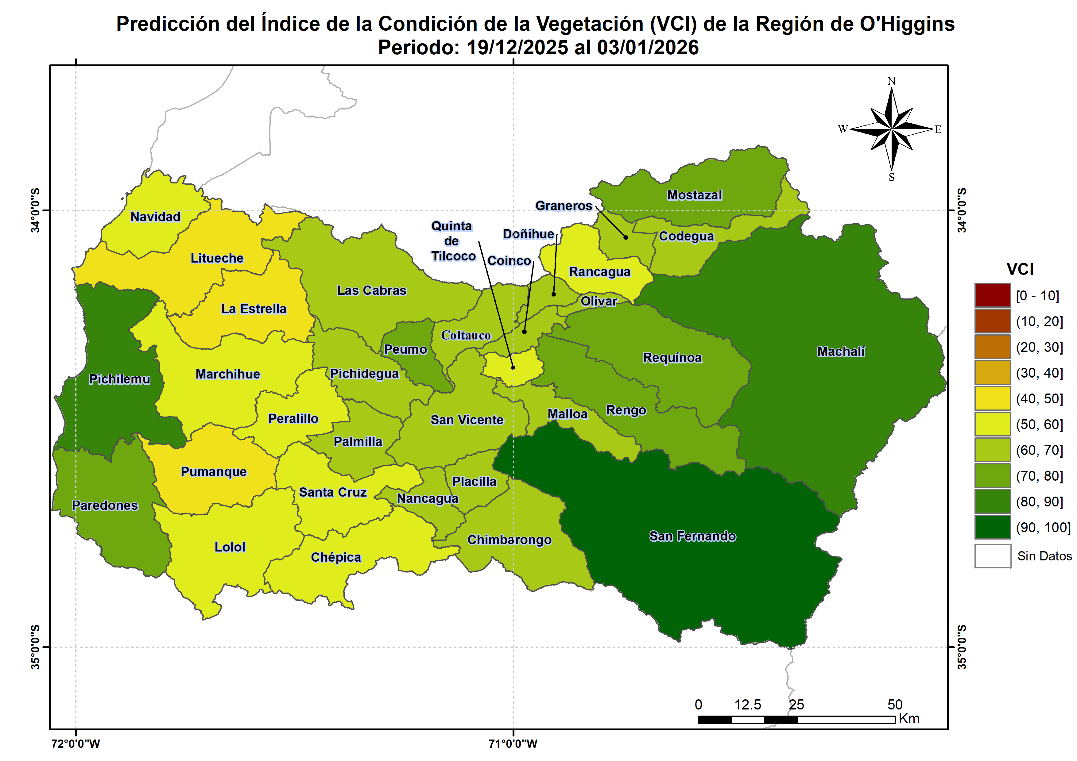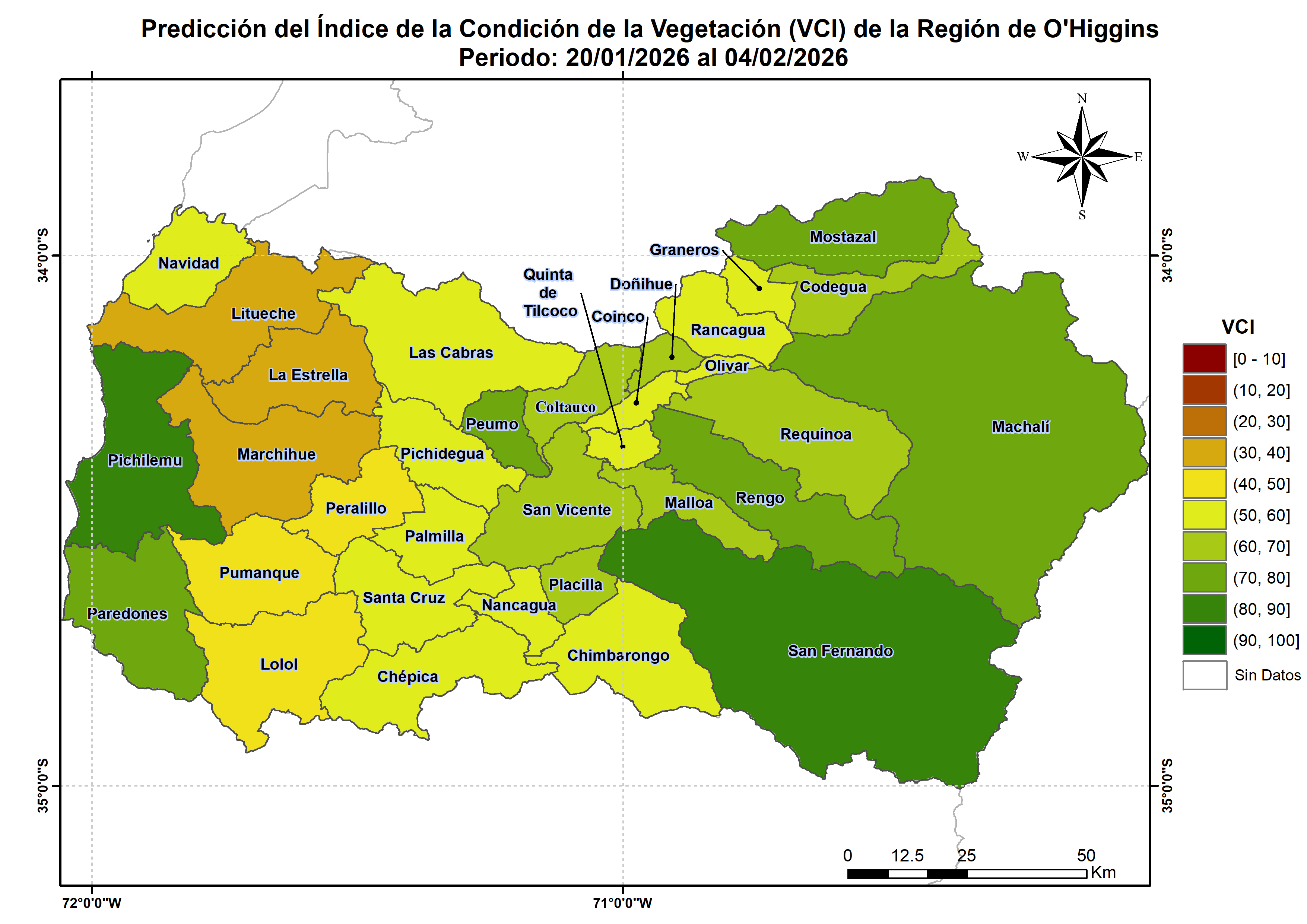 Para el monitoreo del estado de la vegetación en la Región se utilizó el índice de condición de la vegetación, VCI (Kogan, 1990, 1995). Este índice se encuentra entre valores de 0% a 100%. Valores bajo 40% se asocian a una condición desfavorable en la vegetación, siendo 0% la peor condición histórica y 100% la mejor (tabla 1).