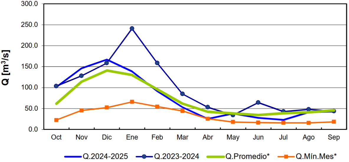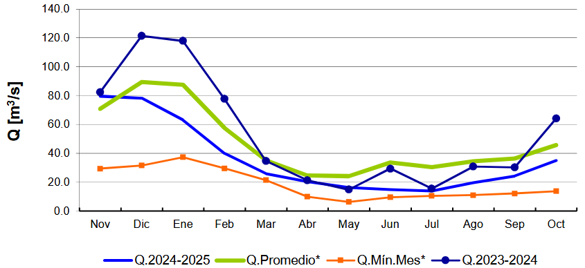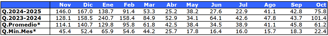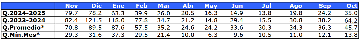 De la misma manera, en la estación Río Tinguiririca bajo Los Briones, el caudal reportado en octubre fue de 35,0 m3/s, un 23,4% inferior al promedio histórico (45,7 m3/s), y un 45,5% más bajo que el valor registrado en octubre 2024 (64,2 m3/s). En relación a septiembre 2025 (24,2 m3/s), se observó un aumento de 44,6%.