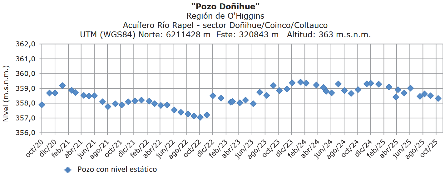 En el acuífero Río Rapel, sector Doñihue/Coinco/Coltauco, el pozo Doñihue mantiene la tendencia de estabilidad observada en los últimos meses, situándose en octubre 2025 en torno a 358,5 m.s.n.m., con una profundidad cercana a 4,5 m hasta el nivel del agua.