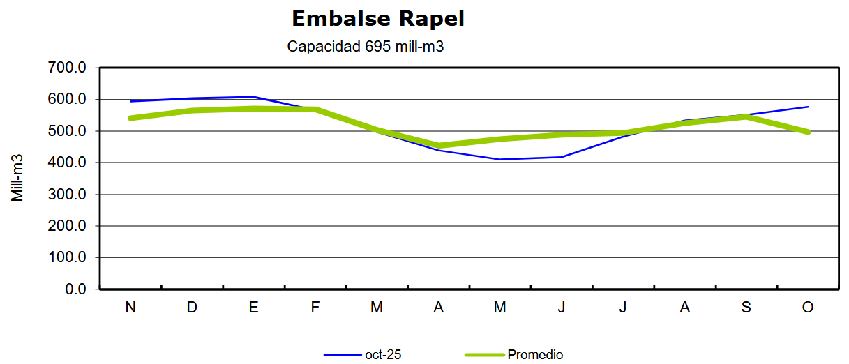 Finalmente, el Embalse Rapel alcanzó al 31 de octubre de 2025 un volumen de 575,9 millones de m³, equivalente al 83% de su capacidad máxima (695 millones de m³). Este nivel es 2,1% inferior al registrado en octubre 2024 (588,3 millones de m³) y se encuentra un 15,9% por encima del promedio histórico (497 millones de m³).
