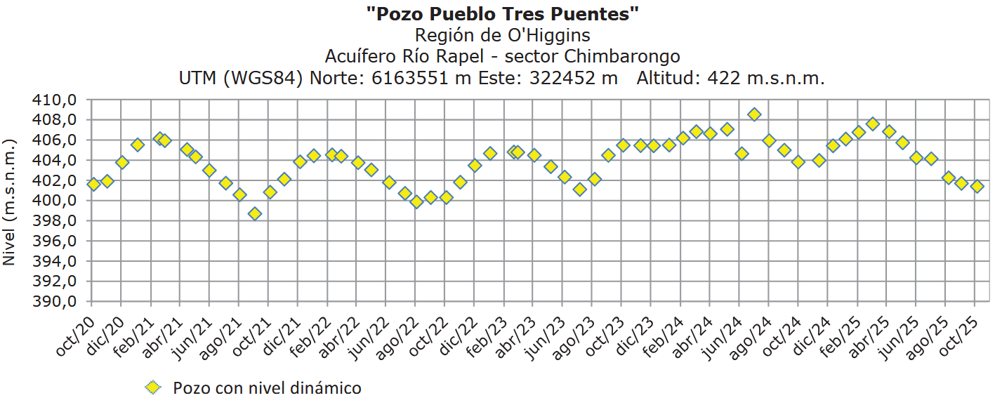 Por otro lado, el pozo Pueblo Tres Puentes, ubicado en el sector Chimbarongo, se mantuvo estable en octubre 2025, con un nivel dinámico en torno a 402 m.s.n.m., equivalente a una profundidad de aproximadamente 20 m desde la superficie.