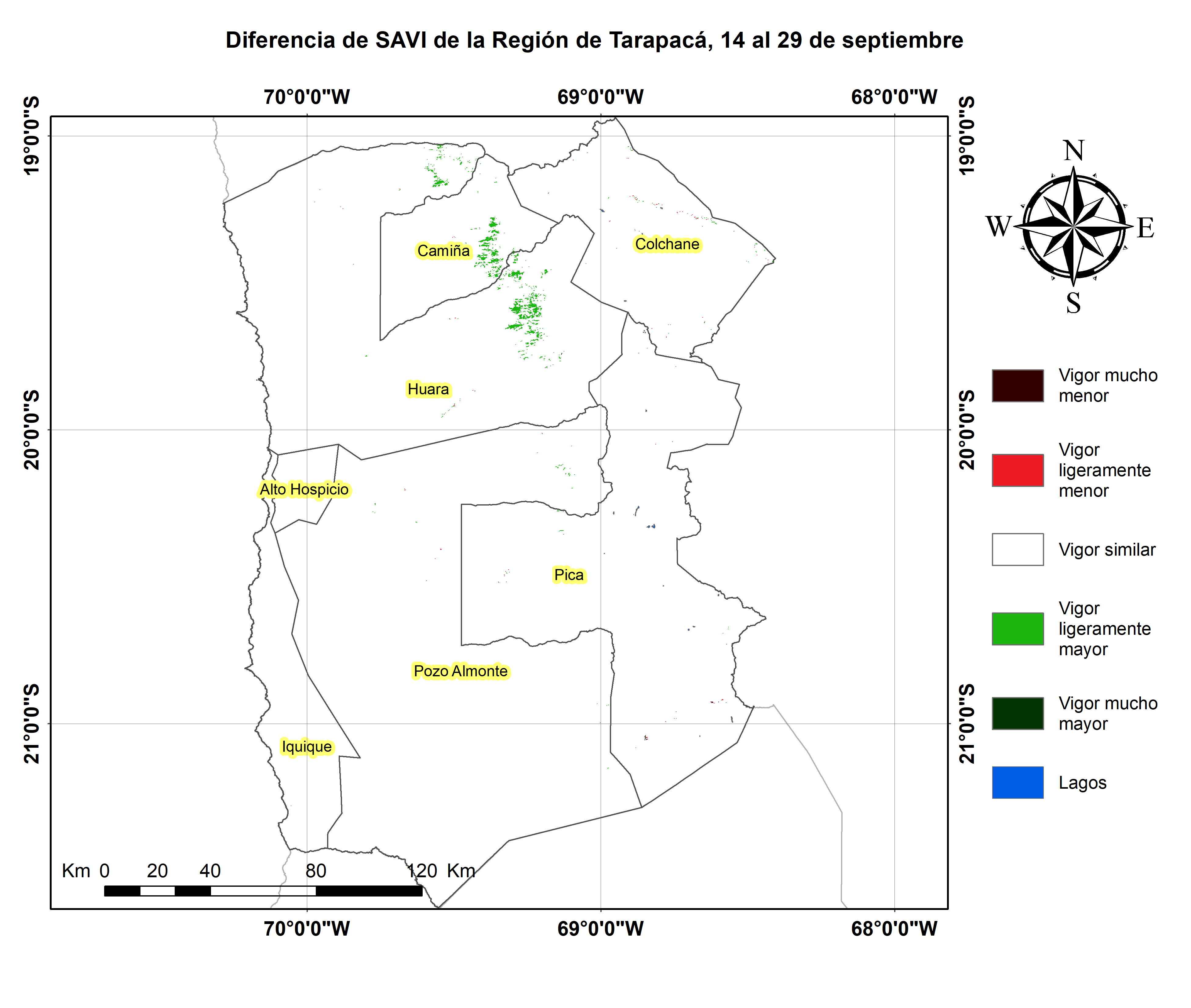 Respecto de la respuesta fisiológica de las plantas al efecto del clima, las imágenes satelitales reflejan la magnitud del crecimiento o disminución de la cobertura vegetal en esta época del año mediante el índice de vegetación SAVI (Desviación Normalizada del Índice de Vegetación Ajustado al Suelo).