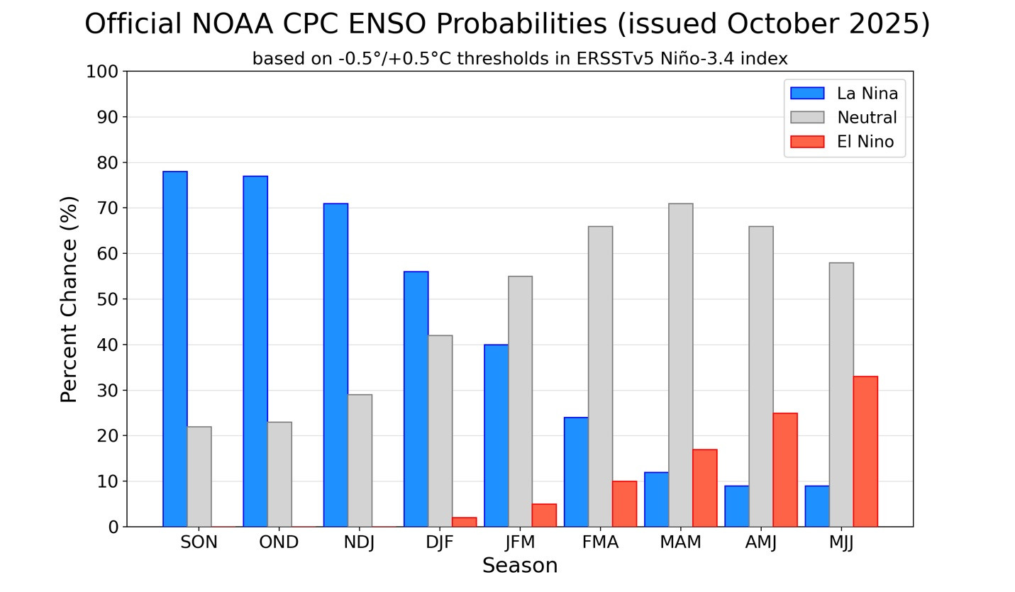 Figura 1. Las probabilidades del fenómeno ENSO indican cuáles serán las condiciones meteorológicas esperadas durante la temporada agrícola actual.
