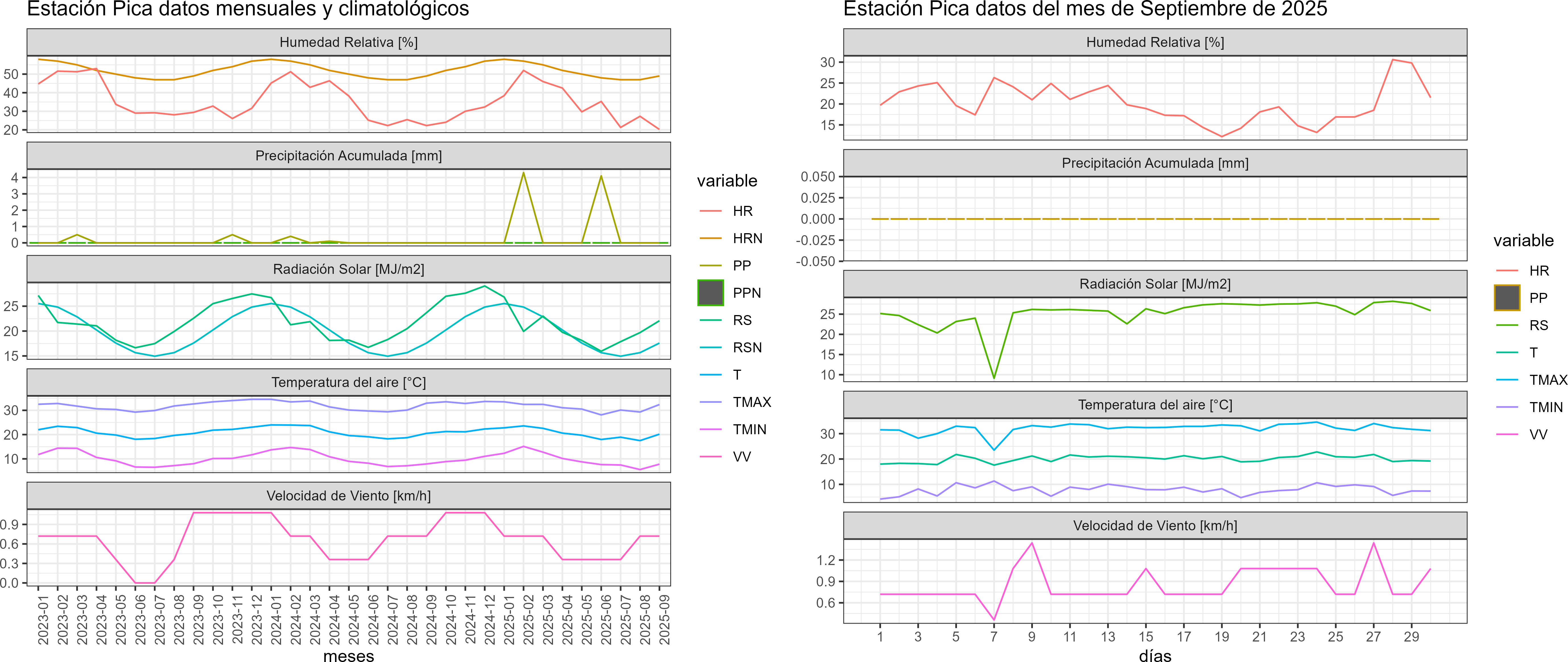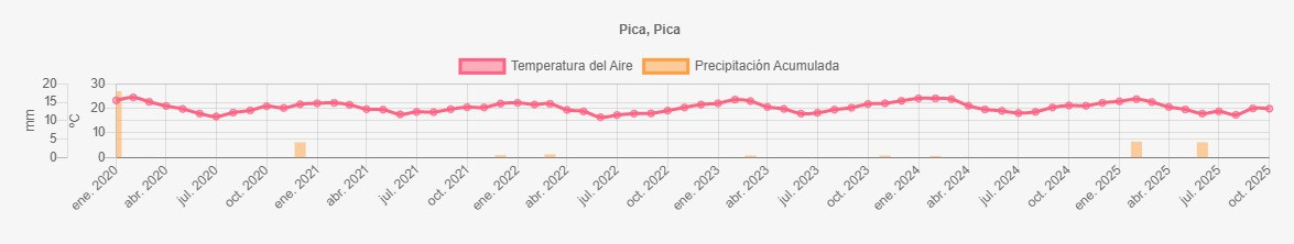 La estación Pica corresponde al distrito agroclimático 15-2-2. Para este distrito climático la temperatura mínima, media y máxima climatológicas alcanzan los 5.6°C, 18.2°C y 30.8°C respectivamente. Por su parte, respecto a las temperaturas medidas durante el mes de septiembre en la estación: la temperatura mínima alcanzo los 7.9°C (2.3°C sobre la climatológica), la temperatura media 20.1°C (1.9°C sobre la climatológica) y la temperatura máxima llegó a los 32.1°C (1.3°C sobre la climatológica). En el mes de septiembre se registró una pluviometría de 0 mm. De enero a septiembre se ha registrado un total acumulado de 8.4 mm, en circunstancias que un año normal registraría a la fecha 7 mm, lo que representa un superávit de 20%. A la misma fecha, durante el año 2024 la precipitación alcanzaba los 0 mm.