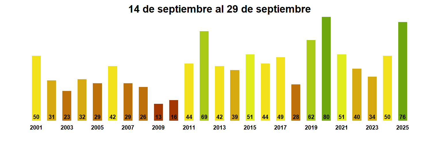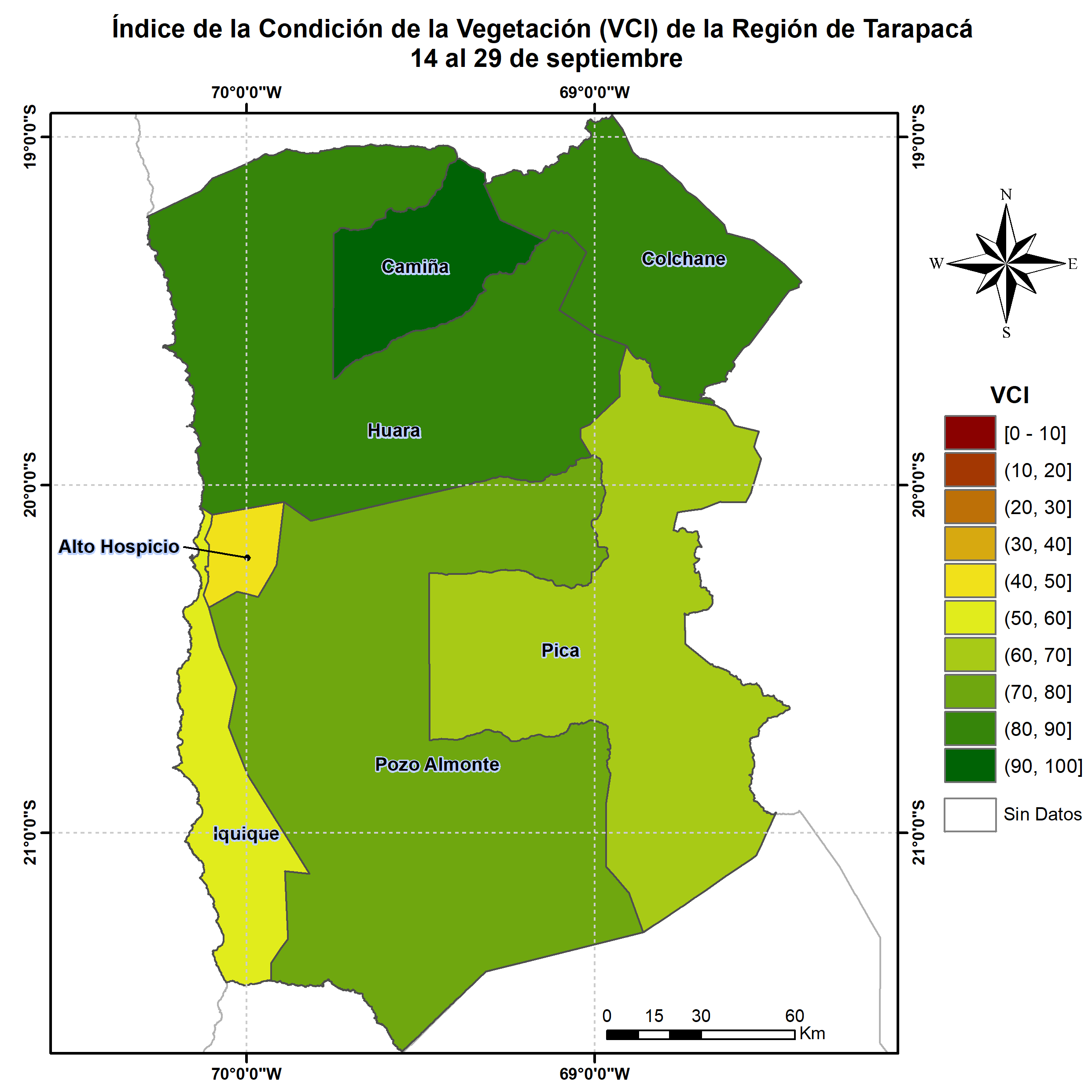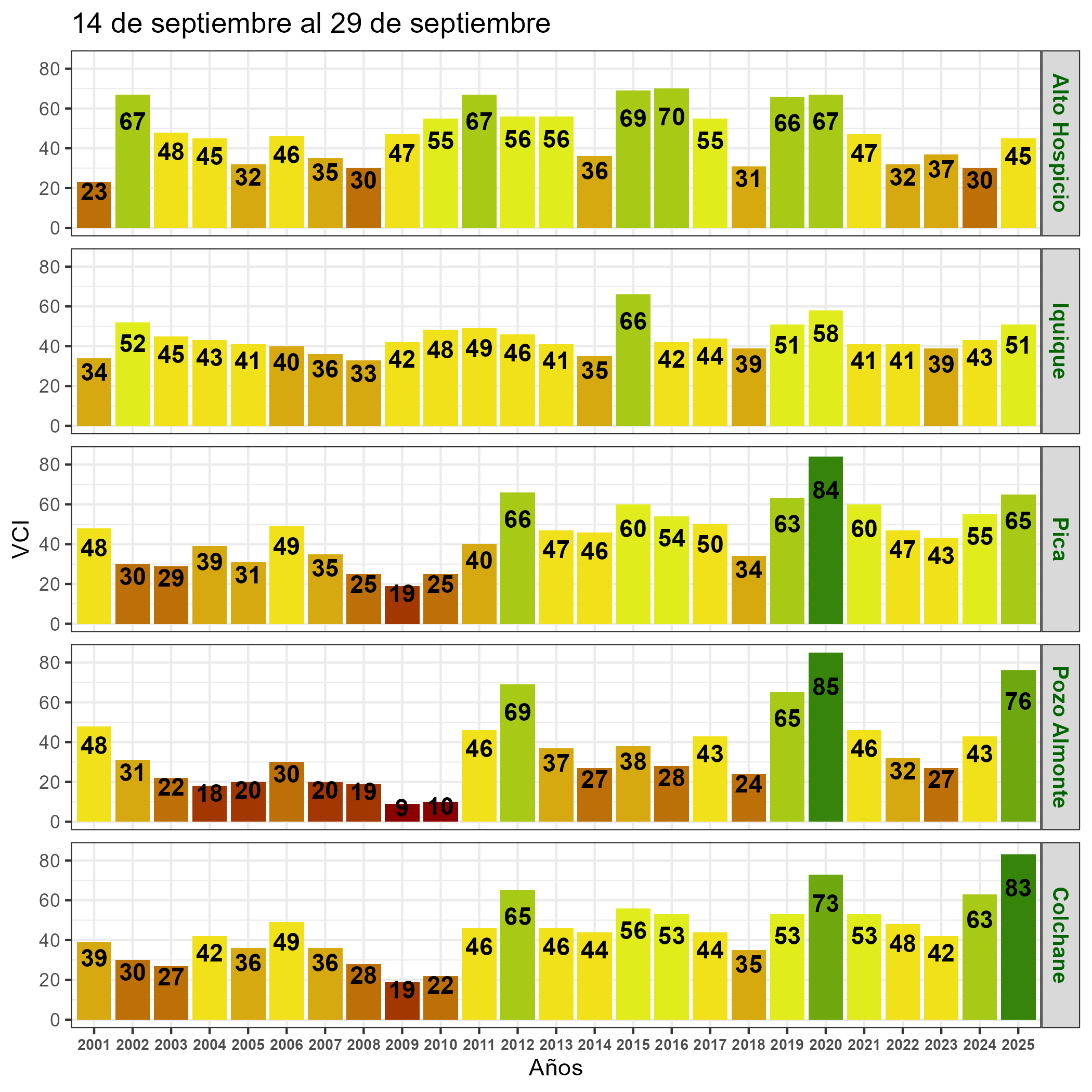 En términos globales la Región presentó un valor mediano de VCI de 76% para el período comprendido desde el 14 al 29 de septiembre. A igual período del año pasado presentaba un VCI de 50% (Fig. 1). De acuerdo a la Tabla 1 la Región de Tarapacá, en términos globales presenta una condición Favorable.