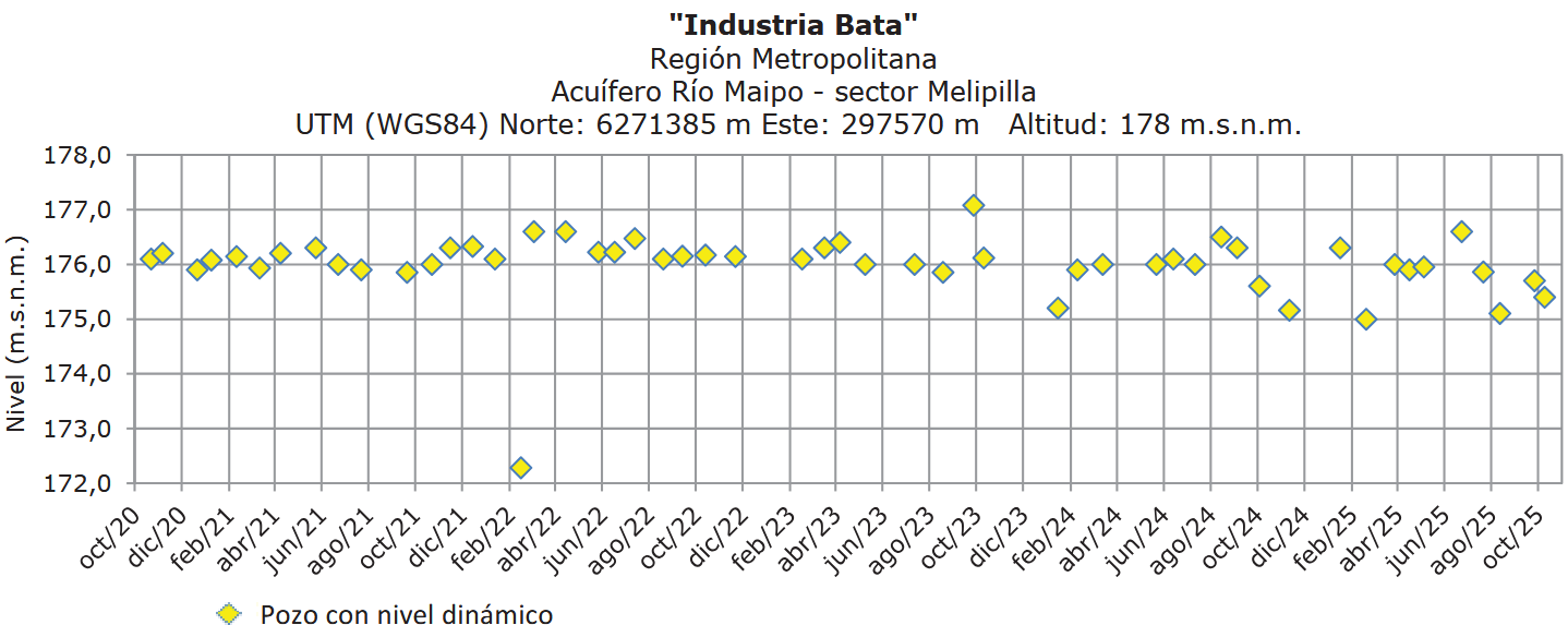 En el pozo Industria Bata, del acuífero Río Maipo (Melipilla), el nivel dinámico se mantiene relativamente estable respecto al comportamiento de los últimos años, situándose en octubre 2025 en torno a los 175,5 m.s.n.m., lo que corresponde aproximadamente a 2,5 m bajo la superficie del pozo.