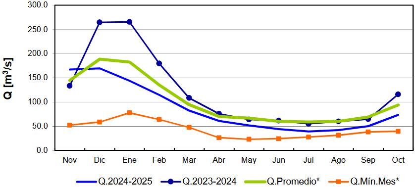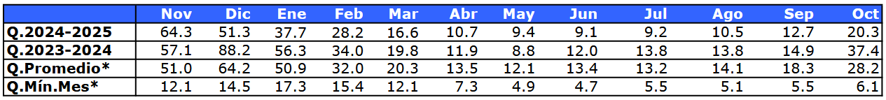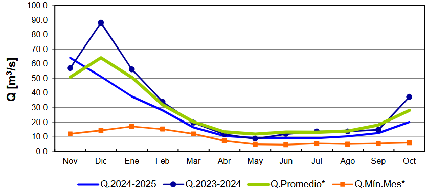 En la estación Río Aconcagua en Chacabuquito, el caudal de octubre 2025 alcanzó los 20,3 m3/s. Esto representa un 45,8% menos que en octubre 2024 (37,4 m3/s) y un 28,0% inferior al promedio histórico (28,2 m3/s). En relación a septiembre 2025 (12,7 m3/s), se observa un alza de 36,6%.