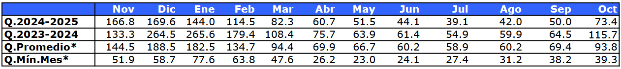 En la estación Río Maipo en El Manzano, el caudal de octubre 2025 fue de 73,4 m3/s. Este valor se encuentra 21,7% bajo el promedio histórico (93,8 m3/s) y 36,5% menor al registro de octubre 2024 (115,7 m3/s). En comparación con septiembre 2025 (50,0 m3/s), se aprecia un aumento de 31,9%.