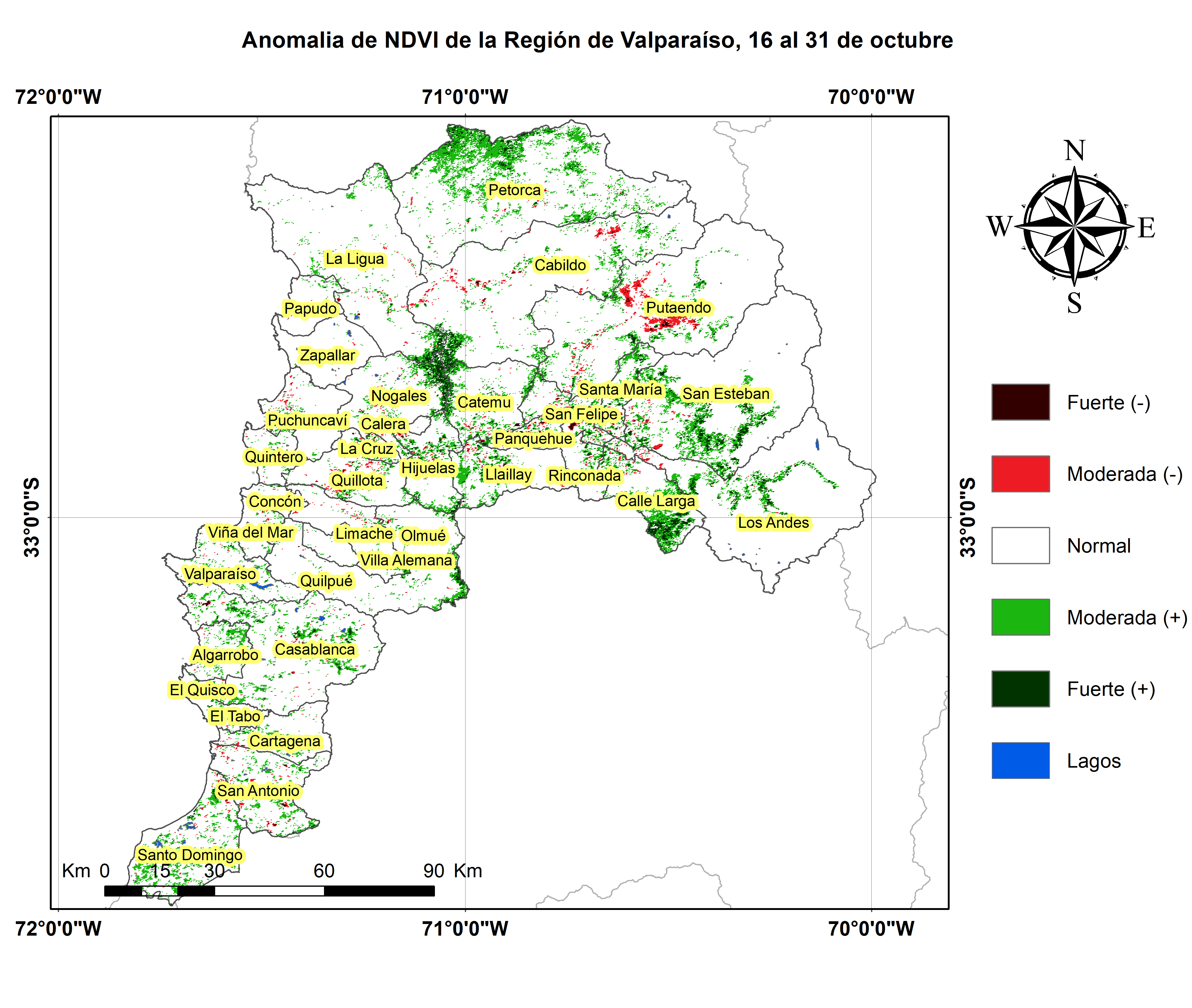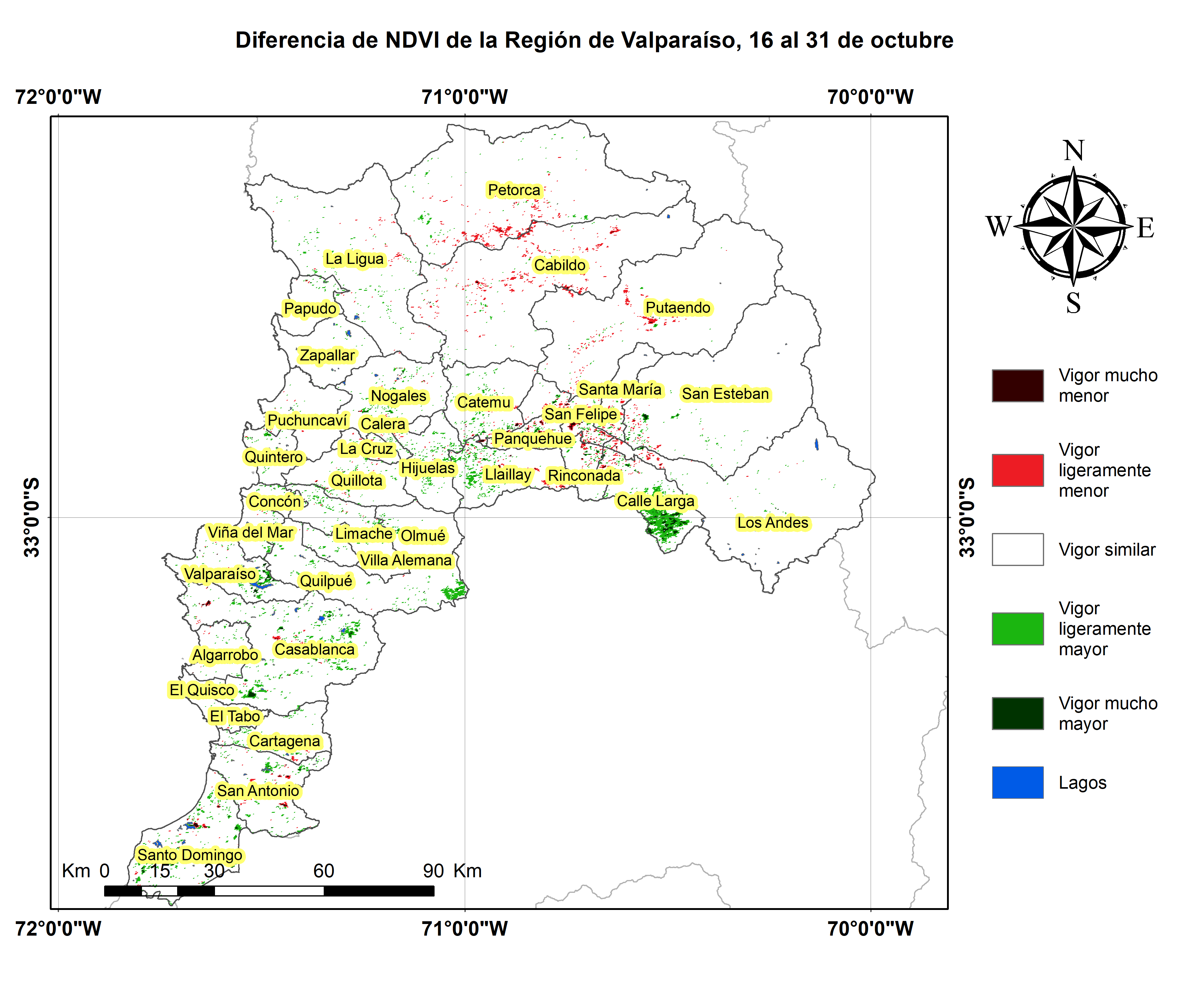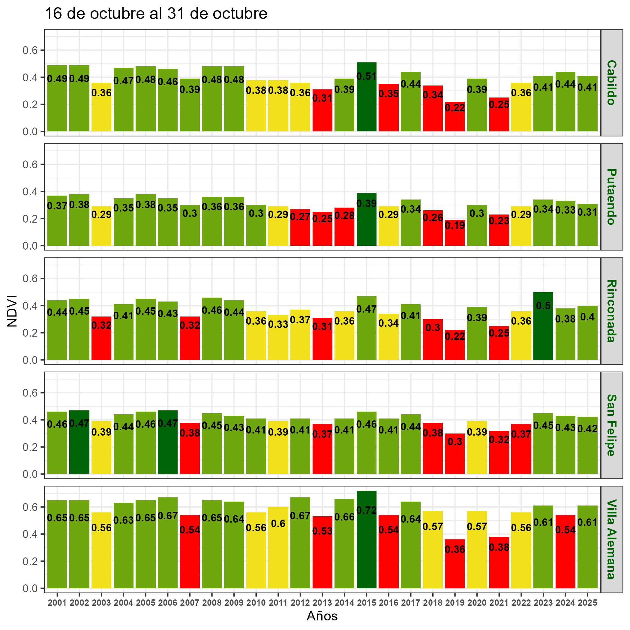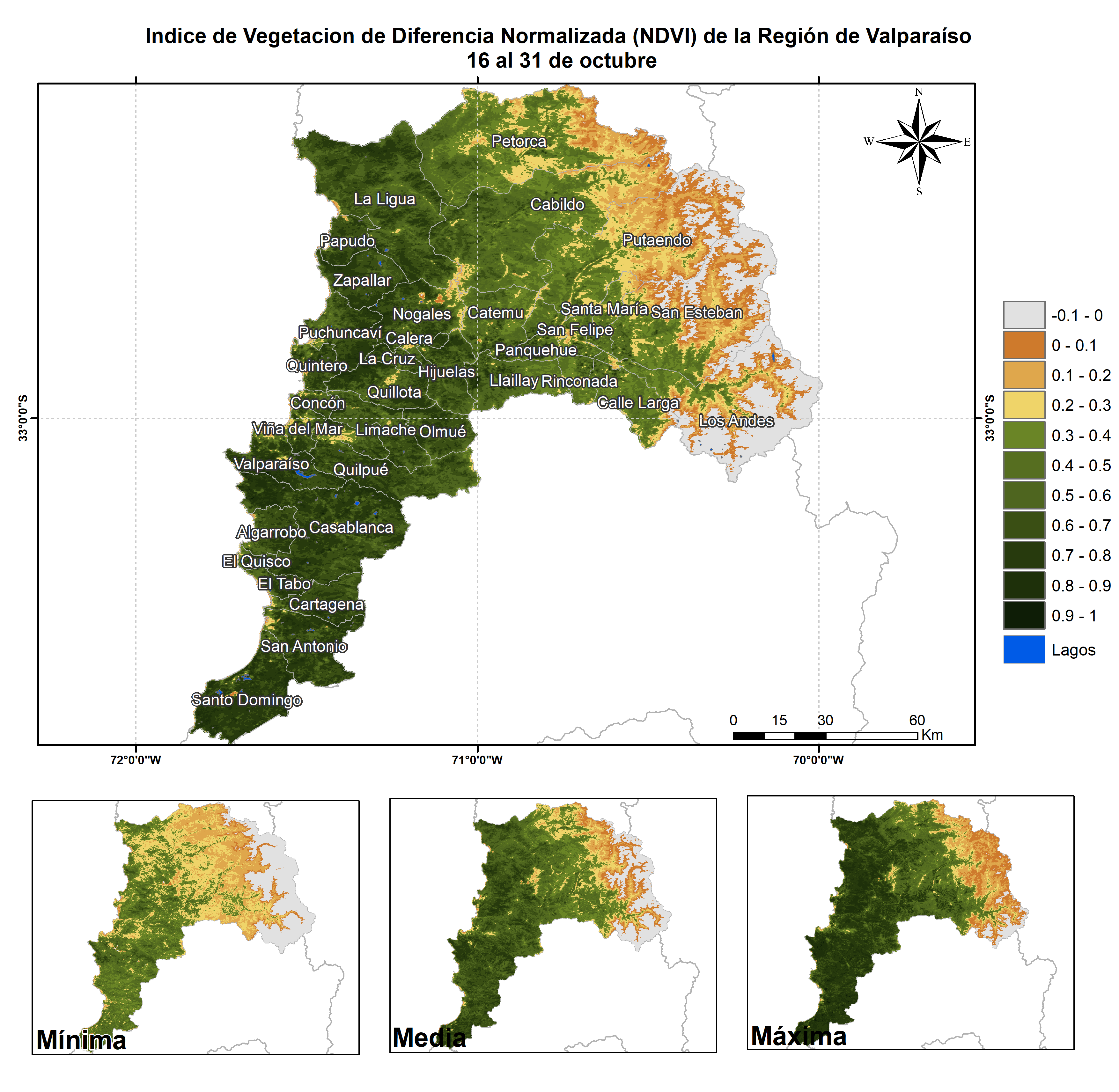 Respecto de la respuesta fisiológica de las plantas al efecto del clima, las imágenes satelitales reflejan la magnitud del crecimiento o disminución de la cobertura vegetal en esta época del año mediante el índice de vegetación NDVI (Desviación Normalizada del Índice de Vegetación).