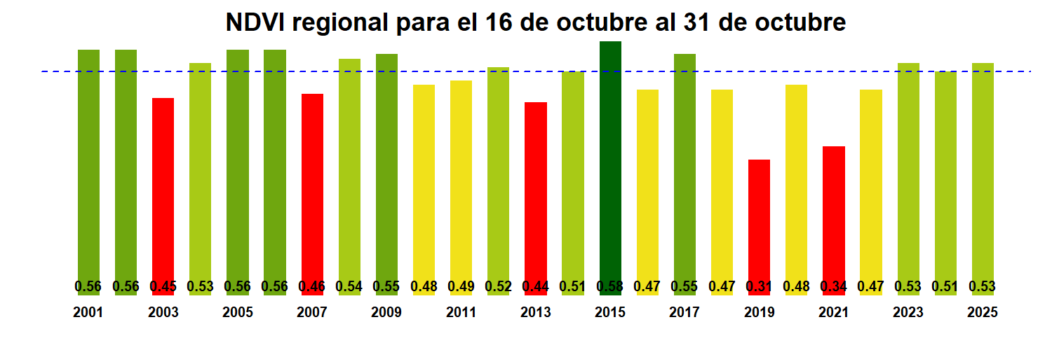 Para esta quincena se observa un NDVI promedio regional de 0.53 mientras el año pasado había sido de 0.51. El valor promedio histórico para esta región, en este período del año es de 0.5.