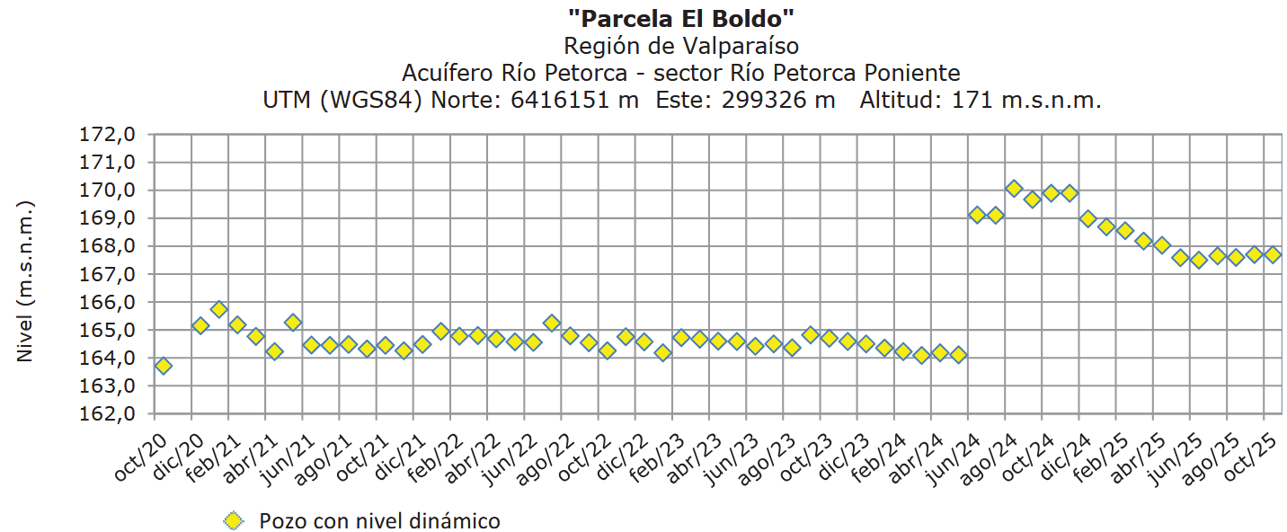 En el sector Río Petorca Poniente, correspondiente al acuífero Río Petorca, el pozo Parcela El Boldo muestra niveles que, tras el máximo alcanzado a comienzos de 2024, han tendido a estabilizarse. En octubre 2025 registró un nivel en torno a 167,5 m.s.n.m., equivalente a cerca de 4 m bajo la superficie, manteniendo una condición relativamente estable durante los últimos meses.