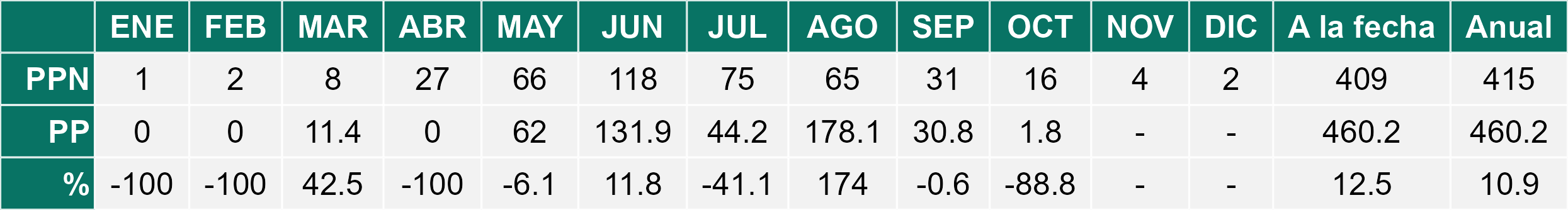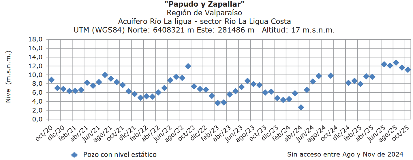 En el sector Río La Ligua Costa, pozo Papudo y Zapallar presentó en octubre 2025 niveles en torno a 11 m.s.n.m., levemente inferiores al máximo observado a mediados de año, pero aún superiores a los registrados entre 2020 y 2023, manteniendo así la recuperación lograda en los últimos meses.