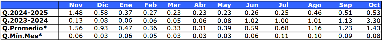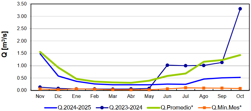 En la estación Río Sobrante en Piñadero, el caudal de octubre 2025 fue de 0,53 m3/s. Este valor es 63,0% menor al promedio histórico (1,43 m3/s) y 83,9% inferior al registro de octubre 2024 (3,30 m3/s). En comparación con septiembre 2025 (0,51 m3/s), se observa un leve aumento de 3,9%.