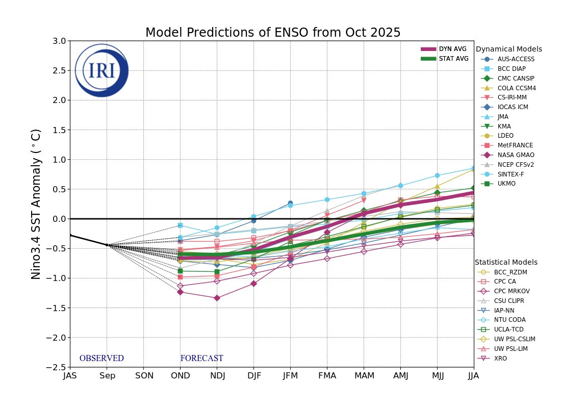 Figura 2. Evolución de Modelos de predicción del comportamiento del fenómeno ENSO representando la probabilidad de ocurrencia de La Niña en la mitad inferior del gráfico, y la de El Niño en la mitad superior del gráfico. Los registros en el rango entre -0.5 y +0.5 representan un pronóstico d condiciones neutras, y los registros sobre 0.5 indican el probable desarrollo del fenómeno del Niño.