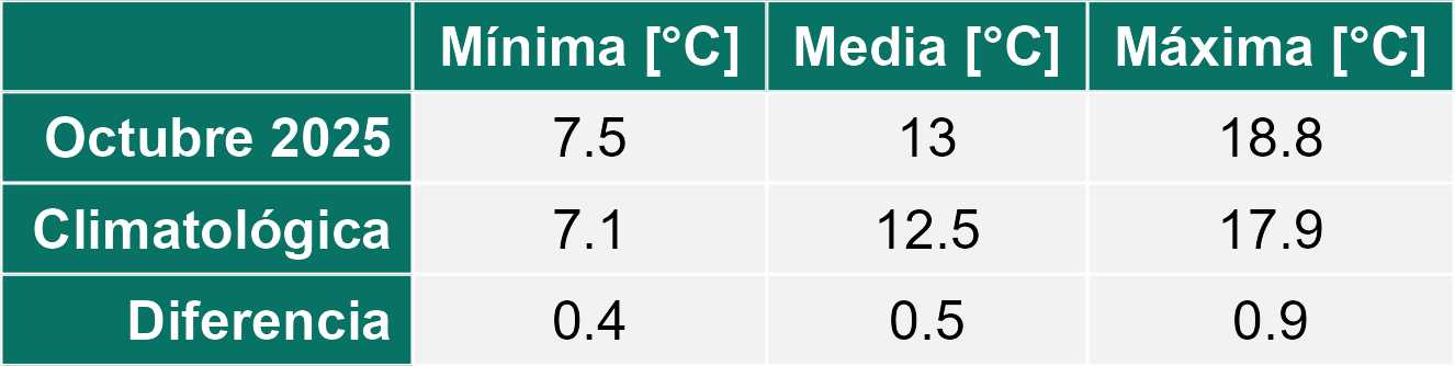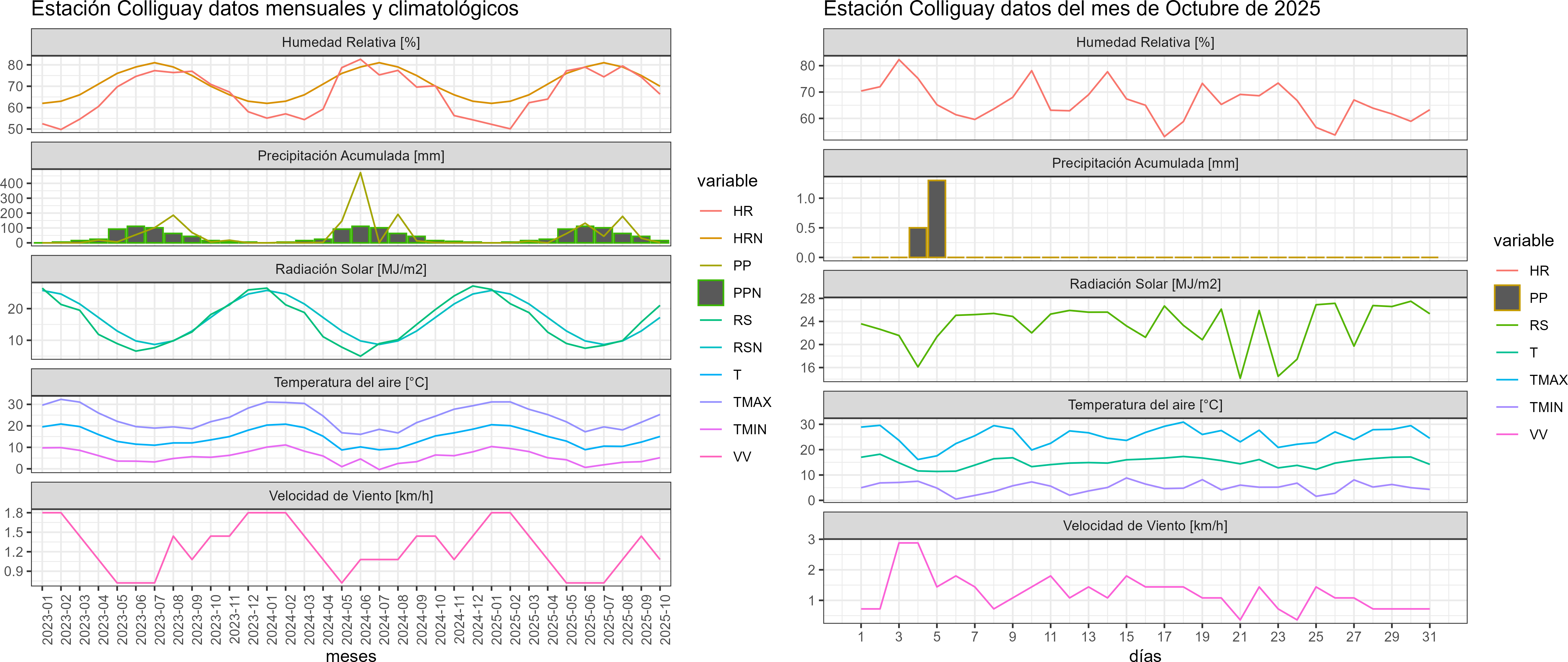 La estación Colliguay corresponde al distrito agroclimático 5-6-2. Para este distrito climático la temperatura mínima, media y máxima climatológicas alcanzan los 6.1°C, 13.4°C y 20.8°C respectivamente. Por su parte, respecto a las temperaturas medidas durante el mes de octubre en la estación: la temperatura mínima alcanzo los 5.2°C (-0.9°C bajo la climatológica), la temperatura media 15.1°C (1.7°C sobre la climatológica) y la temperatura máxima llegó a los 25.3°C (4.5°C sobre la climatológica). En el mes de octubre se registró una pluviometría de 1.8 mm, lo cual representa un 11.2% con respecto al mismo mes de un año normal. De enero a octubre se ha registrado un total acumulado de 460.2 mm, en circunstancias que un año normal registraría a la fecha 409 mm, lo que representa un superávit de 12.5%. A la misma fecha, durante el año 2024 la precipitación alcanzaba los 1.3 mm.