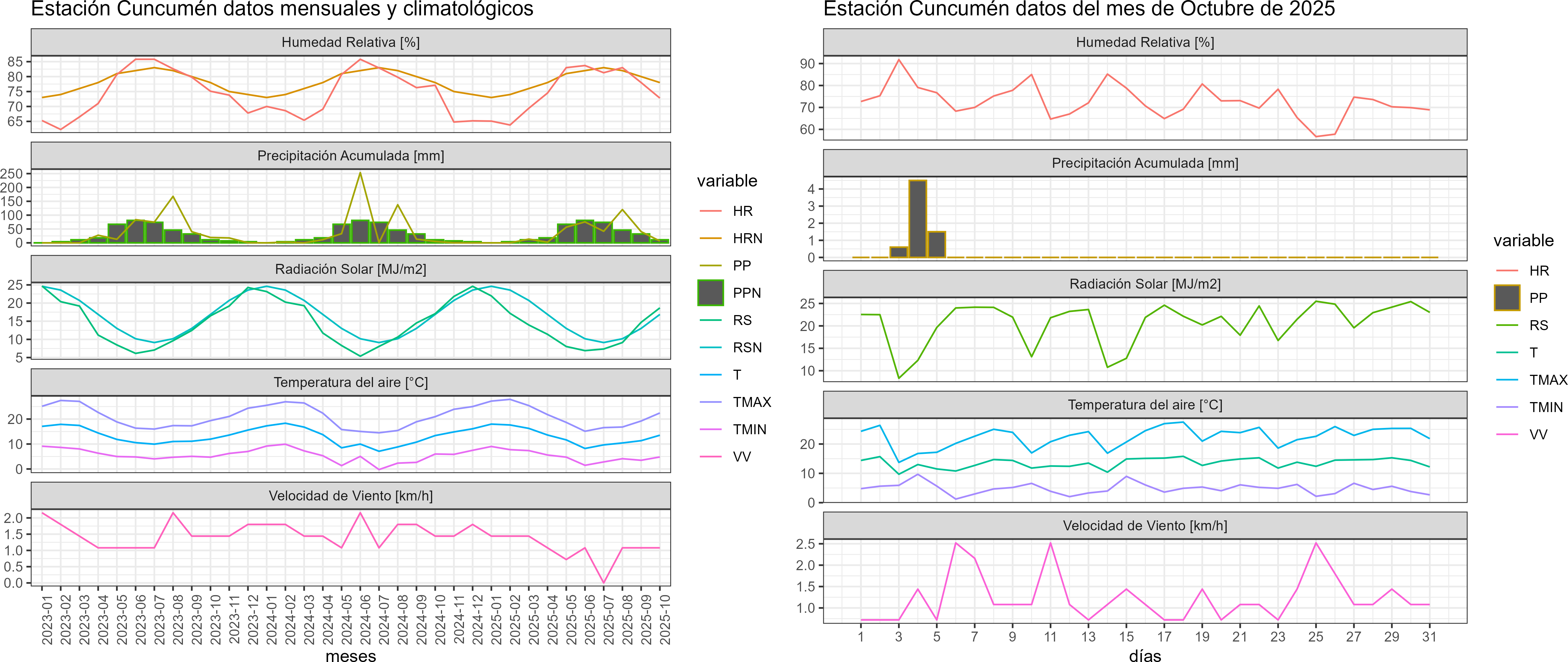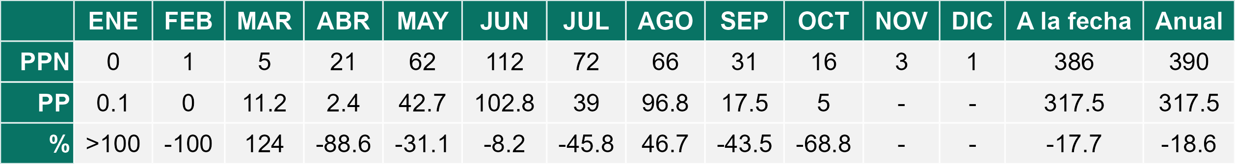 La estación Cuncumén corresponde al distrito agroclimático 5-13-1. Para este distrito climático la temperatura mínima, media y máxima climatológicas alcanzan los 6.4°C, 13.6°C y 20.7°C respectivamente. Por su parte, respecto a las temperaturas medidas durante el mes de octubre en la estación: la temperatura mínima alcanzo los 4.8°C (-1.6°C bajo la climatológica), la temperatura media 13.5°C (-0.1°C bajo la climatológica) y la temperatura máxima llegó a los 22.4°C (1.7°C sobre la climatológica). En el mes de octubre se registró una pluviometría de 6.6 mm, lo cual representa un 38.8% con respecto al mismo mes de un año normal. De enero a octubre se ha registrado un total acumulado de 357 mm, en circunstancias que un año normal registraría a la fecha 465 mm, lo que representa un déficit de 23.2%. A la misma fecha, durante el año 2024 la precipitación alcanzaba los 5 mm.