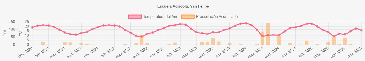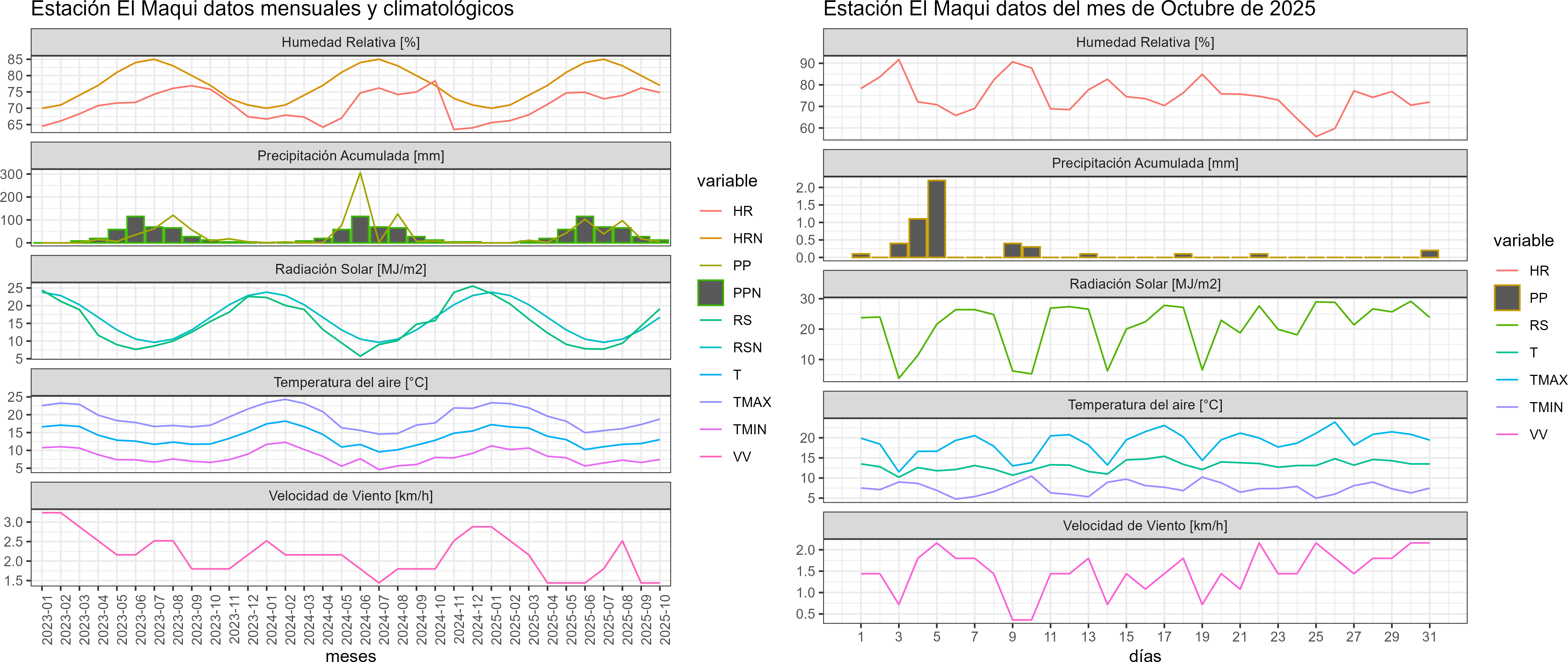 La estación El Maqui corresponde al distrito agroclimático 5-4. Para este distrito climático la temperatura mínima, media y máxima climatológicas alcanzan los 7.1°C, 12.5°C y 17.9°C respectivamente. Por su parte, respecto a las temperaturas medidas durante el mes de octubre en la estación: la temperatura mínima alcanzo los 7.5°C (0.4°C sobre la climatológica), la temperatura media 13°C (0.5°C sobre la climatológica) y la temperatura máxima llegó a los 18.8°C (0.9°C sobre la climatológica). En el mes de octubre se registró una pluviometría de 5 mm, lo cual representa un 31.2% con respecto al mismo mes de un año normal. De enero a octubre se ha registrado un total acumulado de 317.5 mm, en circunstancias que un año normal registraría a la fecha 386 mm, lo que representa un déficit de 17.7%. A la misma fecha, durante el año 2024 la precipitación alcanzaba los 8.4 mm.