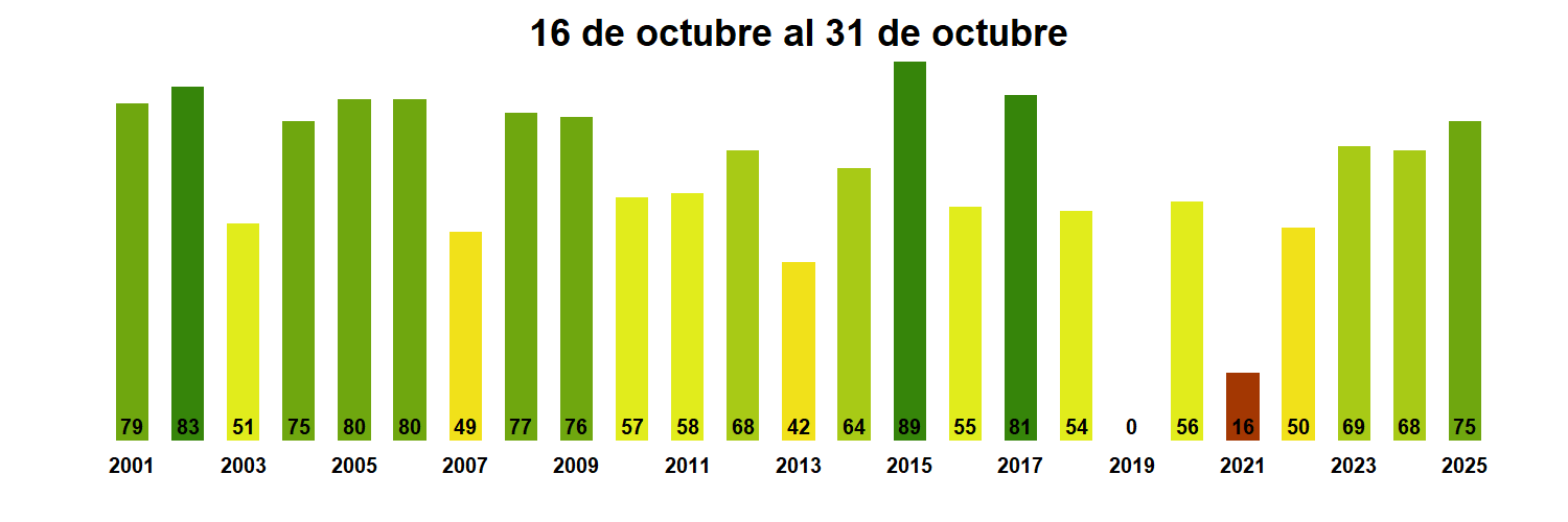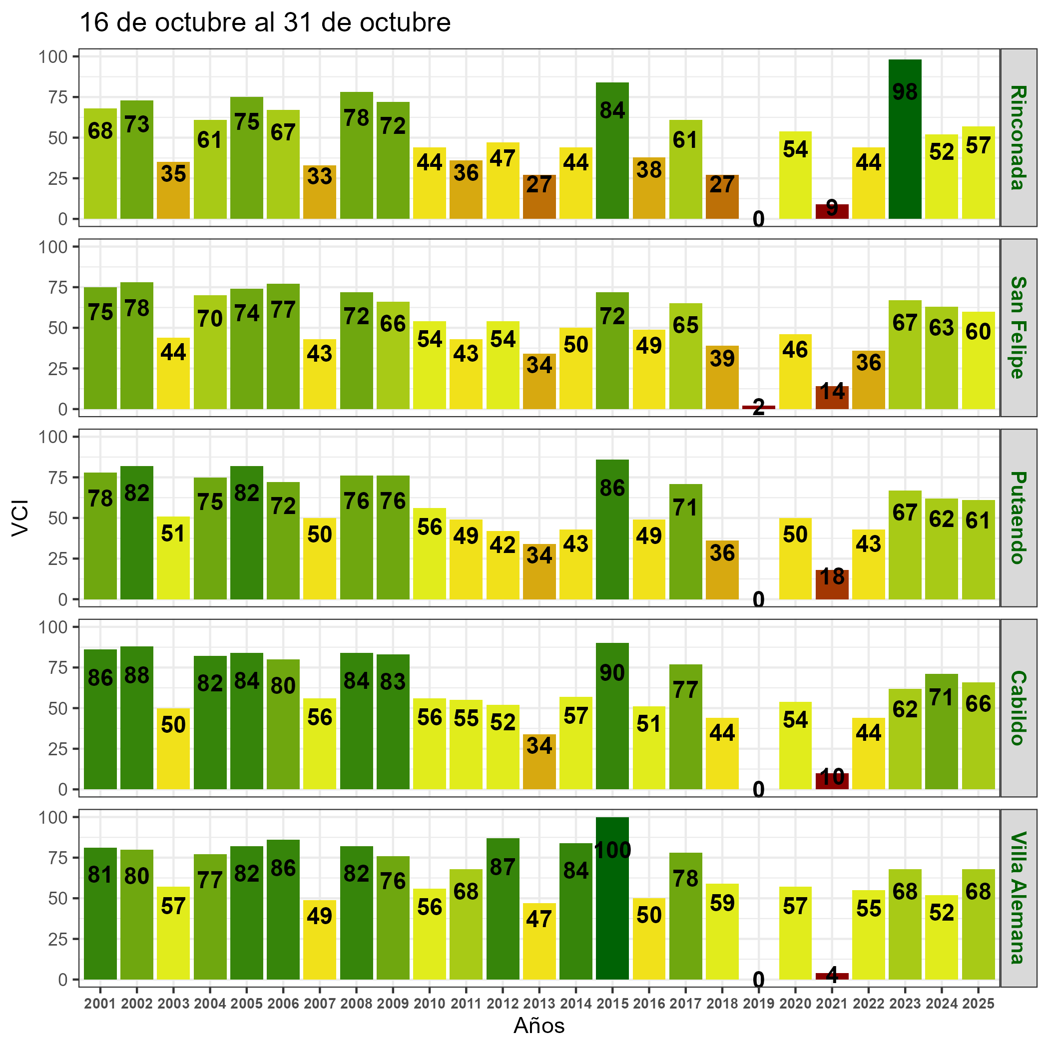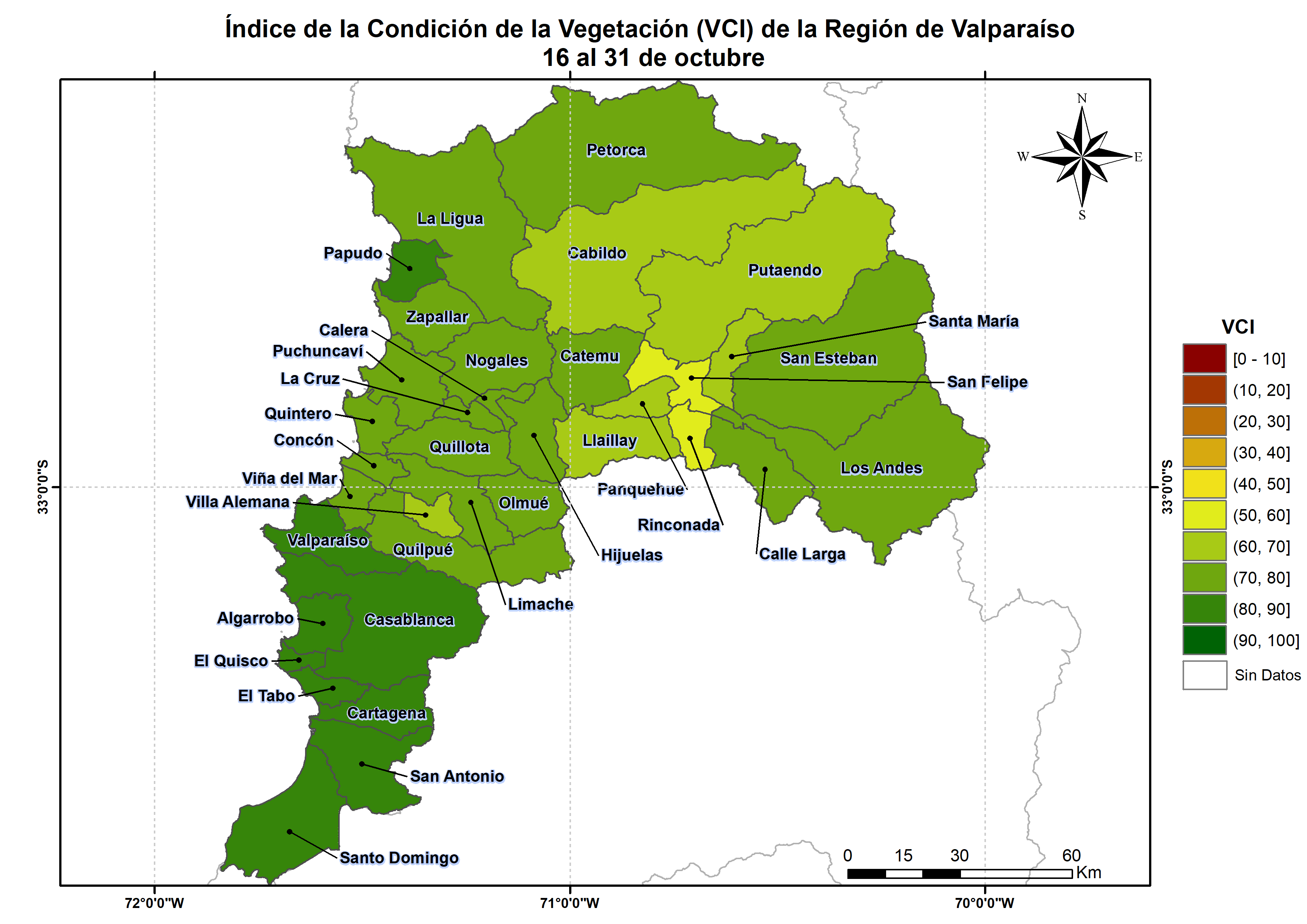 En términos globales la Región presentó un valor mediano de VCI de 75% para el período comprendido desde el 16 al 31 de octubre. A igual período del año pasado presentaba un VCI de 68% (Fig. 1). De acuerdo a la Tabla 1 la Región de Valparaíso, en términos globales presenta una condición Favorable.