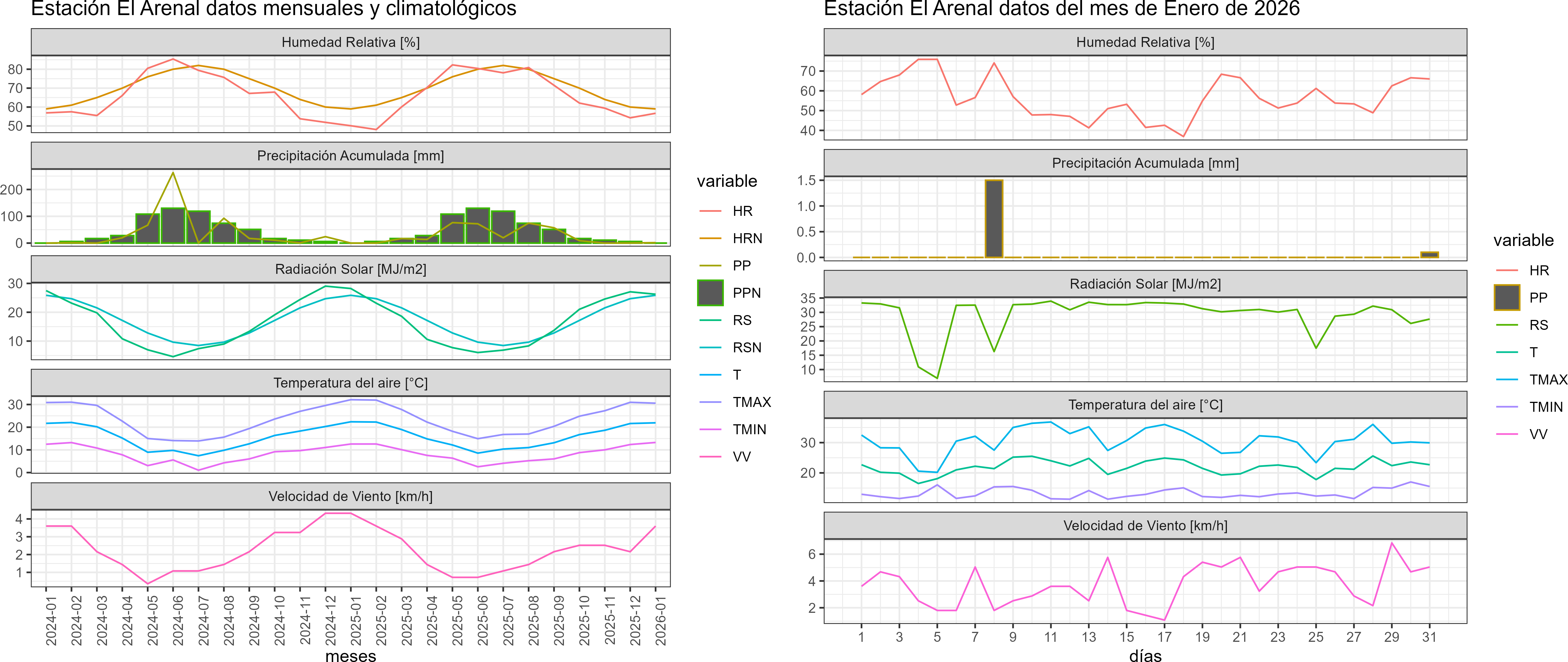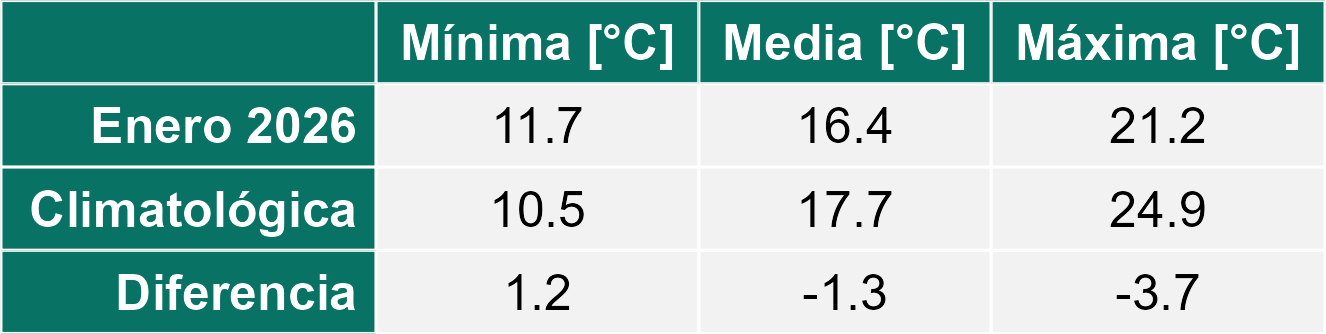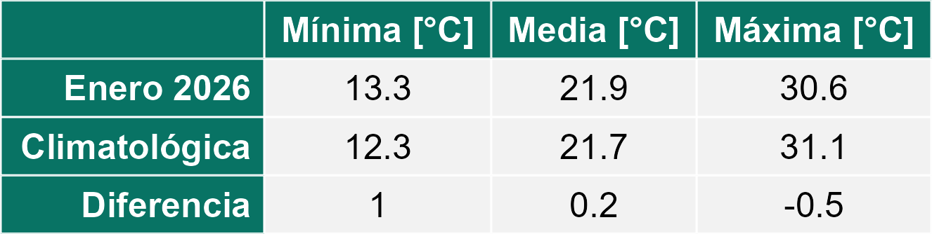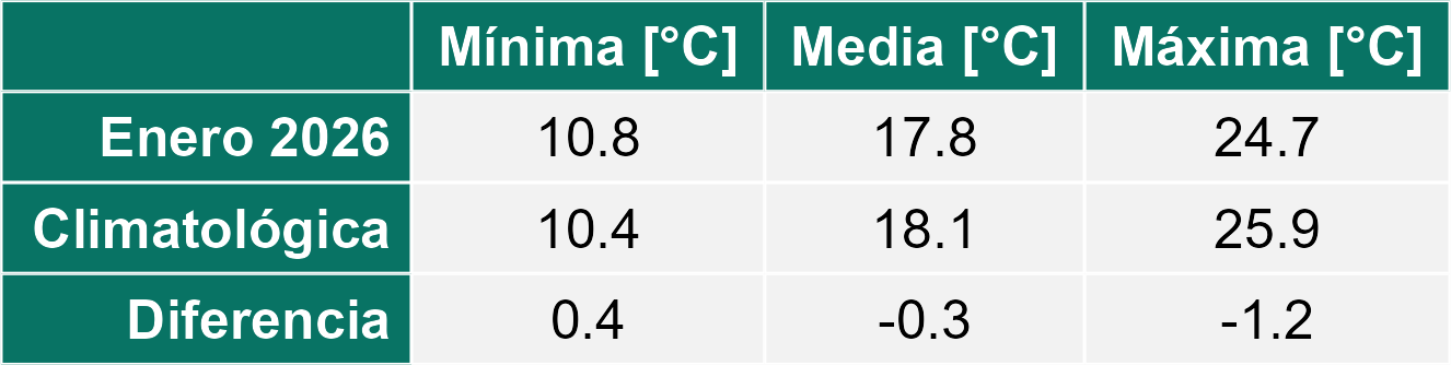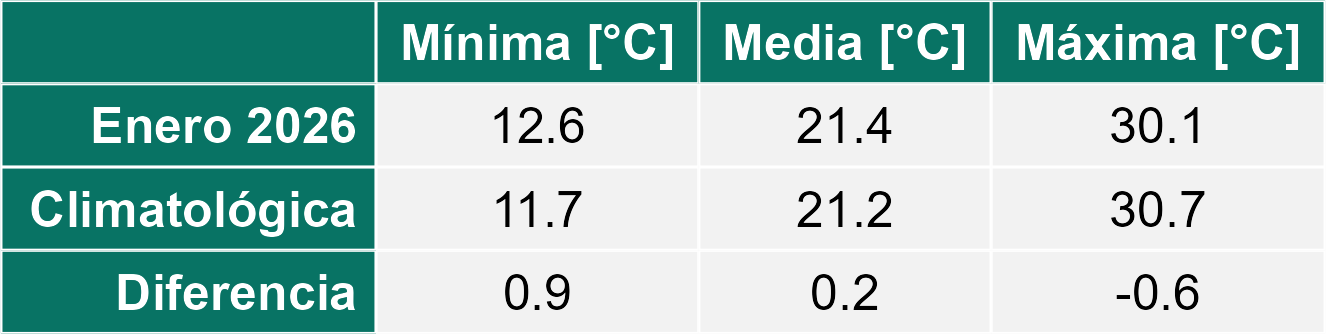 La estación El Arenal corresponde al distrito agroclimático 6-2. Para este distrito climático la temperatura mínima, media y máxima climatológicas alcanzan los 12.3°C, 21.7°C y 31.1°C respectivamente. Por su parte, respecto a las temperaturas medidas durante el mes de enero en la estación: la temperatura mínima alcanzo los 13.3°C (1°C sobre la climatológica), la temperatura media 21.9°C (0.2°C sobre la climatológica) y la temperatura máxima llegó a los 30.6°C (-0.5°C bajo la climatológica). En el mes de enero se registró una pluviometría de 1.6 mm, lo cual representa un 40% con respecto al mismo mes de un año normal. De enero a enero se ha registrado un total acumulado de 1.6 mm, en circunstancias que un año normal registraría a la fecha 4 mm, lo que representa un déficit de 60%. A la misma fecha, durante el año 2024 la precipitación alcanzaba los 0 mm.