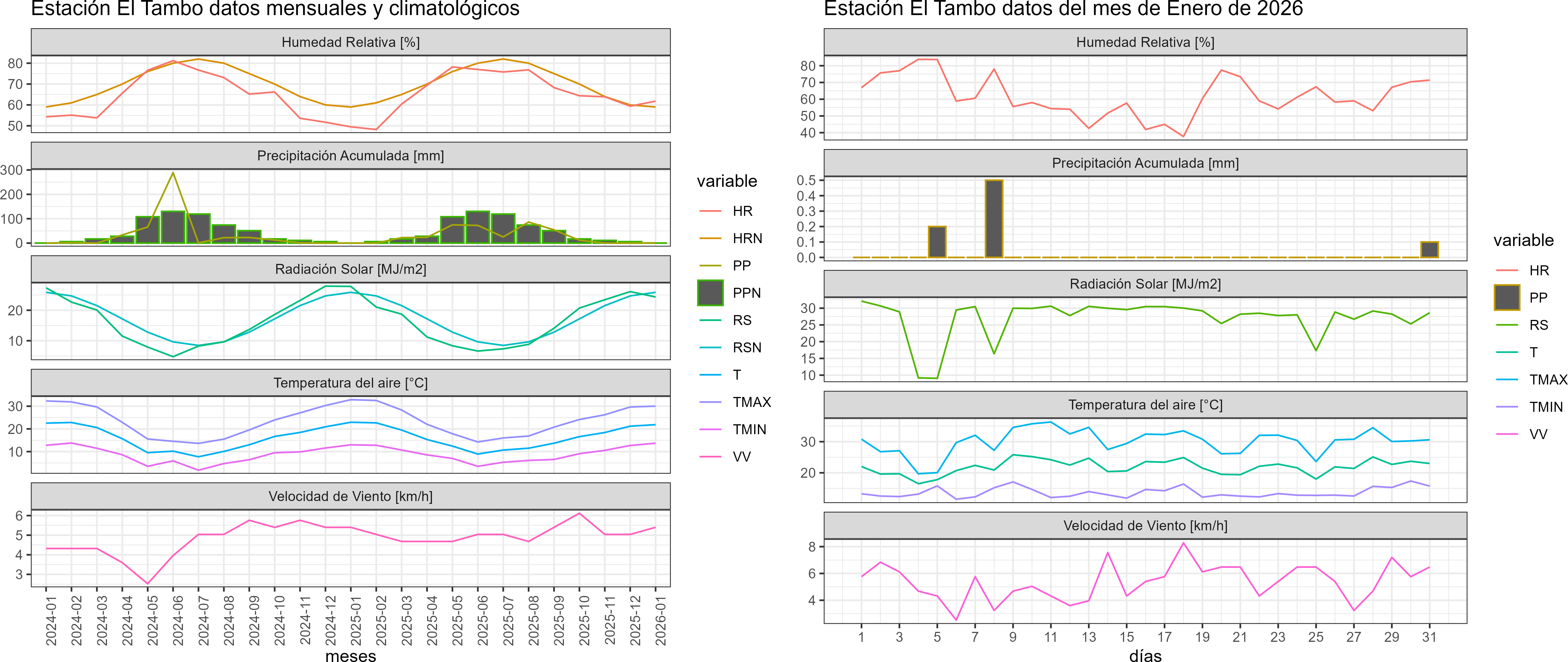 La estación El Tambo corresponde al distrito agroclimático 6-2. Para este distrito climático la temperatura mínima, media y máxima climatológicas alcanzan los 12.5°C, 22.1°C y 31.8°C respectivamente. Por su parte, respecto a las temperaturas medidas durante el mes de enero en la estación: la temperatura mínima alcanzo los 13.7°C (1.2°C sobre la climatológica), la temperatura media 21.9°C (-0.2°C bajo la climatológica) y la temperatura máxima llegó a los 30°C (-1.8°C bajo la climatológica). En el mes de enero se registró una pluviometría de 0.8 mm, lo cual representa un 20% con respecto al mismo mes de un año normal. De enero a enero se ha registrado un total acumulado de 0.8 mm, en circunstancias que un año normal registraría a la fecha 4 mm, lo que representa un déficit de 80%. A la misma fecha, durante el año 2024 la precipitación alcanzaba los 0 mm.