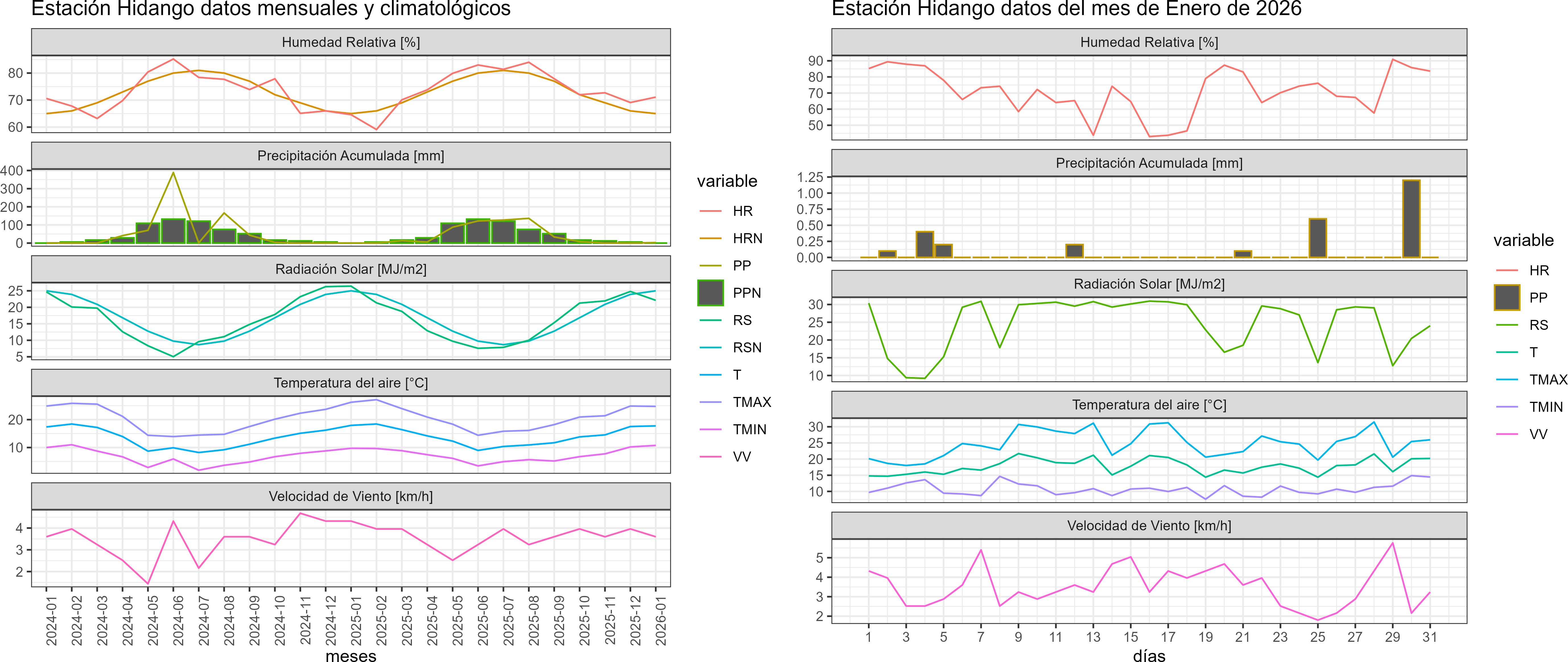 La estación Hidango corresponde al distrito agroclimático 5-6-1. Para este distrito climático la temperatura mínima, media y máxima climatológicas alcanzan los 10.4°C, 18.1°C y 25.9°C respectivamente. Por su parte, respecto a las temperaturas medidas durante el mes de enero en la estación: la temperatura mínima alcanzo los 10.8°C (0.4°C sobre la climatológica), la temperatura media 17.8°C (-0.3°C bajo la climatológica) y la temperatura máxima llegó a los 24.7°C (-1.2°C bajo la climatológica). En el mes de enero se registró una pluviometría de 2.8 mm, lo cual representa un 280% con respecto al mismo mes de un año normal. De enero a enero se ha registrado un total acumulado de 2.8 mm, en circunstancias que un año normal registraría a la fecha 1 mm, lo que representa un superávit de 180%. A la misma fecha, durante el año 2024 la precipitación alcanzaba los 0.4 mm.