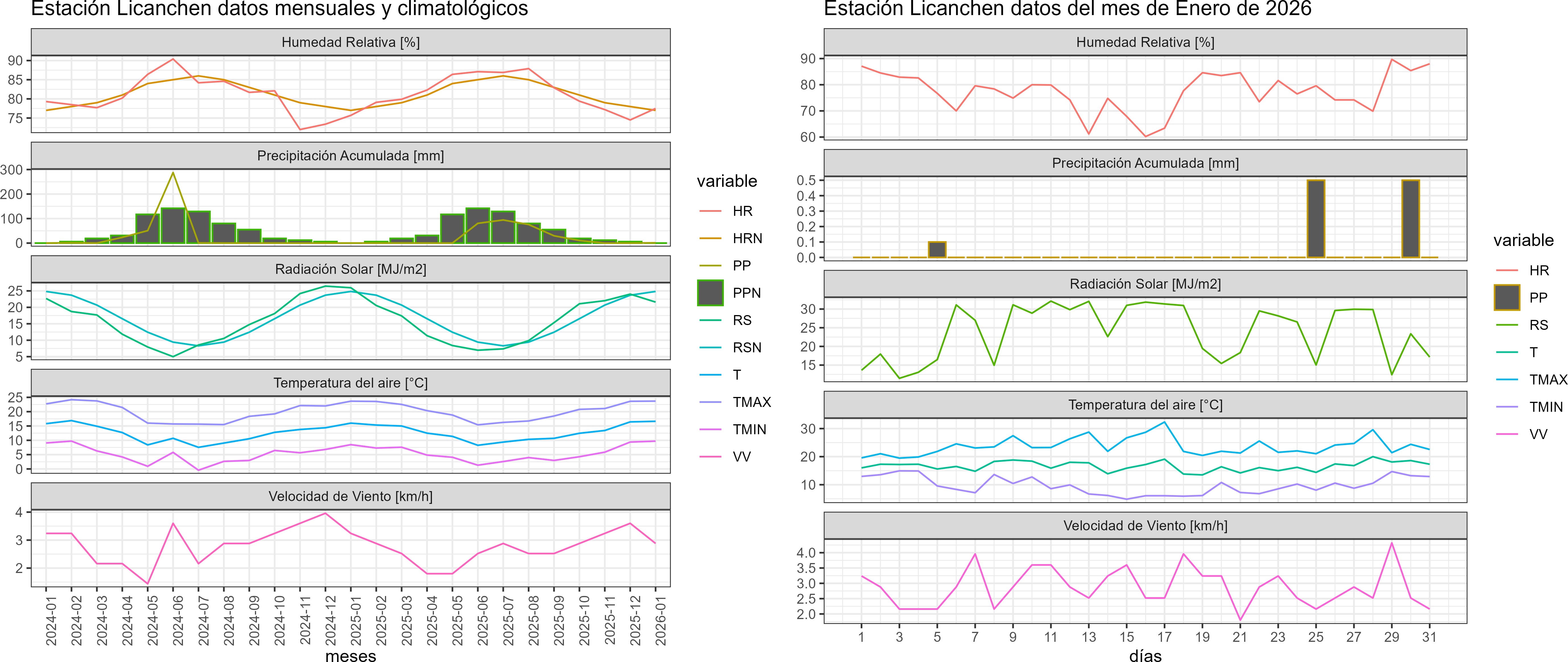 La estación Licanchen corresponde al distrito agroclimático 5-7-1. Para este distrito climático la temperatura mínima, media y máxima climatológicas alcanzan los 11.4°C, 17.3°C y 23.2°C respectivamente. Por su parte, respecto a las temperaturas medidas durante el mes de enero en la estación: la temperatura mínima alcanzo los 9.7°C (-1.7°C bajo la climatológica), la temperatura media 16.6°C (-0.7°C bajo la climatológica) y la temperatura máxima llegó a los 23.7°C (0.5°C sobre la climatológica). En el mes de enero se registró una pluviometría de 1.1 mm, lo cual representa un 110% con respecto al mismo mes de un año normal. De enero a enero se ha registrado un total acumulado de 1.1 mm, en circunstancias que un año normal registraría a la fecha 1 mm, lo que representa un superávit de 10%. A la misma fecha, durante el año 2024 la precipitación alcanzaba los 0.1 mm.