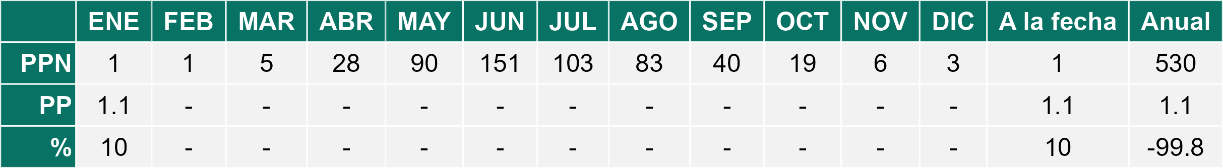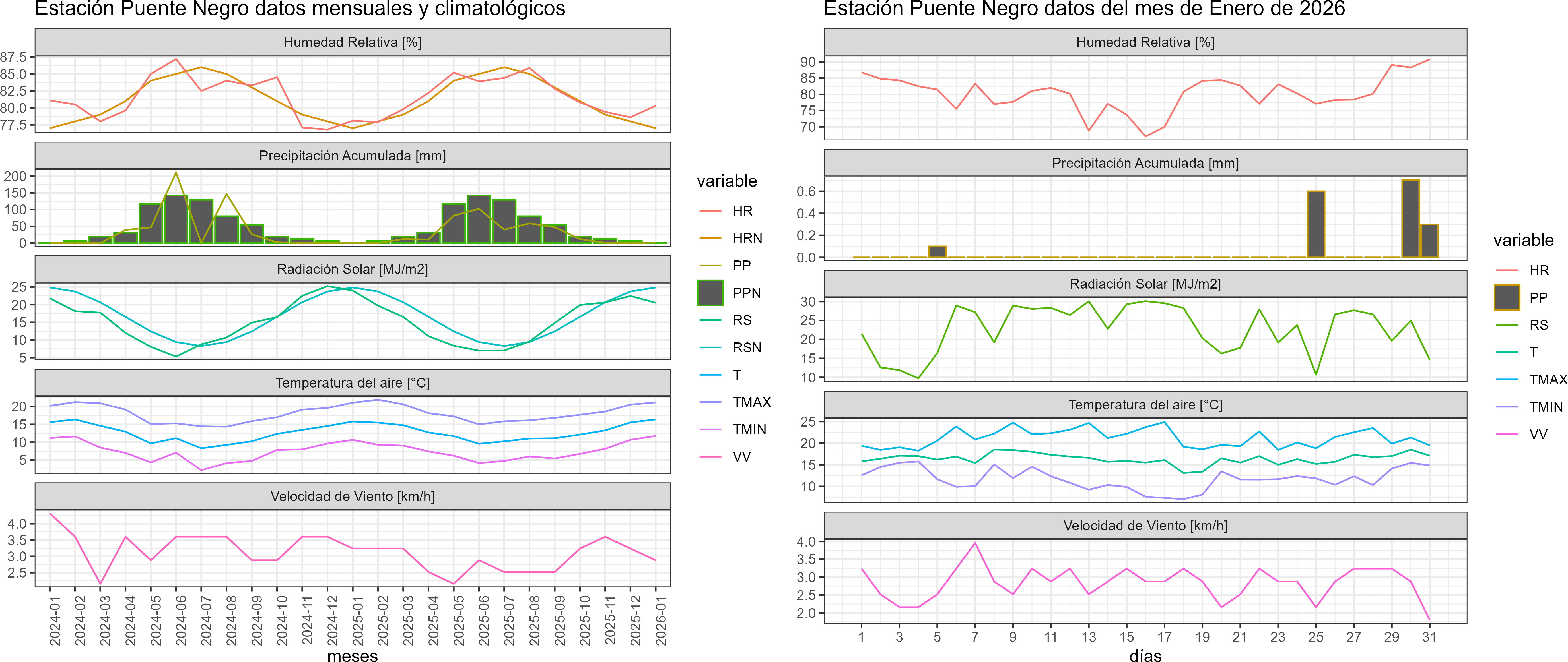 La estación Puente Negro corresponde al distrito agroclimático 5-7-1. Para este distrito climático la temperatura mínima, media y máxima climatológicas alcanzan los 10.5°C, 17.7°C y 24.9°C respectivamente. Por su parte, respecto a las temperaturas medidas durante el mes de enero en la estación: la temperatura mínima alcanzo los 11.7°C (1.2°C sobre la climatológica), la temperatura media 16.4°C (-1.3°C bajo la climatológica) y la temperatura máxima llegó a los 21.2°C (-3.7°C bajo la climatológica). En el mes de enero se registró una pluviometría de 1.7 mm, lo cual representa un 170% con respecto al mismo mes de un año normal. De enero a enero se ha registrado un total acumulado de 1.7 mm, en circunstancias que un año normal registraría a la fecha 1 mm, lo que representa un superávit de 70%. A la misma fecha, durante el año 2024 la precipitación alcanzaba los 0 mm.