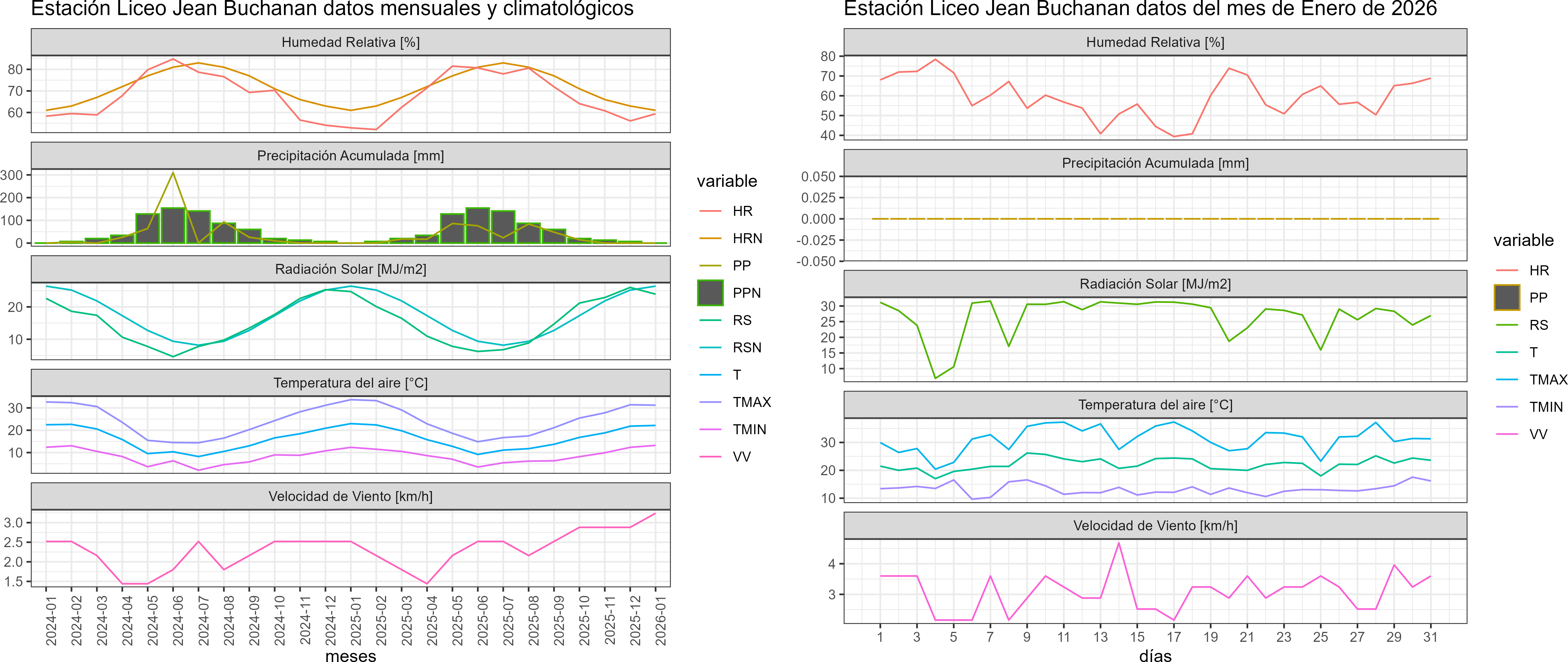 La estación Liceo Jean Buchanan corresponde al distrito agroclimático 6-1. Para este distrito climático la temperatura mínima, media y máxima climatológicas alcanzan los 11.8°C, 21.4°C y 31°C respectivamente. Por su parte, respecto a las temperaturas medidas durante el mes de enero en la estación: la temperatura mínima alcanzo los 13.2°C (1.4°C sobre la climatológica), la temperatura media 22.1°C (0.7°C sobre la climatológica) y la temperatura máxima llegó a los 31.2°C (0.2°C sobre la climatológica). En el mes de enero se registró una pluviometría de 0 mm, lo cual representa un 0% con respecto al mismo mes de un año normal. De enero a enero se ha registrado un total acumulado de 0 mm, en circunstancias que un año normal registraría a la fecha 3 mm, lo que representa un déficit de 100%. A la misma fecha, durante el año 2024 la precipitación alcanzaba los 0 mm.