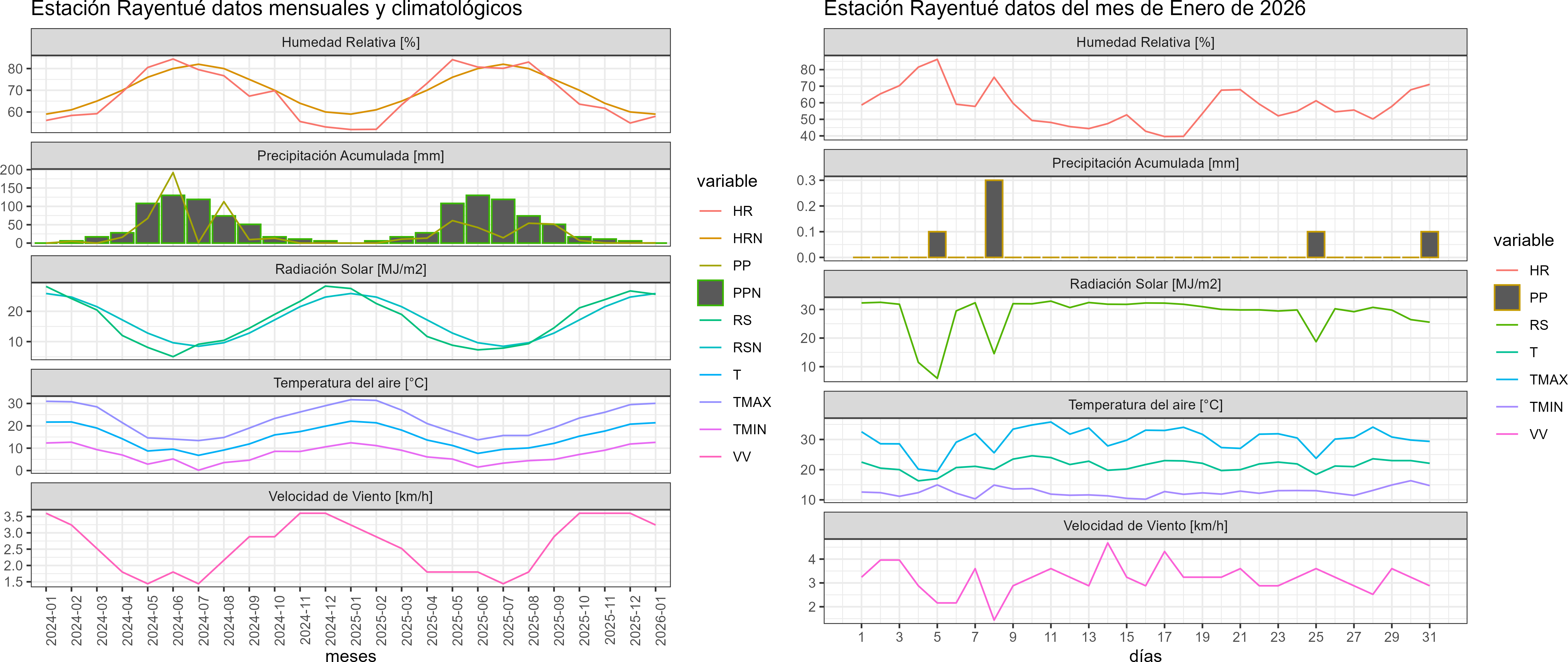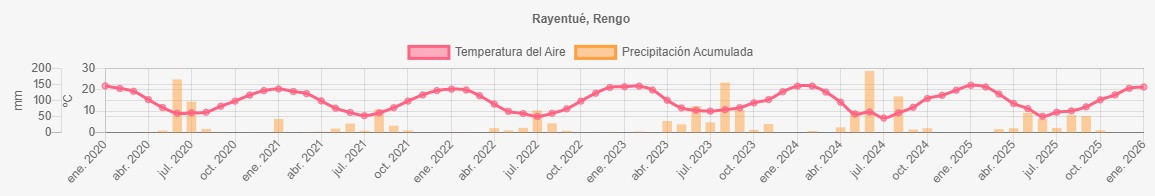 La estación Rayentué corresponde al distrito agroclimático 6-2. Para este distrito climático la temperatura mínima, media y máxima climatológicas alcanzan los 11.7°C, 21.2°C y 30.7°C respectivamente. Por su parte, respecto a las temperaturas medidas durante el mes de enero en la estación: la temperatura mínima alcanzo los 12.6°C (0.9°C sobre la climatológica), la temperatura media 21.4°C (0.2°C sobre la climatológica) y la temperatura máxima llegó a los 30.1°C (-0.6°C bajo la climatológica). En el mes de enero se registró una pluviometría de 0.6 mm, lo cual representa un 20% con respecto al mismo mes de un año normal. De enero a enero se ha registrado un total acumulado de 0.6 mm, en circunstancias que un año normal registraría a la fecha 3 mm, lo que representa un déficit de 80%. A la misma fecha, durante el año 2024 la precipitación alcanzaba los 0 mm.