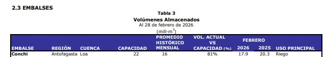 Según la Dirección General de Aguas (DGA), los acuíferos mantienen niveles y fluctuaciones que están dentro de lo normal al igual que el embalse Conchi.