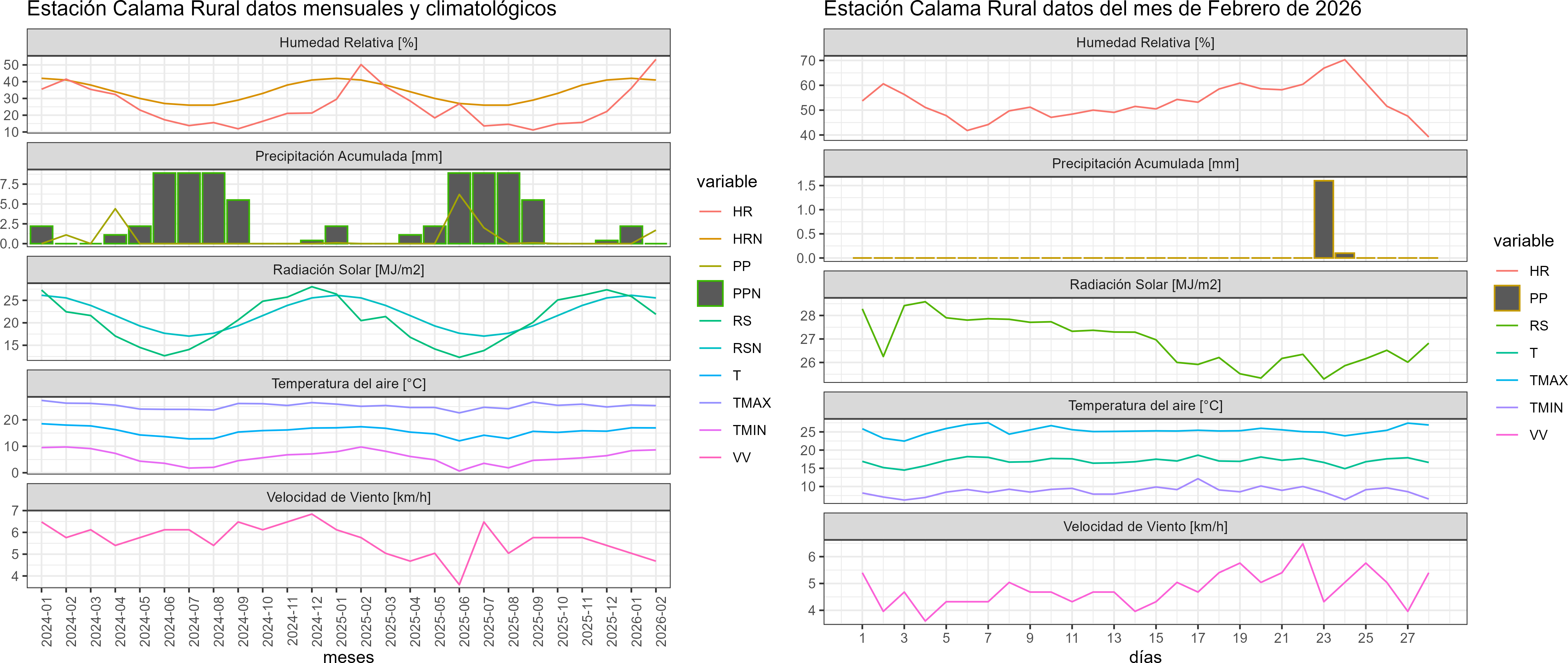 La estación Calama Rural corresponde al distrito agroclimático 15-3-4. Para este distrito climático la temperatura mínima, media y máxima climatológicas alcanzan los 7.7°C, 16.4°C y 25.2°C respectivamente. Por su parte, respecto a las temperaturas medidas durante el mes de febrero en la estación: la temperatura mínima alcanzo los 8.6°C (0.9°C sobre la climatológica), la temperatura media 17°C (0.6°C sobre la climatológica) y la temperatura máxima llegó a los 25.4°C (0.2°C sobre la climatológica). En el mes de febrero se registró una pluviometría de 1.7 mm, lo cual representa un 56.7% con respecto al mismo mes de un año normal. De enero a febrero se ha registrado un total acumulado de 1.7 mm, en circunstancias que un año normal registraría a la fecha 7 mm, lo que representa un déficit de 75.7%. A la misma fecha, durante el año 2024 la precipitación alcanzaba los 0 mm.