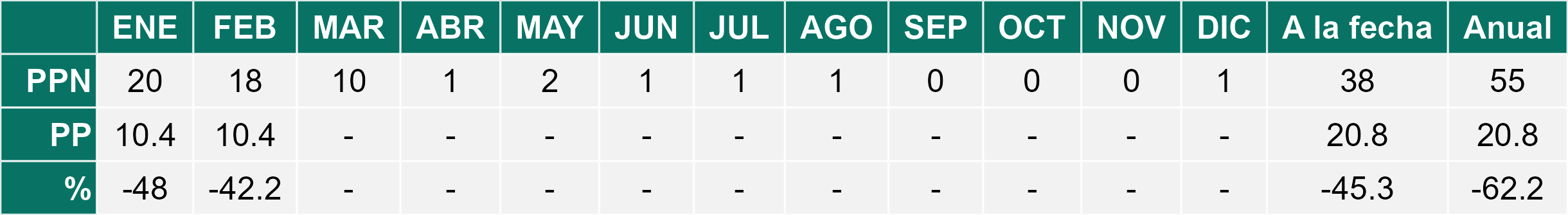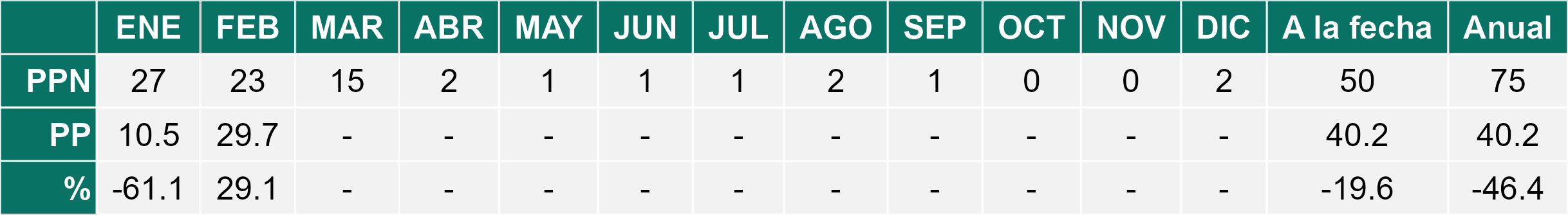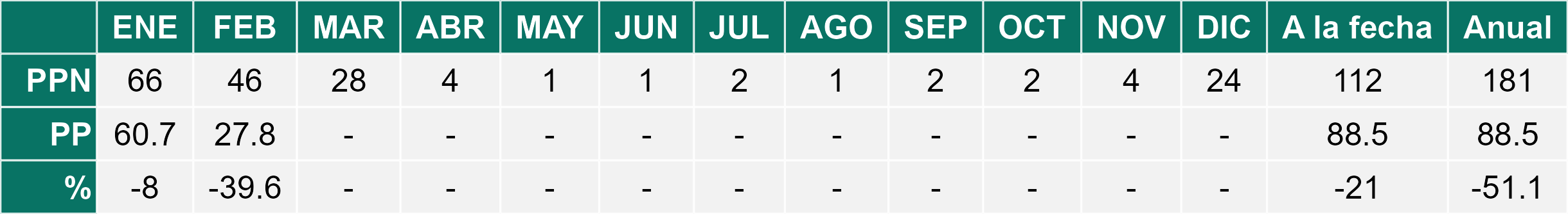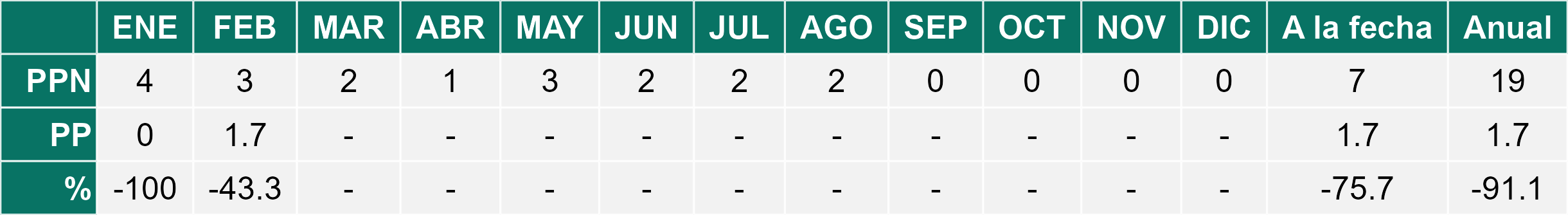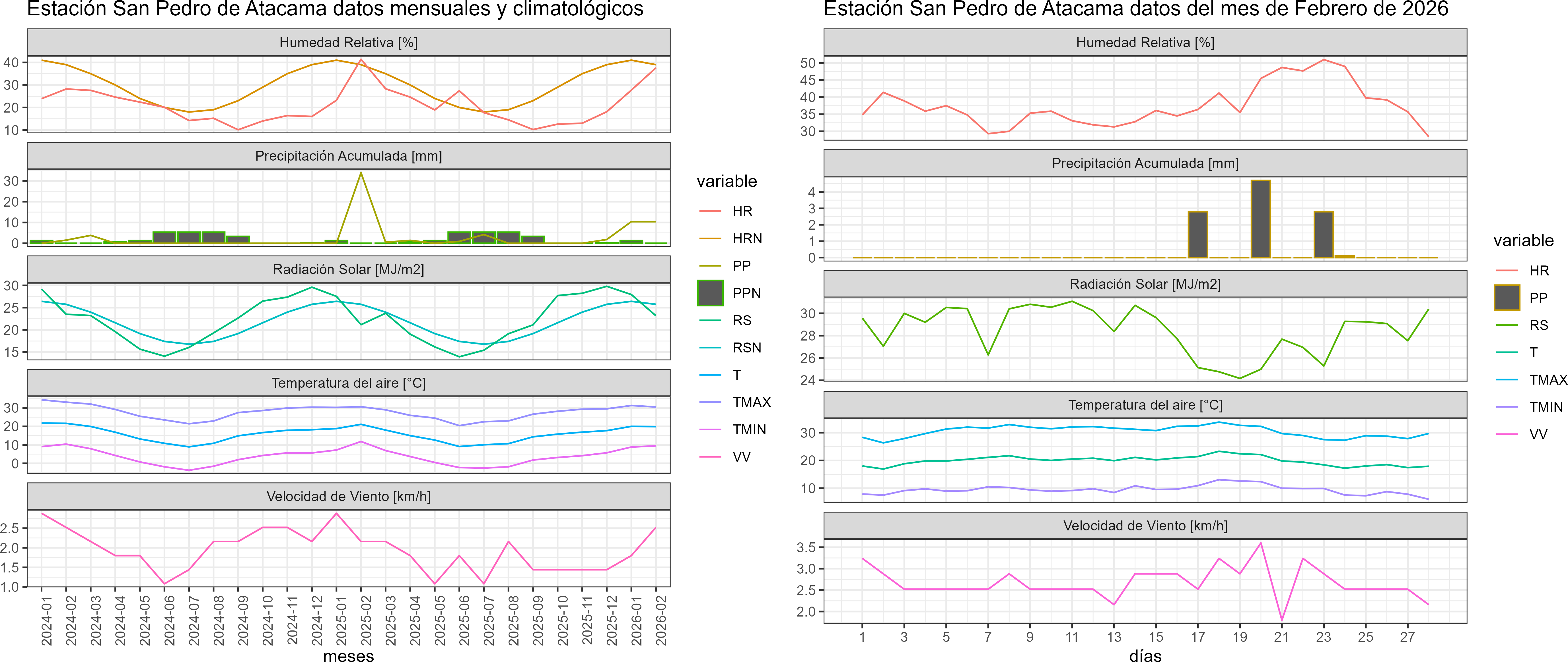 La estación San Pedro de Atacama corresponde al distrito agroclimático 2-1. Para este distrito climático la temperatura mínima, media y máxima climatológicas alcanzan los 10.2°C, 19.4°C y 28.5°C respectivamente. Por su parte, respecto a las temperaturas medidas durante el mes de febrero en la estación: la temperatura mínima alcanzo los 9.4°C (-0.8°C bajo la climatológica), la temperatura media 19.9°C (0.5°C sobre la climatológica) y la temperatura máxima llegó a los 30.5°C (2°C sobre la climatológica). En el mes de febrero se registró una pluviometría de 10.4 mm, lo cual representa un 57.8% con respecto al mismo mes de un año normal. De enero a febrero se ha registrado un total acumulado de 20.8 mm, en circunstancias que un año normal registraría a la fecha 38 mm, lo que representa un déficit de 45.3%. A la misma fecha, durante el año 2024 la precipitación alcanzaba los 33.9 mm.