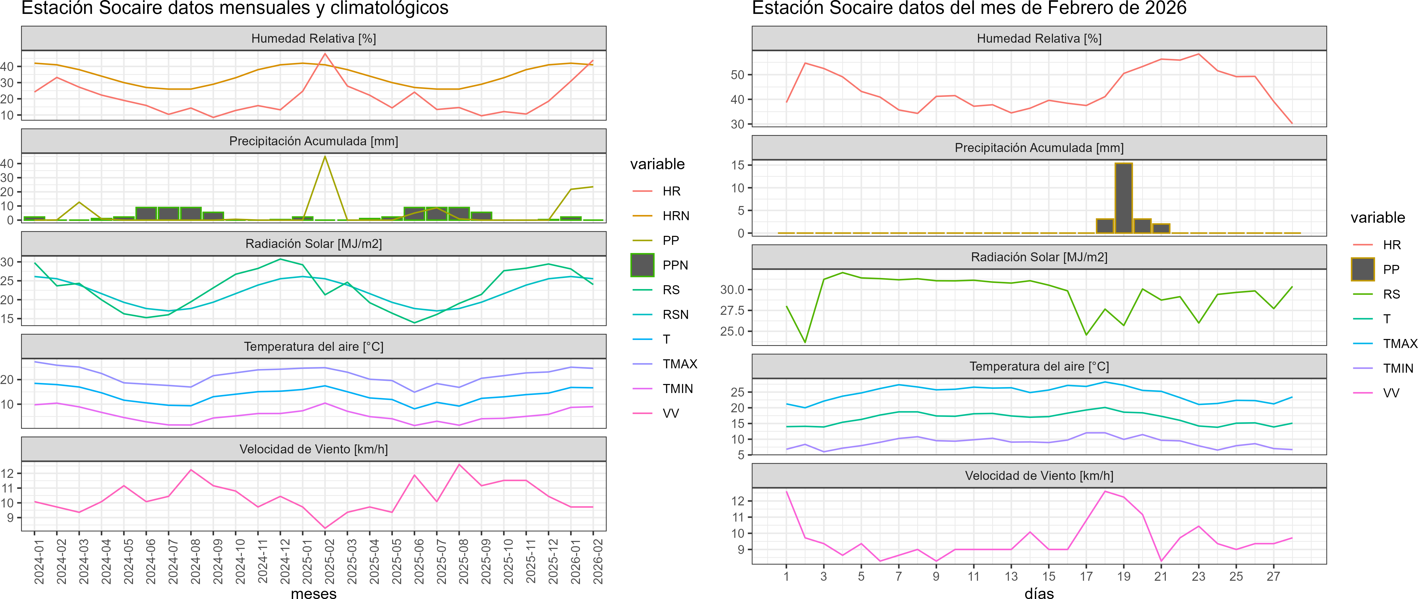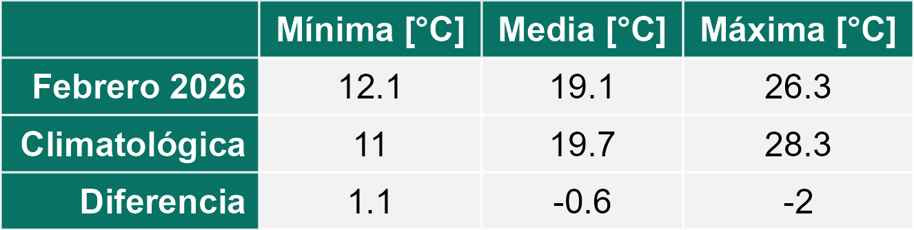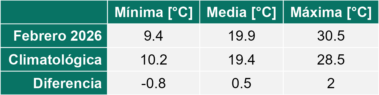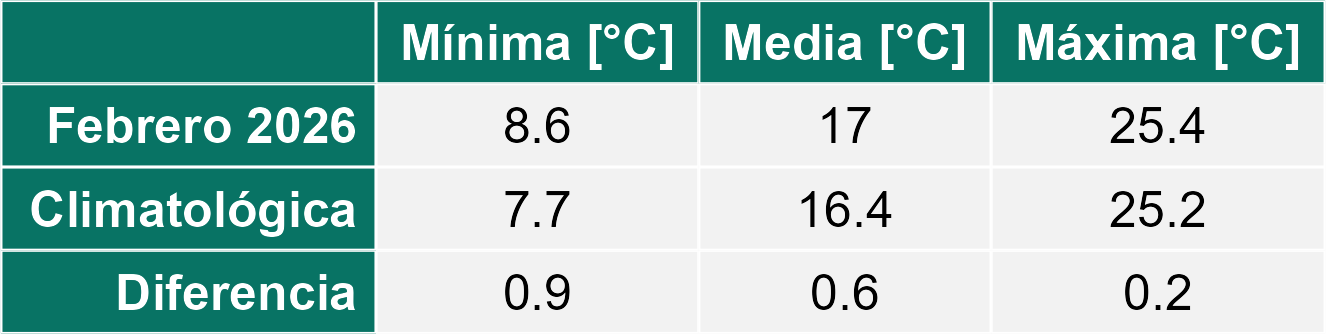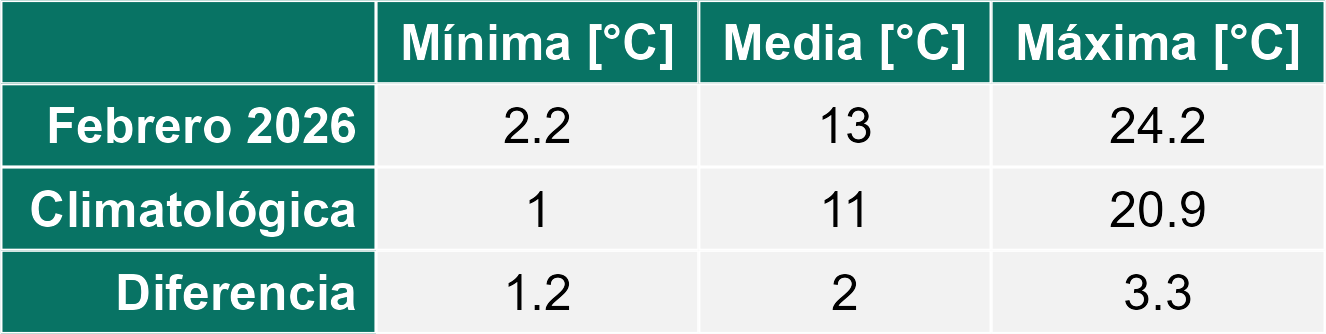 La estación Socaire corresponde al distrito agroclimático 15-3-4. Para este distrito climático la temperatura mínima, media y máxima climatológicas alcanzan los 6.8°C, 13.7°C y 20.7°C respectivamente. Por su parte, respecto a las temperaturas medidas durante el mes de febrero en la estación: la temperatura mínima alcanzo los 9°C (2.2°C sobre la climatológica), la temperatura media 16.7°C (3°C sobre la climatológica) y la temperatura máxima llegó a los 24.6°C (3.9°C sobre la climatológica). En el mes de febrero se registró una pluviometría de 23.6 mm, lo cual representa un 54.9% con respecto al mismo mes de un año normal. De enero a febrero se ha registrado un total acumulado de 45.4 mm, en circunstancias que un año normal registraría a la fecha 88 mm, lo que representa un déficit de 48.4%. A la misma fecha, durante el año 2024 la precipitación alcanzaba los 45.1 mm.