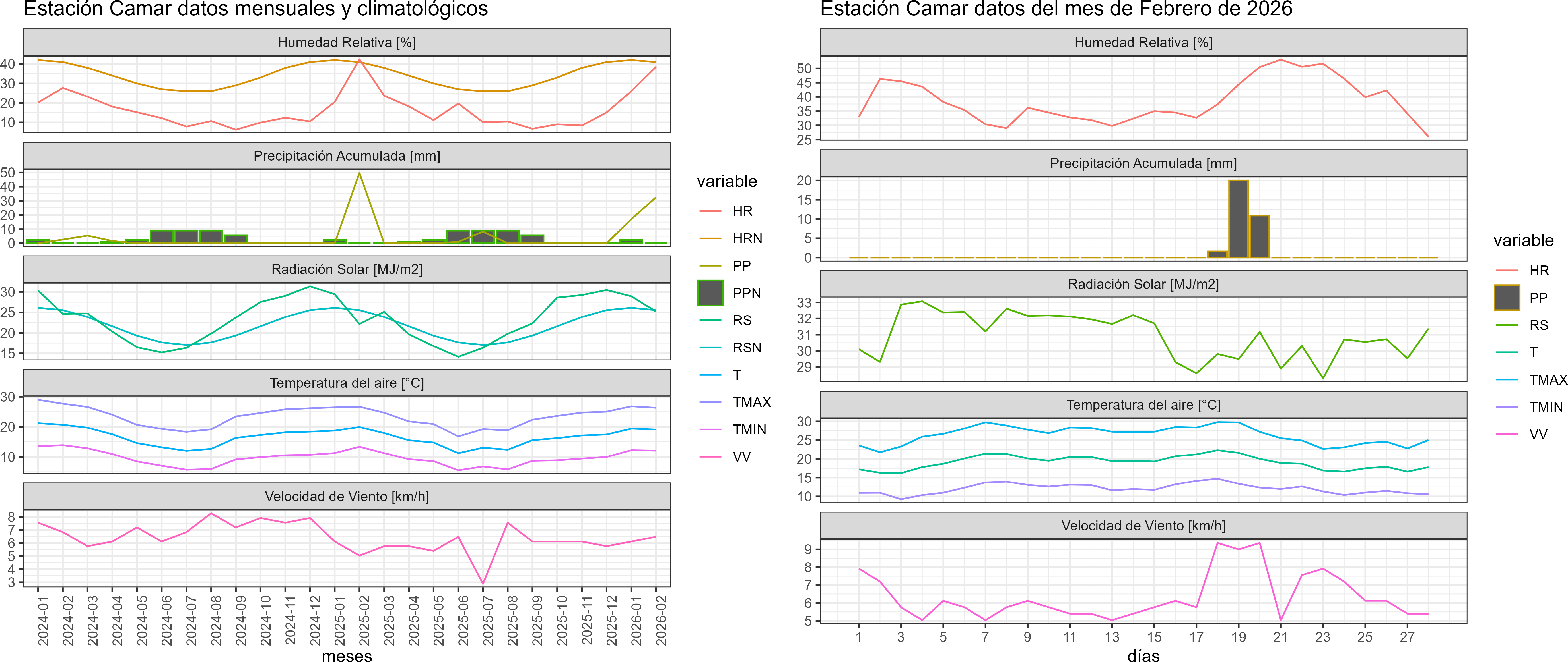 La estación Camar corresponde al distrito agroclimático 15-3-4. Para este distrito climático la temperatura mínima, media y máxima climatológicas alcanzan los 11°C, 19.7°C y 28.3°C respectivamente. Por su parte, respecto a las temperaturas medidas durante el mes de febrero en la estación: la temperatura mínima alcanzo los 12.1°C (1.1°C sobre la climatológica), la temperatura media 19.1°C (-0.6°C bajo la climatológica) y la temperatura máxima llegó a los 26.3°C (-2°C bajo la climatológica). En el mes de febrero se registró una pluviometría de 32.5 mm, lo cual representa un 112.1% con respecto al mismo mes de un año normal. De enero a febrero se ha registrado un total acumulado de 49.5 mm, en circunstancias que un año normal registraría a la fecha 60 mm, lo que representa un déficit de 17.5%. A la misma fecha, durante el año 2024 la precipitación alcanzaba los 49.8 mm.