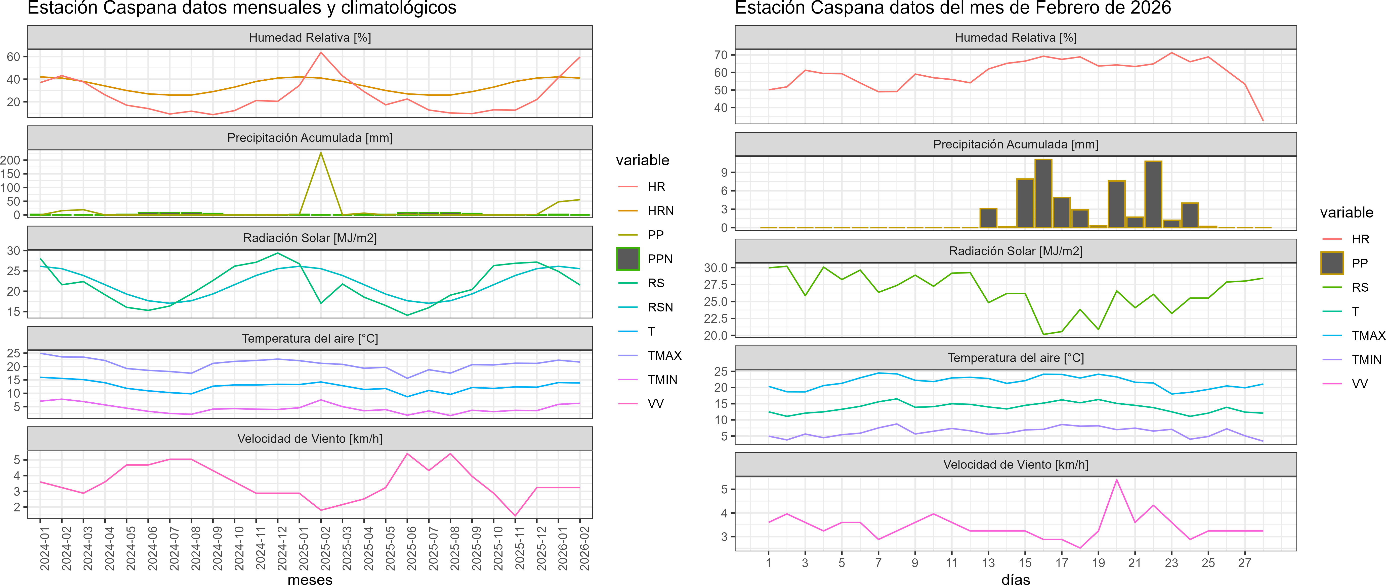 La estación Caspana corresponde al distrito agroclimático 15-3-4. Para este distrito climático la temperatura mínima, media y máxima climatológicas alcanzan los 4°C, 12.6°C y 21.1°C respectivamente. Por su parte, respecto a las temperaturas medidas durante el mes de febrero en la estación: la temperatura mínima alcanzo los 6.3°C (2.3°C sobre la climatológica), la temperatura media 13.9°C (1.3°C sobre la climatológica) y la temperatura máxima llegó a los 21.7°C (0.6°C sobre la climatológica). En el mes de febrero se registró una pluviometría de 55.8 mm, lo cual representa un 136.1% con respecto al mismo mes de un año normal. De enero a febrero se ha registrado un total acumulado de 103.6 mm, en circunstancias que un año normal registraría a la fecha 84 mm, lo que representa un superávit de 23.3%. A la misma fecha, durante el año 2024 la precipitación alcanzaba los 226.9 mm.