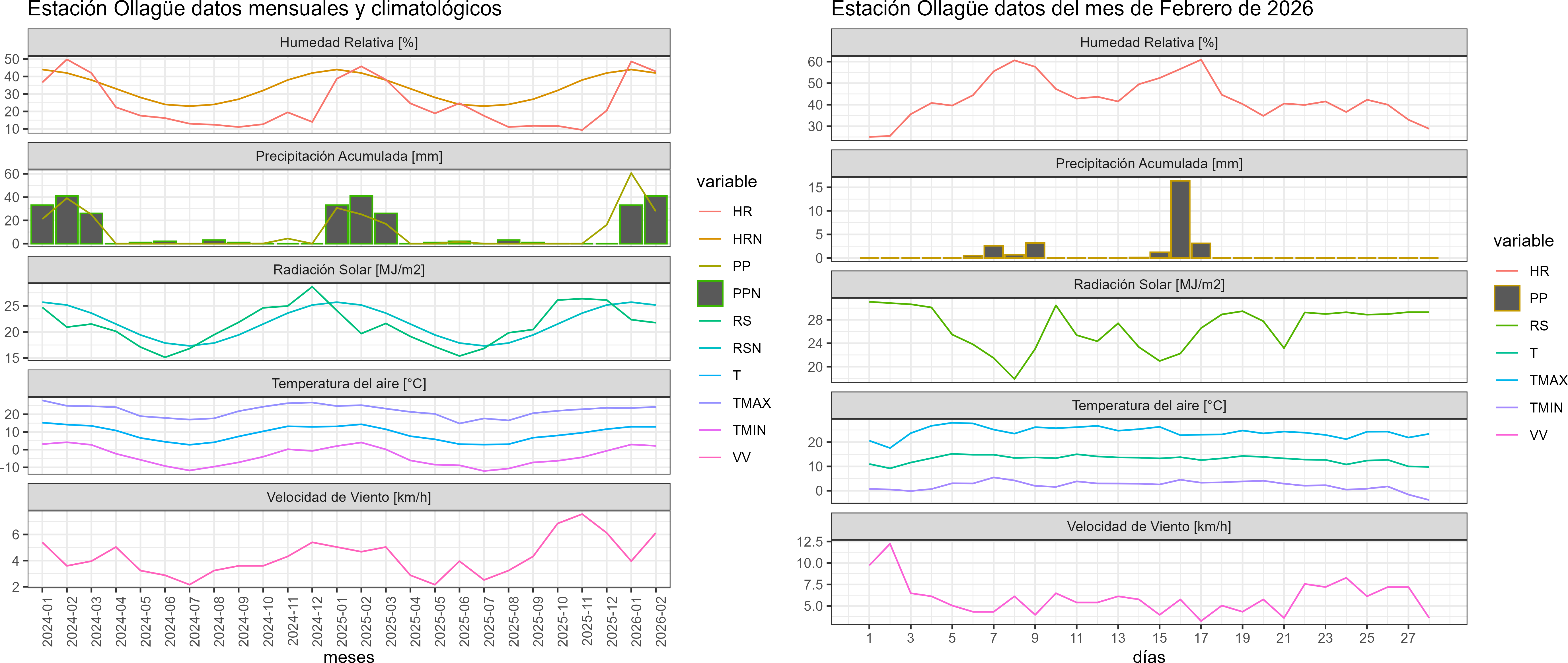 La estación Ollagüe corresponde al distrito agroclimático 15-3-5. Para este distrito climático la temperatura mínima, media y máxima climatológicas alcanzan los 1°C, 11°C y 20.9°C respectivamente. Por su parte, respecto a las temperaturas medidas durante el mes de febrero en la estación: la temperatura mínima alcanzo los 2.2°C (1.2°C sobre la climatológica), la temperatura media 13°C (2°C sobre la climatológica) y la temperatura máxima llegó a los 24.2°C (3.3°C sobre la climatológica). En el mes de febrero se registró una pluviometría de 27.8 mm, lo cual representa un 60.4% con respecto al mismo mes de un año normal. De enero a febrero se ha registrado un total acumulado de 88.5 mm, en circunstancias que un año normal registraría a la fecha 112 mm, lo que representa un déficit de 21%. A la misma fecha, durante el año 2024 la precipitación alcanzaba los 25.2 mm.