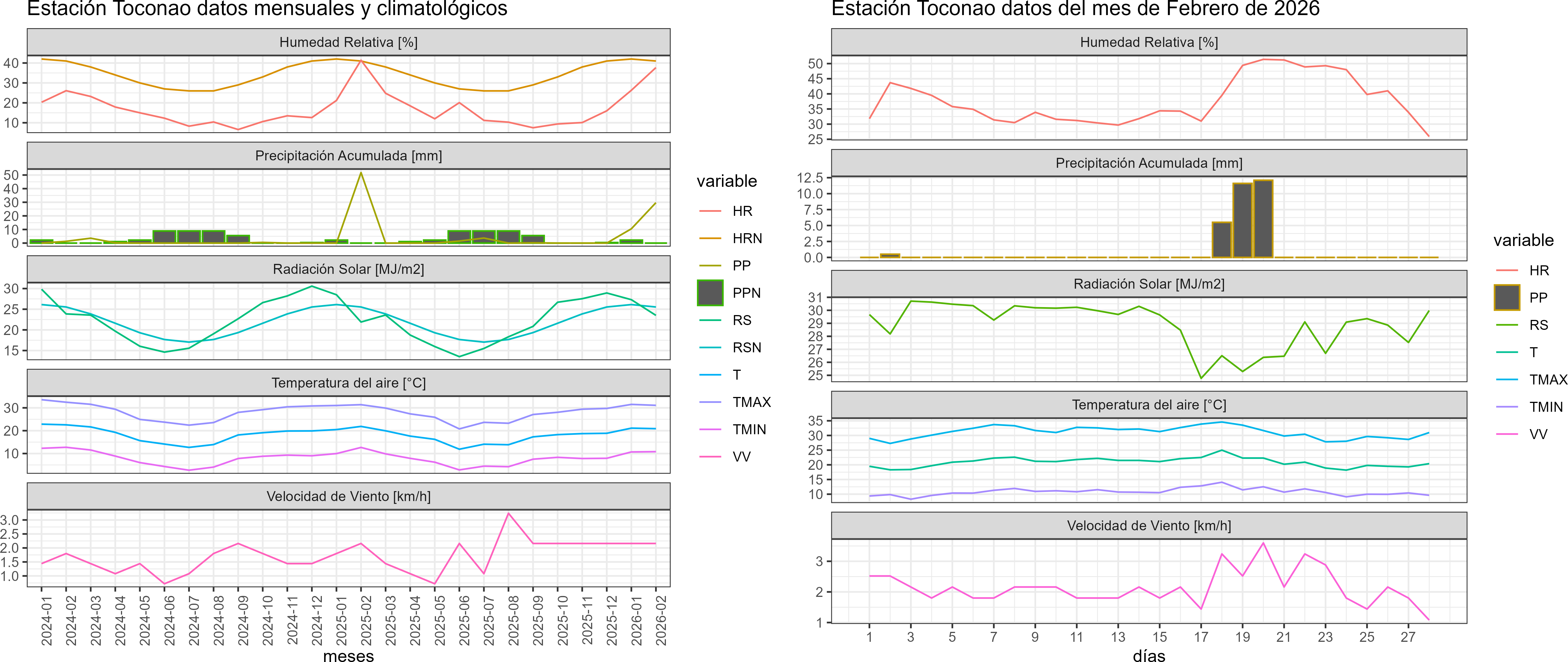La estación Toconao corresponde al distrito agroclimático 15-3-4. Para este distrito climático la temperatura mínima, media y máxima climatológicas alcanzan los 11.1°C, 20.6°C y 30.1°C respectivamente. Por su parte, respecto a las temperaturas medidas durante el mes de febrero en la estación: la temperatura mínima alcanzo los 10.8°C (-0.3°C bajo la climatológica), la temperatura media 20.9°C (0.3°C sobre la climatológica) y la temperatura máxima llegó a los 31.1°C (1°C sobre la climatológica). En el mes de febrero se registró una pluviometría de 29.7 mm, lo cual representa un 129.1% con respecto al mismo mes de un año normal. De enero a febrero se ha registrado un total acumulado de 40.2 mm, en circunstancias que un año normal registraría a la fecha 50 mm, lo que representa un déficit de 19.6%. A la misma fecha, durante el año 2024 la precipitación alcanzaba los 51.8 mm.